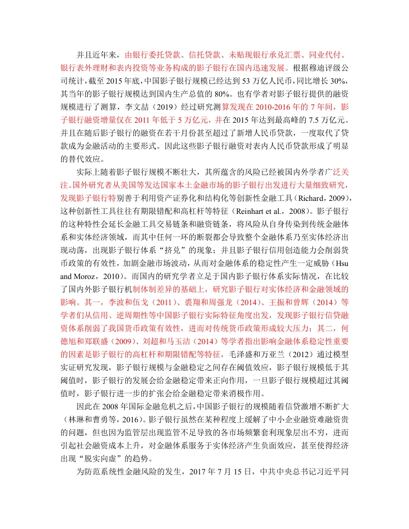 并且近年来,由银行委托贷款、信托贷款、未贴现银行承兑汇票、同业代付、银行表外理财和表内投资等业务构成的影子银行在国内迅速发展。根据穆迪评级公司统计,截至2015年底,中国影子银行规模已经达到53万亿人民币,同比增长30%,其当年的影子银行规模达到国内生产总值的80%。也有学者对影子银行提供的融资规模进行了测算,李文喆(2019)经过研究测算发现在2010-2016年的7年间,影子银行融资增量仅在2011年低于5万亿元,并在2015年达到最高峰的7.5万亿元。并且在随后影子银行的融资在若干月份甚至超过了新增人民币贷款,一度取代了贷款成为金融活动的主要形式。因此这些影子银行融资对表内人民币贷款形成了明显的替代效应。实际上随着影子银行规模不断壮大,其所蕴含的风险已经被国内外学者广泛关注。国外研究者从美国等发达国家本土金融市场的影子银行出发进行大量细致研究,发现影子银行特别善于利用资产证券化和结构化等创新性金融工具(Richard,2009),这种创新性工具往往有期限错配和高杠杆等特征(Reinhart et al.,2008)。影子银行的这种特性会延长金融工具交易链条和融资链条,将风险从自身传染到传统金融体系和实体经济领域,而其中任何一环的断裂都会导致整个金融体系乃至实体经济出现动荡,出现影子银行体系“挤兑”的现象:并且影子银行信用创造能力会削弱货币政策的有效性,加剧金融市场波动,从而对金融体系的稳定性产生一定威胁(H$uand Moroz,2010)。而国内的研究学者立足于国内影子银行体系实际情况,在比较了国内外影子银行机制体制差异的基础上,研究影子银行对实体经济和金融领域的影响。其一,李波和伍戈(2011)、裘翔和周强龙(2014)、王振和曾辉(2014)等学者们从信用、逆周期性等中国影子银行实际特征角度出发,发现影子银行信贷融资体系削弱了我国货币政策有效性,进而对传统货币政策形成较大压力:其二,何德旭和郑联盛(2009)、刘超和马玉洁(2014)等学者指出影响金融体系稳定性重要的因素是影子银行的高杠杆和期限错配等特征,毛泽盛和万亚兰(2012)通过模型实证研究发现,影子银行规模与金融稳定之间存在阈值效应,影子银行规模低于其阈值时,影子银行的发展会给金融稳定带来正向作用,一旦影子银行规模超过其阈值时,影子银行进一步的扩张会给金融稳定带来消极作用。因此在2008年国际金融危机之后,中国影子银行的规模随着信贷激增不断扩大(林琳和曹勇等,2016)。影子银行虽然在某种程度上缓解了中小企业融资难融资贵的问题,但也因为监管层出现监管不足导致的各市场频繁套利现象层出不穷,进而引起社会融资成本上升,对金融体系服务于实体经济产生负面效应,甚至使得经济出现“脱实向虚”的趋势。为防范系统性金融风险的发生,2017年7月15日,中共中央总书记习近平同志在全国金融工作会议中表示,“金融要回归本源,服从服务于经济社会发展。金融应该把为实体经济服务作为出发点和落脚点”。针对影子银行问题,2018年4月27日,中国人民银行联合中国银行保险监督管理委员会、中国证券监督管理委员会以及国家外汇管理局正式发布《关于规范金融机构资产管理业务的指导意见》(以下简称《资管新规》)。资管新规在认定合格投资者、打破刚性兑付、去除资金池运作、解决多层嵌套、抑制通道业务等方面制定了明确要求,提高了影子银行活动的参与门槛,降低了影子银行业务的预期收益,从而降低了企业参与影子银行活动的动机和能力。并且新规的确立也统一了监管标准,从而消除了监管套利的空间,从源头上抑制了影子银行无序扩张的势头。《资管新规》是目前强监管背景下最重量级也是最权威的金融监管政策,金融市场开始步入全方位规范化监管的新时代。其实早在2017年11月,中国人民银行就联合各部委发布《资管新规》的征求意见稿(简称“征求意见稿”),此征求意见稿为接下来规范影子银行发展奠定了基础框架。为了保证政策平稳实施和过渡,各大金融机构已经陆续按照监管机构的要求对资产负债表外的业务进行回表调整,表现为新增影子银行融资规模大幅度缩减,短期人民币贷款占比数据有所上升,但是银行贷款意愿依然不强,社会融资增速规模阶段性放缓。优序融资理论指出,企业依据融资成本的高低顺序选择融资决策,即企业在为项目筹集资金时,优先选择企业内部融资,其次才考虑外部融资:如果需要进行外部融资,企业会首选高等级债务工具,然后才选择低等级债务工具,如可转换债券和可转换优先股,最后才会选择普通股。而我国融资体系主要依靠商业银行等正规金融机构的间接融资,而这些金融机构有严格的信贷审批规则和流程,当中小企业无法从正规金融机构获取信贷资源时,影子银行就成为企业的重要融资渠道(王永钦和刘紫寒等,2015)。但《资管新规》的推出,中小企业原有的影子银行融资途径所受影响较大,甚至有些难以为继,导致我国社会融资体系受较大影响,企业融资困境凸显。在此背景下,本文以《资管新规》的推出为准自然实验情景,考察新规推出后影子银行规模的变化对企业投资行为带来的影响。此问题的研究为《资管新规》这种较新的政策提供了效应验证,而且也为影子银行对企业投资行为的影响提供了微观证据。并且近年来,由银行委托贷款、信托贷款、未贴现银行承