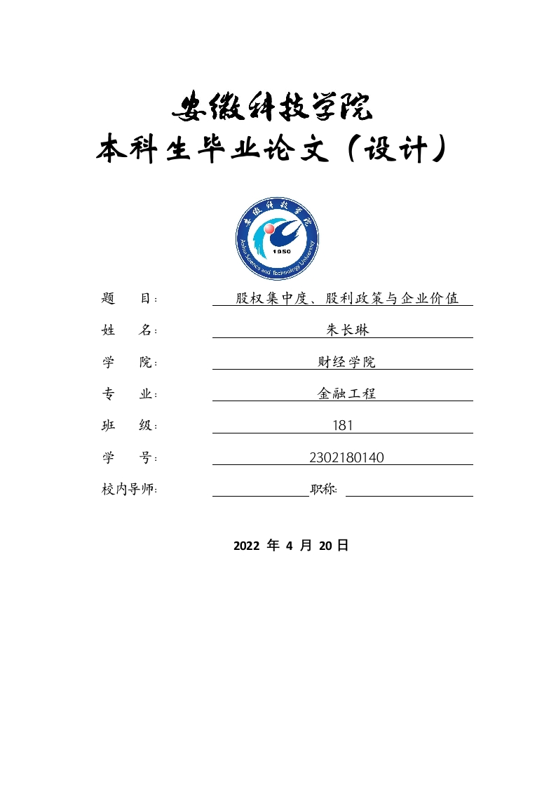 本科生毕业论文(设计)题股权集中度、股利政策与企业价值姓朱长琳学院:财经学院专金融工程班级:181学号:2302180140校内导师:职称2022年4月20日目录英文摘要1引言…41.1研究背景..2研究假设与设计...2.1研究假设的提出672.2.1样本数据分析..2.2.2变量的选择和度量73.1描述性统计.·993.3回归分析结果103.3.1股利政策对企业值的回归分析103.3.2股权集中度的调节效应分析..3.4稳健性检验134研究结论及启示.·.154.1研究结论154.2研究启示及建议154.2.1对企业的建议4.2.2对投资者的建议..4.2.3对监管机构的建议16参考文献股权集中度、股利政策与企业价值摘要:利润积累是企业内部筹资的重要来源,也是企业得以持续发展的基础如何处理利润留存与利润分配之间的关系是企业发展过程中必须面对的问题。股利是对投资者的回馈,其所得与企业经营绩效、盈利及市值有着极为重要的联系,不同的股利政策决定了企业积累在公司与投资者之间的分配方式及资本结构的变化,从而会对公司的投资决策和融资决策带来影响。在所有权与经营权相分离的背景下,是否派发股利及股利派发的多少很大程度上是有大股东决定,大股东的股权集中程度会显著地影响股利政策的效果,进而对企业的价值产生不同的影响,因此,将股利政策、股权集中度和企业价值三者之间结合起来研究具有重要的意义。本文以2010-2020年我国沪深A股为样本,通过数据分析,探讨了企业价值和股利的相关之处,并以数据分析结果为基础,引入了股权集中度的概念,进一步分析了股权集中度作用机制下带来股利政策与企业价值的变化。结合实证研究结果,本文进一步从企业角度、投资者角度以及监管角度提出完善我国上市公司股利政策的相关建议。本次研究成果有利于我国各企业的股利政策调整和完善,对于提升公司价值也具有重要的指导意义。关键词:股利政策、企业价值、股权集中度。