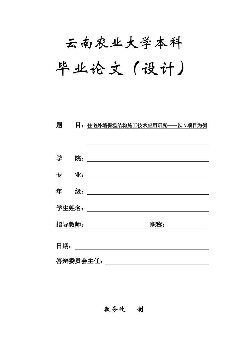 云南农业大学本科毕业论文(设计)题目:住宅外墙保温结构施工技术应用研究一以A项目为例学专年学生姓名:指导教师:职称:日期:答辩委员会主任:教务处制学位论文(设计)原创性声明本人郑重声明:所呈交的论文(设计)是本人在指导教师的指导下独立进行研究所取得的成果。除了文中特别加以标注引用的内容外,本论文(设计)不包括任何其他个人或集体已经发表或撰写的成果作品。本人完全意识到本声明的法律结果由本人承担。作者签名:年月日云南农业大学本科毕业论文(设计)住宅外墙保温结构施工技术应用研究一一以A项目为例摘要:能源问题己成为限制社会可持续发展和保护生态环境的主要因素。我国幅员辽阔,多变的气候和环境加大了建筑节能减排的难度,制约了我国的可持续发展的战略。减少建筑能耗,提高能源利用率,建筑节能迫在眉睫。而外墙保温可有效减少建筑的使用能耗。通过对民用建筑墙体保温节能系统现状分析,发现项目在外墙保温施工、管理与材料应用之间存在诸多问题:根据节能环保和可持续发展的理念,提出应对措施,希望对其它同类项目的外墙保温施工具有一定的借鉴意义。关键词:外墙保温:节能:施工技术:A项目AbstractThe energy problem has become the main factor restricting the sustainable development ofsociety and protecting the ecological environment.China's vast territory,changeable climate andenvironment increase the difficulty of building energy conservation and emission reduction,andrestrict China's sustainable development strategy.It is urgent to reduce building energyconsumption and improve energy utilization.The extemal wall insulation can effectively reducethe energy consumption of buildings.Through the analysis of the current situation of civil buildingwall insulation and energy-saving system,it is found that there are many problems in theconstruction,management and material application of extemal wall insulation;According to theconcept of energy conservation,environmental protection and sustainable development,this paperputs forward countermeasures,hoping to have a certain reference significance for the extemal wallinsulation construction of other similar projects.Key words:exterior wall insulation;Energy saving;Construction technology;Item AYunnan Agricultural University