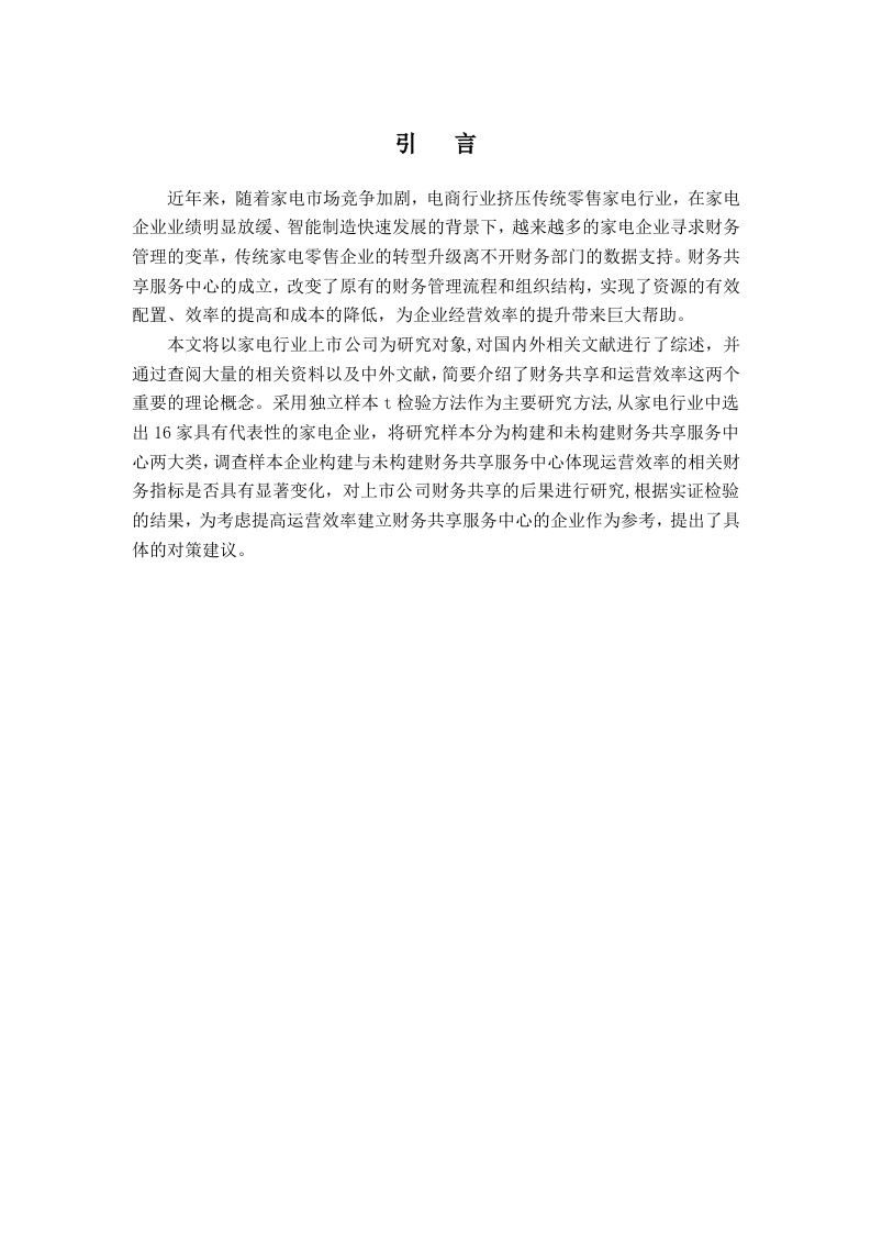 引言近年来,随着家电市场竞争加剧,电商行业挤压传统零售家电行业,在家电企业业绩明显放缓、智能制造快速发展的背景下,越来越多的家电企业寻求财务管理的变革,传统家电零售企业的转型升级离不开财务部门的数据支持。财务共享服务中心的成立,改变了原有的财务管理流程和组织结构,实现了资源的有效配置、效率的提高和成本的降低,为企业经营效率的提升带来巨大帮助。本文将以家电行业上市公司为研究对象,对国内外相关文献进行了综述,并通过查阅大量的相关资料以及中外文献,简要介绍了财务共享和运营效率这两个重要的理论概念。采用独立样本t检验方法作为主要研究方法,从家电行业中选出16家具有代表性的家电企业,将研究样本分为构建和未构建财务共享服务中心两大类,调查样本企业构建与未构建财务共享服务中心体现运营效率的相关财务指标是否具有显著变化,对上市公司财务共享的后果进行研究,根据实证检验的结果,为考虑提高运营效率建立财务共享服务中心的企业作为参考,提出了具体的对策建议。1文献综述与理论基础1.1文献综述1.1.1国外文献综述上个世纪90年代,国外对财务共享服务中心的研究已经开始。Robert Gunn(1993)等人最早提出财务共享的思想,认为财务共享是在分散管理和更小的层级结构中提高企业竞争优势的一种全新的财务管理概念,其核心理念是通过把重复的业务挑选出来,放入一个独立的平台集中处理,企业通过合理分配资源,可以实现降低成本增加效率的效果。Paagman(2015)研究发现,降低成本、提高质量是共享服务的主要动力,构建财务共享服务中心对企业的运营效率有一定程度的提高,帮助企业提高盈利能力,改善财务业绩,减少内部资本支出。Kagelmann(2001)提议设立财务共享中心,目的是利用规模经济使资源合理化,集中繁琐的业务达到效率的提高。1.1.2国内文献综述《2020年中国共享服务领域调研报告》显示,近五年接受调查的企业中,我国有71.28%的公司构建共享服务中心,我国的财务共享服务正处于快速发展阶段。财务共享服务中心的整体运营成熟度为64.37分,整体处于提升期。调查发现,利用机器人流程自动化技术、可视化技术和大数据的企业越来越多,它可以提高业务处理的效率,加强风险管理和控制,保证为客户提供的服务高质量化,决策有效性化。张海浔(2016)提出,财务共享服务中心对会计工作进行分类和改进,节省了人力成本,节约了系统资源,所以公司财务管理的效率有明显的提高。左宪磊(2020)运用数据包络分析方法,从静态和动态两个方面对我国制造业实施财务共享服务的效率进行了评估,实证结果显示,我国大部分制造业企业实施财务共享服务仍处于通过规模扩张提高效率的发展阶段。周奕宇、卞秋睿、宋淑鸿(2020)等人认为,FSSC的建立一方面提高了企业工作效率,另一方面有效降低了企业运营成本。张丽娜(2021)认为,随着经济和科技的高速发展,家电行业在产品研发和成本控制方面面临更多挑战,家电行业通过构建财务共享中心能够对基础会计工作集中处理是企业财务管理水平和效率提高的主要原因,大大推动了企业财务部门财务管理信息化和现代化。陈梦可(2021)通过对海尔集团财务共享的案例研究,发现海尔集团建立财务共享的有效性表现在依托财务共享中心实现对成本数据的信息化控制,有效地降低各项成本指标。结合效率理论,马文莉(2021)认为,建立财务共享服务中心可以减少财务部门业务办理效率低
