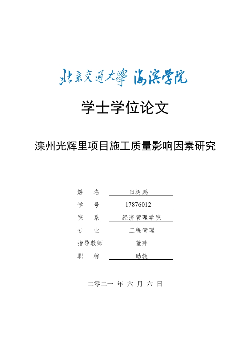 学士学位论文滦州光辉里项目施工质量影响因素研究姓名田树鹏学号17876012院系经济管理学院专业工程管理指导教师董萍职称助教二零二一年六月六日学位论文原创性声明本人所提交的学位论文《滦州市光辉里项目施工质量影响因素研究》,是在导师的指导下,独立进行研究工作所取得的原创性成果。除文中已经注明引用的内容外,本论文不包含任何其他个人或集体已经发表或撰写过的研究成果。对本文的研究做出重要贡献的个人和集体,均已在文中标明。本声明的法律后果由本人承担。论文作者(签名):指导教师确认(签名):2021年5月30日2021年5月30日学位论文版权使用授权书本学位论文作者完全了解北京交通大学海滨学院有权保留并向国家有关部门或机构送交学位论文的复印件和磁盘,允许论文被查阅和借阅。本人授权北京交通大学海滨学院可以将学位论文的全部或部分内容编入有关数据库进行检索,可以采用影印、缩印或其它复制手段保存、汇编学位论文。论文作者(签名):指导教师(签名):2021年5月30日2021年5月30日摘要当今社会的经济加速发展,人们的生活水平提高,房地产建设的快速增长,城市化速度不断加快。这个时候,如何保证施工质量的同时、减少工期并获得最大收益等话题成为热点,保证施工质量的有效性显得非常重要。因为巨大收益和现有施工水平,质量问题也层出不穷。在如今建筑市场上,建筑公司承包项目质量是否达标关系其名誉。由于建筑市场人员变得较大、施工人员能力层次不齐,以及供应商的劣质材料等原因,造成了严重的施工质量问题,严重阻碍了项目正常施工。因此,对施工项目采取有效的质量控制是重中之重。本文重点研究了滦州市光辉里项目施工阶段的质量影响因素。影响项目施工质量的因素主要有人员、材料、设备、工艺方法、气候环境五个方面,使用学过的层次分析法结合该项目实际情况,对该施工项目的全过程进行系统的、全面的、具体的分析。经过分析,总结出滦州市光辉里项目施工过程中存在的各种问题的原因,并根据原因提出所面对问题的解决措施,使施工质量得到改善。关键词:项目:施工质量:影响因素:层次分析法I