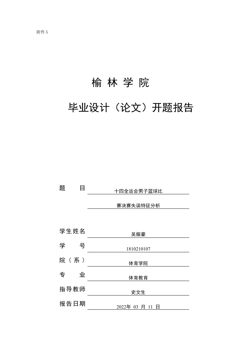 附件5榆林学院毕业设计(论文)开题报告题目十四全运会男子篮球比赛决赛失误特征分析学生姓名吴振豪学号1810210107体育学院专业体育教育指导教师史文生报告日期2022年03月11日毕业设计(论文)题目十四运会男子篮球比赛决赛失误特征分析题目类别(请在有关项目下设计论文其它作√记号)题目需要在实验、实习、工程实践和社会调查等社会实践中完成是口否毕业设计(论文)起止时间2021年11月29日起至2022年5月15日(共24周)毕业设计(论文)开题报告的要求一、论文题目:十四运会男子篮球比赛决赛失误特征分析二、课题研究的目的、依据及意义:研究目的和依据:现代篮球比赛是运动员在特定的时间和空间范围内,受特定规则的制约,攻守双方以争夺球权为焦点,以投篮得分为目标,运用各种攻防技术和两三人之间的协同配合以及全队间整体配合的战术方法,展开时间、空间、体能、技能、心理与智能等全方位的争夺与较量,力争控制攻和守的主动权而获得更多的投篮机会得分取胜。现代的篮球比赛是在高体能、高强度、高对抗、高速度、高技术、高智慧等条件下进行的,这些篮球特征预示着比赛中失误的发生是不可避免的。失误意味着篮球运动中攻守的转换,攻方的无谓失误造成攻方队员由攻转守,方向上的转变意味着队员必须从球场一端跑回另一端,这使得队员浪费了很多的体力在折返跑上,同时失误的出现对队员的心理产生一定的影响,出现追悔、自责的情绪,进而直接影响比赛的结局。比赛场上每失误一次,即意味着失去一次进攻机会,比赛中每支队伍都在想方设法迫使对方出现更多的失误而使本方获得更多的球权,增加进攻得分机会。研究意义:虽然在篮球运动中失误的出现是不可避免的,但有些失误通过努力的训练还是可以减少或者避免的。如何正确的认识比赛中的失误,了解比赛失误存在的形式、导致失误的主要原因进而减少失误次数是我们应该重视的问题。失误的存在不是孤立的现象,而是诸多因素造成的,如何使这些因素的影响降到最低,如何把失误反映出的问题解决是我们研究失误现象的原因之一。本文通过对第十四届全运会男篮决赛中攻防两端失误状况的研究,进而找出十四运会男篮进攻失误存在的主要特征和导致进攻失误的主要原因,为两个俱乐部在今后的国内外比赛中减少进攻失误、提高技战术水平提供依据。三、本文研究的内容:1十四运会男子篮球决赛中的失误情况对比分析2失误类型的对比分析3每节比赛失误与得分的对比分析4主力与替补间发生失误的对比分析5不同位置球员发生失误的对比分析6比赛中失误与得分转化的对比分析四、论文提纲:1.绪论2.文献综述2.1篮球失误对于比赛的重要性研究2.2篮球比赛失误原因的调查研究3.研究对象与研究方法3.1研究对象3.2研究方法3.2.1文献资料法3.2.2比赛录像观察法3.2.3数理统计法3.2.4逻辑分析法4.结果与分析5.结论与建议五、完成方案及进度计划:(一)2021年11月29日至2021年12月27日,选题、确定论文题目、下达《毕业论文任务书》。(二)2021年12月28日至2022年03月11日,开题准备、完成开题报告。(三)2022年03月15日至2022年5月15日,论文撰写、修改、定稿、打印。(四)2022年05月,论文答辩。六、主要参考文献: