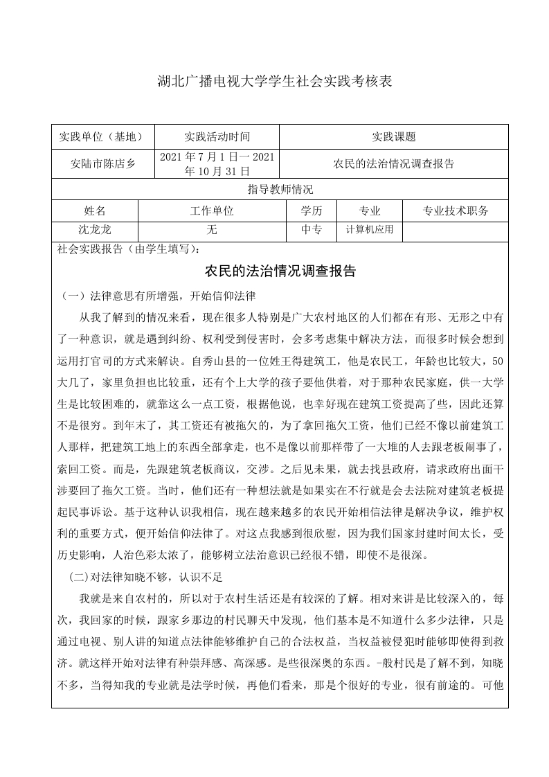 湖北广播电视大学学生社会实践考核表实践单位(基地)实践活动时间实践课题安陆市陈店乡2021年7月1日一2021农民的法治情况调查报告年10月31日指导教师情况姓名工作单位学历专业专业技术职务沈龙龙无中专计算机应用社会实践报告(由学生填写):农民的法治情况调查报告(一)法律意思有所增强,开始信仰法律从我了解到的情况来看,现在很多人特别是广大农村地区的人们都在有形、无形之中有了一种意识,就是遇到纠纷、权利受到侵害时,会多考虑集中解决方法,而很多时候会想到运用打官司的方式来解诀。自秀山县的一位姓王得建筑工,他是农民工,年龄也比较大,50大几了,家里负担也比较重,还有个上大学的孩子要他供着,对于那种农民家庭,供一大学生是比较困难的,就靠这么一点工资,根据他说,也幸好现在建筑工资提高了些,因此还算不是很穷。到年末了,其工资还有被拖欠的,为了拿回拖欠工资,他们已经不像以前建筑工人那样,把建筑工地上的东西全部拿走,也不是像以前那样带了一大堆的人去跟老板闹事了,索回工资。而是,先跟建筑老板商议,交涉。之后见未果,就去找县政府,请求政府出面干涉要回了拖欠工资。当时,他们还有一种想法就是如果实在不行就是会去法院对建筑老板提起民事诉讼。基于这种认识我相信,现在越来越多的农民开始相信法律是解决争议,维护权利的重要方式,便开始信仰法律了。对这点我感到很欣慰,因为我们国家封建时间太长,受历史影响,人治色彩太浓了,能够树立法治意识已经很不错,即使不是很深。(二)对法律知晓不够,认识不足我就是来自农村的,所以对于农村生活还是有较深的了解。相对来讲是比较深入的,每次,我回家的时候,跟家乡那边的村民聊天中发现,他们基本是不知道什么多少法律,只是通过电视、别人讲的知道点法律能够维护自己的合法权益,当权益被侵犯时能够即使得到救济。就这样开始对法律有种崇拜感、高深感。是些很深奥的东西。一般村民是了解不到,知晓不多,当得知我的专业就是法学时候,再他们看来,那是个很好的专业,很有前途的。可他们并不清楚,法律其实就是调整社会普遍生活中所产生的社会关系的规范。就是与他们生活有关,也是从他们的生活中抽象出来的用于指导以后的社会生活。而且,他们有很多人对法律的看法也很偏激,认为法律只是给有钱、有权势的人准备的,总结起来就是为有地位的人准备的,一般的农民根本就得不到什么好处,只要有钱,也只要给钱,就会有相对轻的结果,就能赢得官司,平头老百姓因为既没钱也没有地位,所以总是吃的哑巴亏,这种看法对法律追求的公平、正义的目标是中曲解,对法律认识不到位,这样对法制建设产生影响,偏离正常法治轨道,对我国深入实施依法治国产生不良影响。(三)运用法律解诀纠纷较少基层人民,特别是广大农民虽然对法律有了一些了解,也知晓了一些法律知识,也稍微增强了法治意识。但是,真正会运用法律途径来解决的纠纷、维护自己的被侵之权的人很少,假期我去人民医院看望我一个以交通事故而造成右腿骨折的舅舅,在那骨科住院部,从其他病人中了解到,他们很多人是因为交通事故而造成的骨折。且有些家属也遇到这种情况,当我得知他们很多人为了要求行为人支付医疗费,很多要么就是通过联合亲戚朋友,强制威胁行为人赔偿,妖媚就是与行为人私下协商,或者有些怕事的根本就是自己全部支付所有费用。虽然,我国法律并没有禁止私下解诀,即私了。私了,地区解诀起来更迅速,但是,这样的话容易引起打击报复,相互之间,由于威胁或者忍气吞声都容易引起一方的心里不平衡,容易引发之后一系列的不良潜在的影响,而且,私了,赔偿的数额很多要么具有敲诈性,要么就是让受害人受损。尽管如此,他们还是不愿意让国家机关,特别是司法机关干涉。(四)农民提起的诉讼少我去秀山县人民法院了解到,现在法院受理的案件虽然在增多,特别是,民事案件增多,这说明人民越来越接受司法解决争议,人民的法律意识得到了增强。后来我才发现那些提起诉讼的原告很少有农民的,听法院内部人说就民事案件,农民提起诉讼比例不足民事诉讼的10%,基本都是些企业、单位、其他组织以及一些收入相对较高的县城居民。这也说明了,农民中的法治建设还有很长一段路要走。(五)弄明对运用法律解诀争议心存恐惧经过多年的法治建设,广大农民虽然意识到了,可以运用法律途径来解诀争议,但是,在他们心中人仍就认为法律并不是煮好的途径,因为在他们看来,打官司容易引起对方的打击报复。因为在我们农民心中,一向喜欢得到心理上的平衡,也不管其他后果,所以特别是在对方或者对方的亲戚朋友,有些权势,会利用聚集众人暴力威胁,那势必对今后的生活引起不良影响。特别是现在咱门中国的党、政干部,由于其受严格监督,极易滥用自己手中的权力。以权谋私,到处鱼肉农民。同时还有个问题就是,当广大农民与政府有关部门闹矛盾,那么,农民处于弱势地位,而政府及相关部门又有-定的地方立法权,加上执法者的身份,那就是很强势了。可以通过给农民办理各种事情通过拖延,敲诈勒索等各种方式来对其进行打击报复,因为就与农民关系密切的还是政府,从出生到死亡都是离不开的,也正是在此,即使当时通过法律维护了权利,但是在以后就不好办了。会惹上更多
