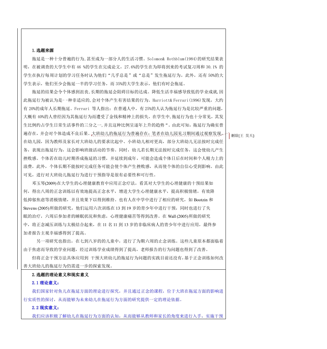 1.选题来源拖延是一种十分普遍的行为,甚至成为一部分人的生活习惯。Solomon&Rothblum(1984)的研究结果表明,在被调查的大学生中有46%的学生在完成论文,27.6%的学生在为即将到来的考试复习周和30.1%的学生在执行每周计划的学习任务时认为他们“几乎总是”或“总是”发生拖延行为,此外,还有50%的大学生表示,他们至少会拖延一半的学习任务,而35%的大学生表示,他们有时会拖延。拖延的结果会令个体感到沮丧,长期的拖延会阻碍目标的达成、降低生活幸福感导致低的学业成就,因此拖延行为被认为是-一种非适应的,会对个体产生有害结果的行为。Harriotte&Ferrari(1996)发现,大约有20%的成年人长期拖延。Ferrari等人指出:在普通人中,有25%的人认为拖延行为是比较严重的问题,大概有40%的人曾经因为其拖延行为而遭受了金钱和精神上的损失,在学生中,拖延行为也十分常见,其发生比例约占学生日常生活事件的三分之一,并且这种比例呈逐年上升的趋势“。由此可知,拖延行为确实普遍存在,并会对个体造成不良后果。大班幼儿的拖延行为普遍存在:笔者在幼儿园见习期间通过观察发现在幼儿园,因为教师及家长对大班幼儿的要求比起中、小班幼儿相对更高,部分大班幼儿无法按时完成任务,表现出拖延行为,这会影响班级活动的节奏。同时,幼儿若长期无法按时完成任务,这会使幼儿产生挫败感。个体若在幼儿时期养成拖延的习惯,并延续到成年,可能会造成个体日后在时间和个人精力上的浪费,此外,个体长期不能按时完成任务可能会使个体产生挫败感,从而使个体的自信心受到影响。由此可见,进行对大班幼儿拖延行为进行干预指导是很有必要性和可行性。邓玉琴(2009)在大学生的心理健康教育中应用正念疗法,看其对大学生的心理健康的十预结果如何,得出八周的正念训练以有效地提高正念水平,增进大学生心理健康水平,提高积极情绪,有效降低抑郁焦虑等消极情绪,并且效果下以得到维持。也有人在中学中进行了相应的研究,如Bootzin和Stevens(2005)所做的研究,他们运用六次训练在l3到19岁的青少年中进行干预,同时也进行了失眠的治疗,六周后参加者的睡眠状况和焦虑,心理健康痛苦等得到改善。在Wl(2005)所做的研究中,将正念减压训练与太极结合起来,在11名11到13岁的非临床病人的青少年中进行应用,最终参加者报告主观幸福感得到了提高。另一项研究也指出,在七到八岁的的儿童中,进行了为期六周的止念训练。这些儿童原本都面临着由于焦虑而导致的学业问题,经过训练学业成绩得到了提高,老师报告的行为问题也得到了改善。但将正念干预方法具体应用到干预大班幼儿的拖延行为问题的实践目前还没有,基于正念训练如何改善大班幼儿的拖延行为仍需进一步的探索发现。2.选题的理论意义和现实意义2.1理论意义:我们国家针对鱼儿在拖延方面的理论进行探究,并且通过正念的课程,位于大班在拖延方面的影响进行实质性的探讨,从而能够为未来幼儿在拖延行为方面的研究提供一定的理论依据。2.2现实意义:我们应该积极了解幼儿在拖延行为方面的认知,从而能够从教师和家长的角度来进行入手,实施干预手段,为他们在成长的道路上奠定更好的基础,在本次研究的过程当中,就与正念训练进行结合,从而发挥集中所产生的效果来,对他们个人的身心健康进行提升。在本次研究的过程当中,我们通过与正念训练进行结合,能够足够证明正念训练对于整体的治疗效果具有一定的优势,并且也能够提高每一名学生的身心健康。3.国内外研究现状3.1正念训练的相关研究3.1.1正念训练的概念经过国内外学者几十年的深入研究,正念己经是一个不断发展,内涵丰富的概念。例如,它可以被看作是一种集中注意力的方法,也可以被看作是一种包含自我意识的对此时此刻的觉知或一系列与自我调节、元认知和接纳相关的心理过程。除此之外,正念还可以被认为是一种心理状态或心理特质。所谓状态正念是指在正念过程中产生的改变了的感觉、认知和自我参照意识。特质正念则是练习者在这些方面得到了的持久性的改变。为了获得这种状态或特质,个体需要进行正念训练(Mindfulness Training,MT。正念训练既包括许多心理技法,诸如冥想、身体扫描、行禅、正念呼吸等方法,又包括许多流派的学者开发出的行为疗法。不同流派的行为疗法也要借助心理技法来完成。本文作者赞同使用卡巴金(J.Kabat-Zinn)对正念的解释。这是一种精神训练方式,在这种精神训练过程中,强调的是以下三点:有意识地去觉察、将注意力集中于当下并对当下的所有都不作出任何评价。3.1.2正念训练的练习方法他正念水平方面的培养汤,具有非正式的正念练习以及正式的正面练习和闭关,并且基本的坐姿操作方法也是能够选取一把直背椅子坐好,然后保持后背直立,从而进行坐姿的调整,这些姿势都能够有利于在整体的训练过程当中保证更好的渠道来保证一定的治疗效果。1非正式的正念练习非正式的正念练习,就要求对应的练习者在练习的过程当中,应该时时刻刻观察当下的周围一切事物,并且能够在跑步的过程当中感受到脚步和接触当中的感受,在吃东西的过程当中,也能够察觉出食物的味道,在洗碗时也可以感受到双手在进行洗碗时的感受,能够将各个意识进行保持。2正式的正念练习通过正式的正念练习,对于练习者来讲,应