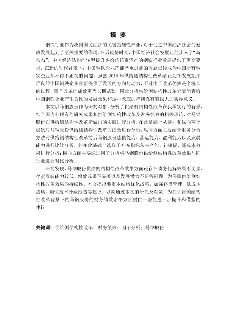 摘要钢铁行业作为我国国民经济的关键基础性产业,对于促进中国经济社会的健康发展起到了至关重要的作用。在后疫情时期,中国经济社会发展已经步入了“新常态”,中国经济结构的转型提升也给传统重资产的钢铁行业发展提出了更高要求。在新的时代背景下,中国钢铁企业产能严重过剩的问题已经成为中国所有钢铁企业都不得不正视的问题。虽然2015年供给侧结构性改革给正处在发展瓶颈阶段的中国钢铁企业重新提供了发展的方向与动力,不过由于改革仍然是个漫长的过程,而且改革的成效更需长期试验,因此分析供给侧结构性改革究竟能否给中国钢铁企业产生良性的发展效果和这种效应的持续性有着很大的实际意义。本文以马钢股份作为研究对象,分析了供给侧结构性改革在我国实行的背景,结合国内外现有的研究成果和供给侧结构性改革及财务绩效的相关理论,对马钢股份在供给侧结构性改革所做出的实践进行分析,在此基础上从横向和纵向两个层次对马钢股份供给侧结构性改革的绩效进行分析。纵向方面主要结合财务分析方法对供给侧结构性改革前后马钢股份偿债能力、营运能力、盈利能力以及发展能力进行比较分析,并在此基础上选取了补充指标从去产能、补短板、降成本效果进行分析:横向方面主要通过因子分析将马钢股份供给侧结构性改革效果与同行业进行对比分析。研究发现,马钢股份供给侧结构性改革效果方面还存在债务化解效果不明显、存货周转能力较低、增效成果不显著以及发展潜力不足等问题。为保障供给侧结构性改革效果的持续性,本文提出要资本结构优化战略,加强存货管理,低成本战略,加快技术升级改造等建议。以期通过本文的研究及对策,为在供给侧结构性改革背景下的马钢股份的财务绩效水平方面提供一些能进一步提升和借鉴的建议。关键词:供给侧结构性改革:财务绩效:因子分析:马钢股份第1章绪论1.1研究目的及意义1.1.1研究目的中国经济社会发展已经步入了“新常态”,就钢铁行业为代表而言的低水平竞争激烈、企业效益下滑严重的问题十分明显,具体体现在低端产品产能过剩严重、高端产品供给短缺、产能利用率较低以及缺乏技术创新的能力等。针对这些发展过程中出现的问题,2015年底,习总书记提出“供给侧结构性改革”,主要强调在适度扩大总需求的同时进一步优化供给端,从总体提升供给的水平和质量,增强经济的韧性,推动中国经济向高质量迈进。2016年,中央提出供给侧结构性改革,改革的主要任务为“三去一降一补”,分别为去产能、去库存、去杠杆、降成本、补短板。对于中国钢铁企业来说供给侧结构性改革对我国钢铁行业既是挑战也是机遇,各钢铁企业需要紧紧围绕着改革的主要任务来清除低效、无效的产能,调整长期性结构,提高供给的质量,使得供给端与需求端相匹配,进而推动我国钢铁行业的健康良好发展。在供给侧结构性改革的背景下,钢铁行业采取了哪些措施来走出产能过剩、高端质量供给缺乏等困境,在财务绩效方面有哪些变化和成果,这些值得深入研究与探讨。因此,本文通过对供给侧结构性改革前后马钢股份的财务绩效采取对比分析方式来发现供给侧结构性改革所带来的影响。本文以供给侧结构性改革为背景并且以财务绩效相关理论为基础,以马钢股份为研究对象,探究马钢股份供给侧结构性改革举措及实施效果,分析马钢股份供给侧结构性改革进行后存在的问题,并提出相关的对策建议,以期进一步提升马钢股份的财务绩效水平。1.1.2研究意义(1)理论意义从现有的国内外研究成果可以发现,对于供给侧结构性改革问题的研究,大多数研究主要关注钢铁行业的去产能及战略转型问题,对改革财务绩效的关注也多集中在钢铁行业财务管理、成本管理以及环境绩效、社会责任问题,少有学者研究供给侧结构性改革对钢铁行业财务绩效带来的影响。本文将供给侧结构性改革以及中国经济社会“新常态”的大背景结合起来,以马钢股份为对象,通过对比分析其在改革前后财务绩效的变化,探究其改革效果,以补充现有研究。(2)实践意义供给侧结构性改革的实施为钢铁行业的发展带来了新的活力,帮助该行业清理低效、剩余的产能,降低产品库存量,推动钢铁行业的转型升级,催生更多的高效率、低耗能、低污染的企业。改革是一个长期的过程,改革带来的效应需要时间来验证,如何验证改革带来的成效是实务中必须面对的问题之一。本文在传统财务分析方法的基础上引入因子分析方法来综合起来分析,在横向层面和纵向层面两个分析角度来比较了供给侧结构性改革前后马钢股份财务绩效的变化情况,对分析供给侧结构性改革财务绩效上具有重要的参考意义。1.2国内外研究现状1.2.1关于供给侧改革的研究有关供给侧改革的研究,James十九世纪初提出了萨伊市场定律,他认为市场需求情况可以由供给情况来决定。George Gi1der(1985)认为资本主义的观念是先有供给,供给是经济的重点,由供给来满足需求m。Feldstein(1986)提出了著名的“费尔德斯坦曲线”模型,该模型是对供给学派相关理论的延伸,其认为政府应该让市场充分发挥自身的调节功能而不要过度干预。随后,Nige1Hea1ey(1994)通过研究1900-1970年期间英国政府施行的为解决经济问题的政策,这些政策大多从供给层面上来考虑,说明从供给层面