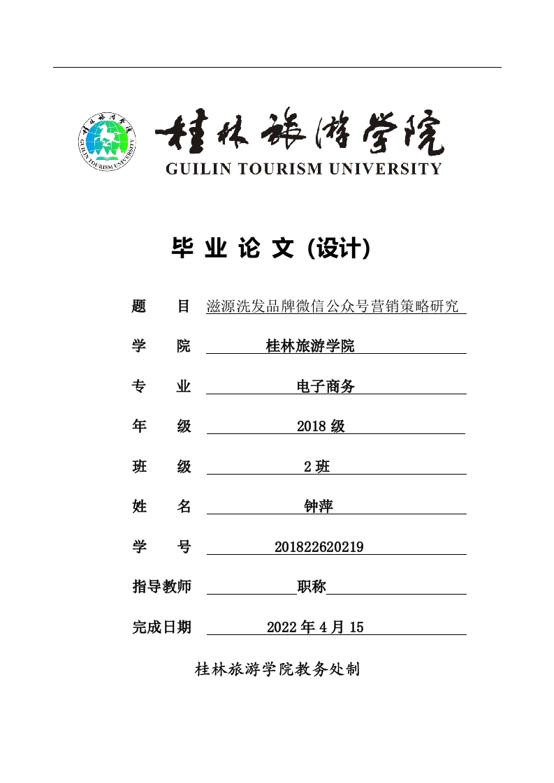 GUILIN TOURISM UNIVERSITY毕业论文(设计)题滋源洗发品牌微信公众号营销策略研究学院桂林旅游学院专业电子商务年级2018级班级2班名钟萍学号201822620219指导教师职称完成日期2022年4月15桂林旅游学院教务处制桂林旅游学院2022届毕业论文桂林旅游学院学位论文原创性声明本人郑重声明:本人所呈交的学位论文《滋源洗发品牌微信公众号营销策略研究》,是本人在导师的指导下独立完成的研究成果。除文中己经注明引用的内容外,本文不包含法律意义上己属于他人的任何形式的研究成果,对论文的完成提供过帮助的有关人员均己在文中说明并致以谢意。本人所呈交的学位论文没有违反学术道德和学术规范,没有侵权行为,并愿意承担由此而产生的法律责任和法律后果。学位论文作者签名:日期:年月日学位论文使用授权的声明本人完全了解桂林旅游学院有关保留和使用学位论文的规定,学校有权保留和向有关部门或机构送交本论文的复印件和电子版,允许论文被查阅和借阅。学校可以将本学位论文的全部或部分内容编入有关数据库,可以采用影印、缩印或其它复印手段保存和汇编本学位论文。保密论文在解密后适用本声明。论文作者签名:论文导师签名:日期:年月日桂林旅游学院2022届华业论文滋源洗发品牌微信公众号营销策略研究专业:电子商务学号:201822620219姓名:钟萍摘要:截止目前微信注册用户超10亿,月活跃用户超12亿人次,利用微信营销可以快速使目标客户群体了解企业的产品。广州环亚化妆品科技有限公司创办于2007年12月,该公司在2014年推出纯天然无硅油滋源洗发品牌,同年推出了滋源洗发品牌微信公众号。本文以“滋源洗发品牌”微信公众号为例,研究滋源洗发品牌微信公众号的营销策略并通过文献研究法和问卷调查研究方法对其营销策略进行展开分析。结合了社交媒体理论,探索了微信公众号营销过程当中所能够取得的效果。并在此基础之上通过问卷调查收集滋源洗发品牌微信公众号的粉丝对滋源洗发品牌微信公众号的看法,了解到其中存在的问题和不足,包括推文发送时间不稳定、互动效果不佳、创新力度不够等问题,并提供了稳定发布推文时间、提高微信公众号的创新性、促进互动机制的建设与完善等应对策略,以此为滋源洗发品牌微信公众号提供建议。关键词:滋源洗发品牌:营销策略:微信公众号