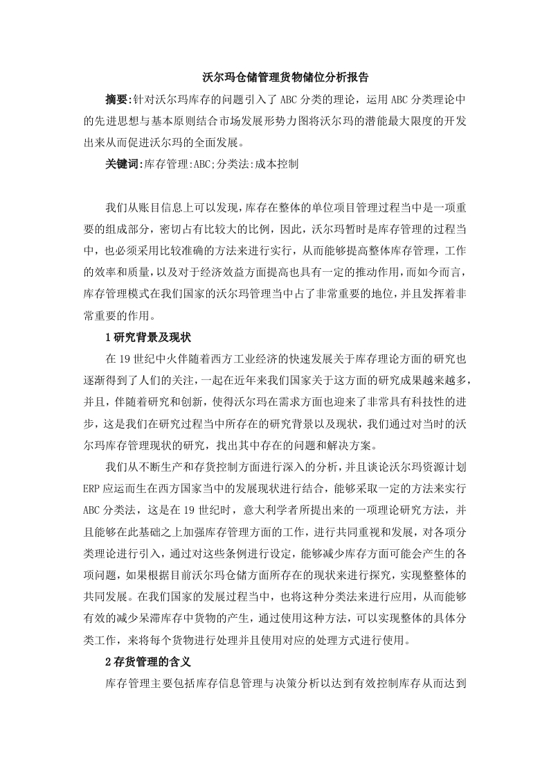 沃尔玛仓储管理货物储位分析报告摘要:针对沃尔玛库存的问题引入了ABC分类的理论,运用ABC分类理论中的先进思想与基本原则结合市场发展形势力图将沃尔玛的潜能最大限度的开发出来从而促进沃尔玛的全面发展。关键词:库存管理:ABC:分类法:成本控制我们从账目信息上可以发现,库存在整体的单位项目管理过程当中是一项重要的组成部分,密切占有比较大的比例,因此,沃尔玛暂时是库存管理的过程当中,也必须采用比较准确的方法来进行实行,从而能够提高整体库存管理,工作的效率和质量,以及对于经济效益方面提高也具有一定的推动作用,而如今而言,库存管理模式在我们国家的沃尔玛管理当中占了非常重要的地位,并且发挥着非常重要的作用。1研究背景及现状在19世纪中火伴随着西方工业经济的快速发展关于库存理论方面的研究也逐渐得到了人们的关注,一起在近年来我们国家关于这方面的研究成果越来越多,并且,伴随着研究和创新,使得沃尔玛在需求方面也迎来了非常具有科技性的进步,这是我们在研究过程当中所存在的研究背景以及现状,我们通过对当时的沃尔玛库存管理现状的研究,找出其中存在的问题和解决方案。我们从不断生产和存货控制方面进行深入的分析,并且谈论沃尔玛资源计划EP应运而生在西方国家当中的发展现状进行结合,能够采取一定的方法来实行ABC分类法,这是在19世纪时,意大利学者所提出来的一项理论研究方法,并且能够在此基础之上加强库存管理方面的工作,进行共同重视和发展,对各项分类理论进行引入,通过对这些条例进行设定,能够减少库存方面可能会产生的各项问题,如果根据目前沃尔玛仓储方面所存在的现状来进行探究,实现整整体的共同发展。在我们国家的发展过程当中,也将这种分类法来进行应用,从而能够有效的减少呆滞库存中货物的产生,通过使用这种方法,可以实现整体的具体分类工作,来将每个货物进行处理并且使用对应的处理方式进行使用。2存货管理的含义库存管理主要包括库存信息管理与决策分析以达到有效控制库存从而达到最终目的的沃尔玛提高沃尔玛经济效益专家认为库存管理是供应商的库存策略和价值链分析和过程进行比较一种方法称为反应方法该方法基于客户的需求通过某些驱动交付的产品的分销渠道第第二种方法,我们也可以称其为计划方法,能够在产品的需求之上来展开运输和分布等各项工作,能够进行逻辑推理,并且将这样的方法进行结合和分析,能够对产品和市场,环境当中所体现的共同管理方法进行有效的应对,其实我们可以发现,主要存在以下几种功能,首先,对于沃尔玛的库存管理方面,应该进行有效的加强,对此进行平衡,对于很多从事生产经营的沃尔玛企业来讲,一定要有足够的库存储备,才能够提高沃尔玛整体的平衡性来进行共同促进,满足市场发展的需求所在,其实我们要加强沃尔玛库存管理系统方面所考虑的各项成本因素,能够根据各项采购成本进行开展不同的活动,并且对库存的数量进行确定,能够保证整体的发展模式可以进行共同促进。因此,在进行存货管理的过程当中,我们需要考虑的因素包括很多,我们要进行具体的分析和整治,从而找出其中所存在的现状。3采用ABC分类法的必要性沃尔玛不断增长的业务需求传统的库存管理方式显然暴露了过去的不足之处。这显然不符合现代库存管理的要求ABC分类采用数理统计方法对各种事物和相关因素根据不同的事物或属性或体重要求统计整理和分类。分为ABC三类给出相应的辅助管理的不同程度的焦点对应的库存管理ABC分类管理是按照品种和占领首都的库存物品被分为特殊库存(A类)库存(B)的一般重要性和库存(C类)三个等级然后不同等级分别进行管理和控制的方法。采用一个有效的分类方法,对于整体的库存来讲是非常重要的,我们只有找准方法才能够发挥在仓储管理过程中所发挥的作用,能够进行集中整治,分类分类找出其中所存在的问题,并且进行不断的深究。3.1ABC分类法的优点节省大大提高沃尔玛存货周转率的管理,从而减少了对资金流动的压力变成现金减少利息支出。降低成本还可以节省大量的资金和存货占据相对保存贷款利息。因此,在这个分类方法的优点方面,我们最注重的就是能够提高整体的存货周转率,这也是我们研究过程中的重点问题所在,我们通过对于存货周转率进一步不断的分析和探究,能够整体减少在资金流动方面可能会发生的各项压力问题。对这些分离方法进行不断的使用和探究,对于整体的发展具有一定的推动作用,同时,也能够促进我们国家其他产业的库存管理方法的变革。减少短缺。最大限度地降低库存库存水平并设法提高正确库存现货的速度。使用ABC分类法可以最大限度的降低不足率在C类商品有足够的存货在同一时间。你可以为B类商品和船期安排可靠的控制类零部件可以集中处理控制和翻身及时发现这类存货的库存并迅速纠正。3.2实施ABC分类法应注意的问题ABC分析法的分类是人为的一般是将分析对象分成A、B、C三类,所述存储系统中的ABC分析密钥管理的主要实施资金而不是物品本身的重要性。ABC分类法是基于一定基础的统计数据应该是动态分析的应该随时调节以获得最大的实际库存的结果。所以我们应该对集中所有出来的动态结果进行极致的解析和研究,通过进行深入