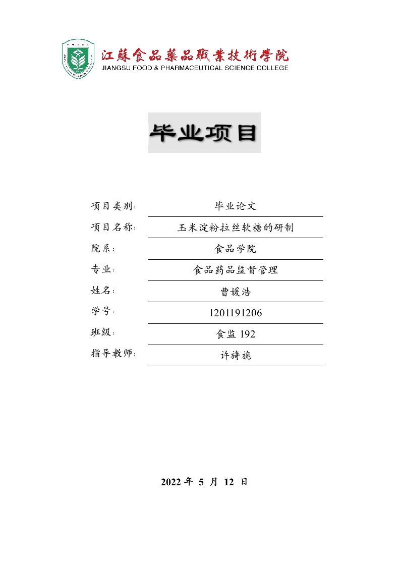JIANGSU FOOD PHARMACEUTICAL SCIENCE COLLEGE毕业项目项目类别:毕业论文项目名称:玉米淀粉拉丝软糖的研制院系:食品学院专业:食品药品监督管理姓名:曹媛浩学号:1201191206班级:食监192指导教师:许旖旎2022年5月12日诚信声明本人郑重声明:所呈交的毕业项目报告/论文《玉米淀粉拉丝软糖的研制》是本人在指导老师的指导下,独立研究、写作的成果。论文中所引用是他人的无论以何种方式发布的文字、研究成果,均在论文中以明确方式标明。本声明的法律结果由本人独自承担。作者签名:曹媛浩2022年5月12日摘要:本文以白砂糖、柠檬酸、胶凝剂、玉米浆、麦芽糖浆为原料,开发出新型玉米淀粉拉丝软糖,以感官评价为标准,以单因素实验为例,通过正交试验确定了胶凝剂、白砂糖、柠檬酸和麦芽糖浆的最佳工艺条件。结果表明,最优工艺参数方为白砂糖45%,胶凝剂2.0%,柠檬酸1.5%,麦芽糖浆40%,按此配方制作出的玉米淀粉拉丝软糖口感软韧,有弹性,色泽均匀,带有淡淡玉米的香甜味,理化和微生物指标都符合国家标准,此研究为玉米的多方面利用,提高玉米的附加食品价值提供了有利的依据。关键词:柠檬酸:白砂糖:胶凝剂:麦芽糖浆