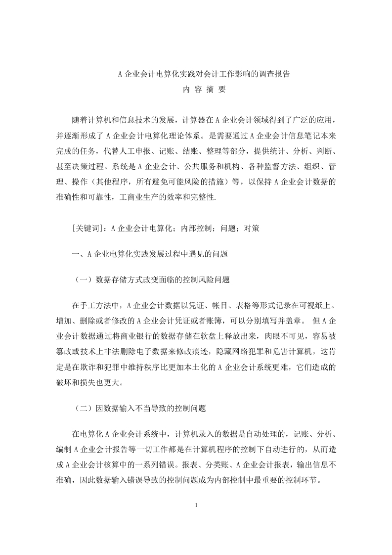 首页毕业论文范文模板A企业会计电算化实践对会计工作影响的调查报告