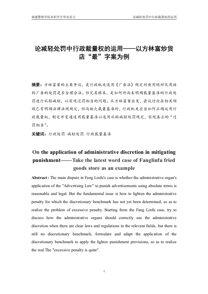 福建警察学院本科学生毕业论文论减轻处罚中行政裁量权的运用论减轻处罚中行政裁量权的运用一以方林富炒货店“最”字案为例摘要:方林富案的主要争议,是行政机关适用《广告法》规定对使用绝对化用语的广告的处罚是否合理合法。但究其根本,是如何对尚未明确裁量基准的行政处罚进行从轻减轻,以实现过罚相当的问题。从方林富案出发,尝试讨论在相关领域已有明确法律法规规定,但尚缺乏裁量基准时,行政机关应当如何正确运用行政裁量权,制定并变通适用裁量基准以适用从轻减轻处罚规定,实现真正的“过蜀相当”。关键词:行政处罚减轻处罚行政裁量基准On the application of administrative discretion in mitigatingpunishment-Take the latest word case of Fanglinfu friedgoods store as an exampleAbstract:The main dispute in Fang Linfu's case is whether the administrative organ'sapplication of the "Advertising Law"to punish advertisements using absolute terms isreasonable and legal.But the fundamental issue is how to lighten the administrativepenalty for which the discretionary benchmark has not yet been determined,so as torealize the problem of excessive penalty.Starting from the Fang Linfu case,try todiscuss how the administrative organs should correctly use the administrativediscretion when there are clear laws and regulations in the relevant fields,but there isstill no discretionary benchmark,formulate and adapt the application of thediscretionary benchmark to apply the lighter punishment provisions,so as to realizethe real The "excessive penalty is quite".福建警察学院本科学生毕业论文论减轻处罚中行政裁量权的运用Key words Administrative penaltiesMitigate the penaltyAdministrativediscretion benchmarks一、问题的提出与展开在2020年一月的时候,杭州市西湖区的一家炒货店,也就是方林富炒货店对杭州市西湖区市场监督管理局进行控诉,正式一起行政纠纷案。经过一系列的法院审判,终于得到了结果。原告方林富在其店内及食品包装袋上进行“全中国最好吃的栗子”、“也是世界最高端栗子”等宣传,被告杭州市西湖区市场监督管理局认为原告发布的广告违反了《广告法》第9条第3项规定,根据《广告法》第57条第1项、《杭州市规范行政处罚自由裁量权的规定》第9条的规定,决定责令原告停止发布使用绝对化用语的广告,并处罚款20万元。原告不服,进行复议,复议机关杭州市市场监督管理局维持处罚决定,原告不服,提起诉讼。一审法院认为“最”字宣传确实违法,但作为个体工商户,其广告影响力及波及范围较小,且不太易对消费者产生太大的误导,系违法情节较为轻微,虽有危害但不严重,认为原行政处罚决定应属于明显不当,故根据《中华人民共和国行政诉讼法》(以下简称《行政诉讼法》)第77条以及《中华人民共和国行政处罚法》(2021修订)第5条、第6条与第32条的相关规定⑧,作出变更判决,变更罚款数额为10万元。原告不服,提起上诉,二审法院驳回上诉,维持原判。在这起审判的过程中,原告对此表示不予采纳,其中的结果申请再度进行审定,而浙江省的高院,对方林富炒货店的申请进行了驳回,从而维持一开始所判定的结果①。①杭州市西湖区人民法院行政判决书(2016)浙0106行初240号。②判决书原文适用《行政处罚法》(2017修正),旧法中对应的法条依次为第4条、第5条与第27条。③杭州市中级人民法院行政审判书(2018)浙01行终511号。④浙江省高级人民法院(2019)浙行申64号。2福建警察学院本科学生毕业论文论减轻处罚中行政裁量权的运用方林富炒货店这个案件主要是发生在刚搬部广告法的时候,并且从行政机关的层面来看,当时的广告法是对具有发布相关绝对化的词语进行处罚的,方林富炒货店这个案件主要发生在广告法刚刚颁布的时期,并且,以行政机关的层面来进行看待的话,在当时,如果发布广告时具有绝对化的用语,是要规定罚款的,但是没有从轻处罚以及免受处罚这样的规定,显然,这是不公平的,并且从行政机关的层面来进行看待的话,杭州市的市场监管局关于处罚方面具有一定的错误,后续需要进行改善。从法院的角度来看,相较《广告法》而言,《行政处罚法》作为行政处罚领域的基础性法律,具有其适用的空间,此种做法是否是对“特别法优于一般法”的原则的打破,有无法律依据。法院的判决虽然最大程度实现个案正义,但难以保障行政机关依法运用行政裁量权作出的减轻处罚规定为何,故笔者以“方林富案”为例,讨论行政机关如何正确掌握减轻处罚的情节和幅度以及变通适用裁量基准,促进行政机关正确行使行政裁量权作出减轻处罚的决定,保障行政相对人的合法权益,实现真正的过罚相当。二、减轻处罚的依据(一)《中华人民共和国行政处罚法》的总则地位《广告法》中对于使用绝对化用语广告行为,仅规定了处20万元以上100万元以下的罚款,然而对于如何适用此较大幅度的罚款以及在此幅度基础上从轻减轻处罚并未加以明确规定,这就意味着应当依据《行政处罚法》中有关从轻减轻处罚的规定来弥补《广告法》的空缺。正如行政基本法是“一部规范所有行政行为、在行政法体系中起纲要性、通则性、基础性作用的一部法律”,《行政处罚法》为各类行政处罚活动提供了必须遵循的基本原则,确保行政处罚法律规范体系的统一性和完整性,《广告法》与《行政处罚法》为特别法与一般法的关系,在作出行政处罚决定时,遵循特别法优于一般法,优
