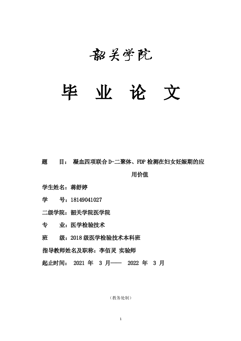 韶吴学院毕业论文题目:凝血四项联合D-二聚体、FDP检测在妇女妊娠期的应用价值学生姓名:蒋舒婷学号:18149041027二级学院:韶关学院医学院专业:医学检验技术班级:2018级医学检验技术本科班指导教师姓名及职称:李佰灵实验师起止时间:2021年3月一2022年3月(教务处制)凝血四项联合D-二聚体、FDP检测在妇女妊娠期的应用价值摘要:很多孕妇在妊娠之后,会由于胚胎和胎儿的生长发育的需求不同,可能会对胎盘当中的激素分泌会产生一定的影响,使得孕妇的血液会始终处于高凝的状态。在孕妇的血液内也会具有一定的凝血成分,其中的各项物质也会随之发生改变。因此,在孕妇进行检查的时候更要对这些数据进行有效的理解,FDP都出现了相应的改变,这对于预防孕妇出现产后大出血及血栓性疾病有重要的帮助和价值,本文通过探讨凝血四项和D-D以及FDP检测在妇女妊娠期的具体作用展开综述。关键词:凝血四项:D-D:FDP:妊娠Application value of four coagulation items combined withD-dimer and FDP detection in women during pregnancyAbstract:Many pregnant women after pregnancy,due to the different needs of the growth anddevelopment of the embryo and the fetus,may have a certain impact on the hormone secretion ofthe placenta,so that the blood of the pregnant woman will always be in a state of high coagulation.In the blood of pregnant women will also have a certain coagulation components,which willchange the various substances.So close,in pregnant women who was conducting tests at theunderstanding of these data effectively,the FDP has the corresponding change,to preventpostpartum bleeding and thrombotic diseases in pregnant women have important help and value,this paper discusses four and blood coagulation D-D and FDP detection in the specific role ofwomen during pregnancy were reviewed.Key words:Four coagulation D-D;FDP:Pregnancy目录1凝血四项、D一二聚体以及FDP的概述41.1.1凝血酶原时间.1.1.3部分凝血活酶时间.5.62凝血四项、D二聚体以及FDP检测在妇女妊娠期的应用价值62.1凝血四项检测在妇女妊娠期的应用价值..72.2D-二聚体和FDP检测在妇女妊娠期的应用价值7.12