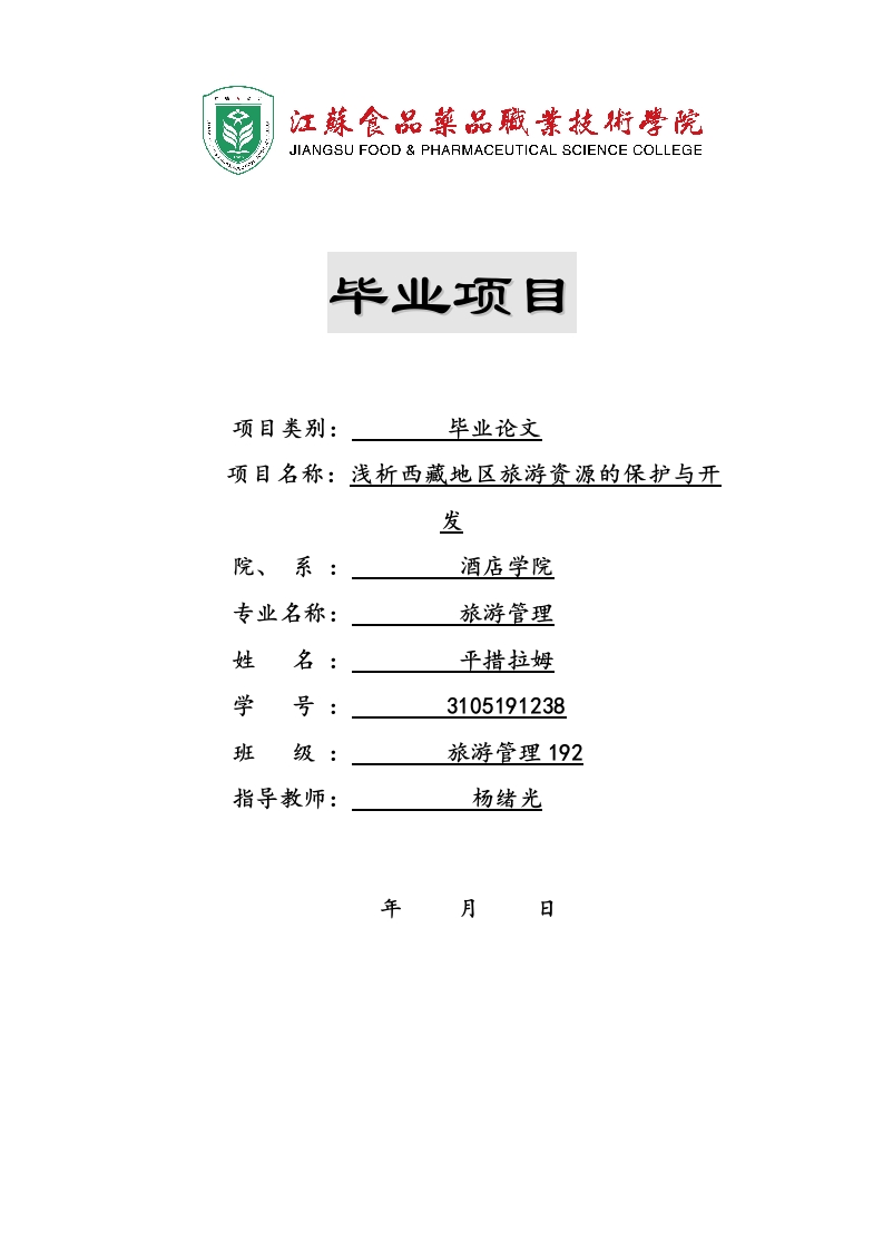 JIANGSU FOOD PHARMACEUTICAL SCIENCE COLLEGE毕业项目项目类别:毕业论文项目名称:浅析西藏地区旅游资源的保护与开发院、系酒店学院专业名称:旅游管理姓名平措拉姆学号3105191238班级:旅游管理192指导教师:杨绪光年月日诚信声明本人郑重声明:所呈交的毕业项目报告/论文《浅析西藏地区旅游资源的保护与开发》是本人在指导老师的指导下,独立研究、写作的成果。论文中所引用是他人的无论以何种方式发布的文字、研究成果,均在论文中以明确方式标明。本声明的法律结果由本人独自承担。作者签名:年月日2018届毕业项目摘要:随着当前我国现代工业化、城市化的快速深入推进,追求文化享受已成为众多旅游者出游的最大梦想。如何充分深入挖掘旅游品质内涵,努力不断增强国民文化素质品位,满足广大旅游者切实追求文化精神境界文化品质生活,是当今我国旅游业必须深入研究的重要战略课题,也是推动当今世界各地发展壮大我国旅游旅游产业的重要关键所在。本文着重探讨了西藏地区旅游资源的保护与开发现状,并在此基础之上掌握了西藏地区景区资源保护过程当中所存在的问题以及采取的措施。然后又通过数据分析的方式,结合当地居民及游客对景区资源保护的认知情况展开了详细的分析,从而找到了促进西藏地区旅游资源保护与开发的具体对策,以期能够为保护西藏地区旅游资源,促进该地旅游资源发展提供一种新的研究视角,为更好地探索、保护传承西藏地区旅游资源提供相应的决策和依据。关键词:西藏:旅游资源:保护:开发