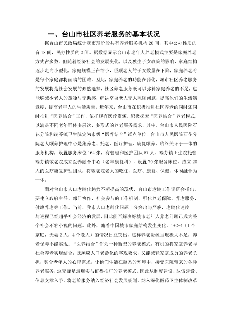一、台山市社区养老服务的基本状况据台山市民政局统计我市现阶段共有养老服务机构20间,其中公办性质的有18间,民办性质的2间。据数据显示台山市老年人养老模式主要是家庭养老方式占多数。但随着经济社会的发展变化,以及独生子女政策的影响,家庭结构逐步走向小型化,家庭规模正在缩小,照顾老人的子女数量在下降,家庭养老将是每个家庭都将面临的困难。因此,家庭养老的功能在弱化,城市社区养老服务的发展将是社会发展的必然选择,社区养老服务既可以弥补家庭养老的不足,也能够减少老人的孤独与无助感,解决空巢老人无人照顾问题,提高他们的生活满意度,提高老年人的生活质量。近年来,台山市在积极推进社区养老的同时还同时推进“医养结合”工作,依托现有医疗资源,积极探索“医养结合”养老模式,以满足不同老年群体多层次、多形式的养老服务需求。其中,台山市人民医院石花分院和端芬镇卫生院定为市级“医养结合”试点单位。台山市人民医院石花分院老人顾养护理中心是集养老、托老、医疗护理、康复顾养、临终关怀于一体的服务机构,设置服务床位164张,有管理和医护团队57人。端芬镇卫生院托管端芬镇敬老院成立医养融合中心(老年康复科),设置70张服务床位,成立20人的医疗康复护理团队,将敬老院老人的吃住、医疗、康复、保健、休闲融合为一体。面对台山市人口老龄化趋势不断提高的现状,台山市老龄工作调研会指出,要建立政府主导、部门协作、社会参与的工作机制,强化养老保障、养老服务、健康养老等工作。当前,我市人口老龄化问题十分突出与严峻,老龄化速度与进程已经超乎社会经济的发展,因此能否解决好城市老年人养老问题己成为整个社会不容小视的问题。此外,随着中国城市家庭结构发生变化,1+2+4(1个家庭,夫妻2人,4个老人)的情况日益突出,这样养老资源呈现极大不足,养老保障不能实现。“医养结合”作为一种新型的养老模式,有机的将家庭养老与社会养老实现结合,既顺应人口老龄化的客观要求,又能减轻家庭成员的养老负担,契合老年人的心理需求,让他们生活在熟悉的环境中,接受医院带来的各种养老服务,这无疑是最现实与值得推广的养老模式。因此从制度建设、队伍建设、信息支撑入手,将老龄服务纳入经济社会发展规划,纳入深化医药卫生体制改革和促进养老、健康服务业发展的总体部署,制定老年健康服务体系建设的具体规划和实施办法,开创老龄社区服务工作新局面。二、台山市社区养老服务存在问题(一)社区养老服务资金缺乏台山市社区养老服务的发展需要强大的人力、物力、财力的支撑。近年来,台山市越来越重视城市社区养老服务的发展,并将社区建设工作逐步作为的重点工作,通过对社区的调查研究发现,虽然有的社区相继设立了社区养老服务中心,并开展社区养老服务工作,目前台山市社区管理大部分资金是由台山市民政局投入的,资金来源局限,对于社区居家养老的服务供给,政府给予的财政支出远远不能满足养老人群的需求,在政策层面没有得到真正落实与执行,政府政策的覆盖面较窄,受益群体范围还不够多。导致城市社区服务设施简陋以及社区的后续服务工作无法进行,社区养老服务资金的缺乏与不足成为了阻碍台山市社区养老服务发展的重要因素。(二)社区养老设施不完善伴随着台山市经济社会的快速发展,一些新型社区应运而生,但新型社区在建设中却忽略了养老设施建设的问题,例如,一些社区虽然为老年人配置了健身器材,但并没有考虑到老年人的身体状况,没有与老年人的实际需求相结合,也没有形成相应的安全保护措施,导致高龄老人享受不了这种待遇,因此导致这些健身设施便成为了摆设。社区养老服务存在供需错位,老年群体作为异质性群体,存在多元化的养老服务需求。目前,老年人主要对体育娱乐、上门看病、文化学习和助餐等服务的需求和利用率较高。而随看年龄增加,老年人对上门看病和助餐服务的需求不断增加,而对体育娱乐和学习活动方面的需求不断减少:社区居家养老服务在供给数量、质量或结构上较为趋同,多数以提供日常生活服务为主,缺少专业化的医疗保健和精神文化服务。(三)社区养老缺乏法律的支撑台山市的城市社区养老服务发展时间短,发展还不成熟,缺乏社区养老方面的经验,虽然我国出台了一些对社区居家养老服务的指导意见,但具体的法律法规、规范的实施细则还没有出台。若没有具体规范提供服务组织的行为、则会在管理上出现混乱。若没有具体规范提供服务方和接受服务方的具体权益,则会出现权益不清问题,易损害老年人的权益。同时在我国人口老龄化日益严峻的今天,很多人尚未认识到社区养老服务对解决我国养老问题的重要作用,没有形成完善的法律法规,因此导致城市社区养老在实施的过程具有较大的随意性,缺乏对社区养老统一的规范和管理,使社区养老无法可依,无章可循。(四)社区养老服务质量不高近年来创办起来的养老机构对从业人员的要求缺乏专业标准,普遍雇用的是一些文化素质偏低的合同工或临时工,或是出于照顾,吸纳一些下岗女工,在观念上认为这类工作本身就无多少学问或技能,更谈不上专业培训了。不同年龄的老年人无论是生理还是心理都呈现出较大的个体差异,需要专业护理,渴望体贴入微的