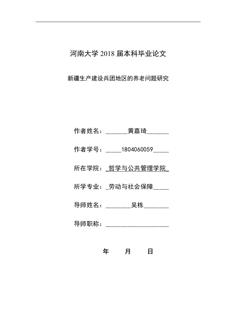 河南大学2018届本科毕业论文新疆生产建设兵团地区的养老问题研究作者姓名:黄嘉琦作者学号:1804060059所在学院:哲学与公共管理学院所学专业:劳动与社会保障导师姓名:吴栋导师职称:年月日摘要上世纪50年代,内地地区的一大批中国人民解放军进驻新疆,在新疆地区组建了”中国人民解放军、新疆军区生产建设兵团”。几十年过去了,当时的那批进驻者们己经步入老年,随着他们年龄的增长,加上一些特殊原因,产生了人口老龄化的问题,有关养老的问题也逐渐凸显出来。本文通过研究新疆兵团地区的人口结构的数据以及人口流动的状况,探寻兵团地区人口老龄化的原因以及老龄化带来的养老问题。调查目前存在的养老问题现状,以及兵团地区特殊的体制对现有的养老制度影响。调查显示兵团地区青壮年人口流失较多,人口老龄化问题严重,部分兵团地区基础设施缺乏,不利于老人养老,基础设施的缺乏也加剧了人口流失,老龄化程度加深。现有的特殊的兵团保障制度具有优越性的同时,也存在着一些问题。只有加强基础设施建设,引进养老产业,出台新政策吸引青壮年回流,完善养老保险制度的改革,推动兵团地区特殊政策与现代化新政策进行对接,才能够推动兵团地区的养老问题更好地解决。关键词:养老保障,人口老龄化,社会保障AbstractIn the 1950s,a large number of Chinese people's Liberation Army entered Xinjiang andestablished the "production and Construction Corps of the Xinjiang Military Region of theChinese people's Liberation Army".Over the past few decades,the residents at that time haveentered the old age,the population is aging,and the problems related to pension are becomingmore and more prominent.By studying the population data and population flow in BINGTUANarea,this paper explores the problems caused by population aging in BINGTUAN area,investigates the current situation of pension problems,and the impact of special system on theexisting pension system.The survey shows that there is a large loss of young and middle-agedpeople in BINGTUAN area,and the problem of population aging is serious.Some BINGTUANareas lack infrastructure,which is not conducive to the elderly.The lack of infrastructure alsoexacerbates the population loss and the degree of aging.While the special corps security systemhas advantages,it sometimes hinders the residents from getting security smoothly.Only bystrengthening infrastructure construction,introducing pension industry,issuing new policies toattract the return of young and middle-aged people,improving the pension insurance system,andpromoting the connection between the special policies of the corps and the new policies ofmodemization,can the pension problems in the Corps be better solved.Key Words:Pension security population aging social security