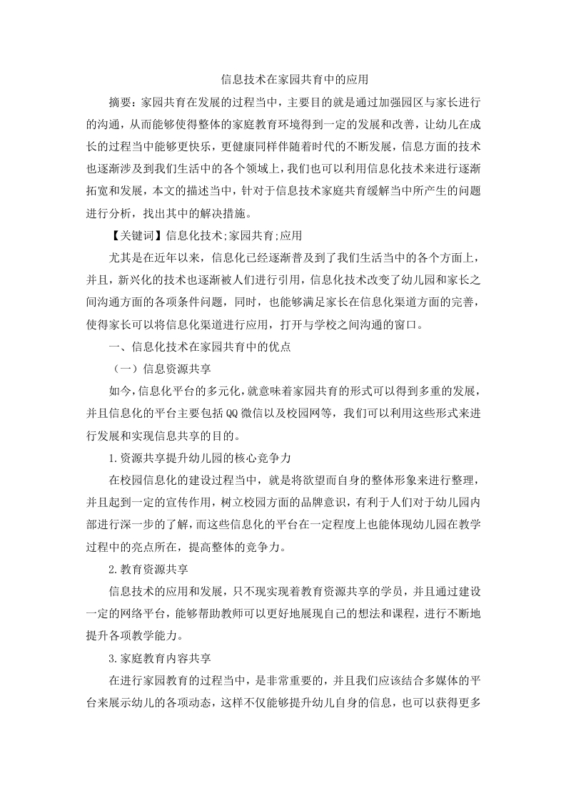 信息技术在家园共育中的应用摘要:家园共育在发展的过程当中,主要目的就是通过加强园区与家长进行的沟通,从而能够使得整体的家庭教育环境得到一定的发展和改普,让幼儿在成长的过程当中能够更快乐,更健康同样伴随着时代的不断发展,信息方面的技术也逐渐涉及到我们生活中的各个领域上,我们也可以利用信息化技术来进行逐渐拓宽和发展,本文的描述当中,针对于信息技术家庭共育缓解当中所产生的问题进行分析,找出其中的解决措施。【关键词】信息化技术:家园共育:应用尤其是在近年以来,信息化已经逐渐普及到了我们生活当中的各个方面上,并且,新兴化的技术也逐渐被人们进行引用,信息化技术改变了幼儿园和家长之间沟通方面的各项条件问题,同时,也能够满足家长在信息化渠道方面的完善,使得家长可以将信息化渠道进行应用,打开与学校之间沟通的窗口。一、信息化技术在家园共育中的优点(一)信息资源共享如今,信息化平台的多元化,就意味着家园共育的形式可以得到多重的发展,并且信息化的平台主要包括QQ微信以及校园网等,我们可以利用这些形式来进行发展和实现信息共享的目的。1.资源共享提升幼儿园的核心竞争力在校园信息化的建设过程当中,就是将欲望而自身的整体形象来进行整理,并且起到一定的宣传作用,树立校园方面的品牌意识,有利于人们对于幼儿园内部进行深一步的了解,而这些信息化的平台在一定程度上也能体现幼儿园在教学过程中的亮点所在,提高整体的竞争力。2.教育资源共享信息技术的应用和发展,只不现实现着教育资源共享的学员,并且通过建设一定的网络平台,能够帮助教师可以更好地展现自己的想法和课程,进行不断地提升各项教学能力。3.家庭教育内容共享在进行家园教育的过程当中,是非常重要的,并且我们应该结合多媒体的平台来展示幼儿的各项动态,这样不仅能够提升幼儿自身的信息,也可以获得更多的家庭教育经验。(二)促进有效沟通1.教师和家长的沟通家园共育的整体过程,就是通过教师和家长进行沟通和培养,能够建立一种传统的沟通方式,通过家访的形式,建立一定的家校联系渠道,来对幼儿的形式进行了解,并且也会提高一定的沟通效率,在如今信息化的社会这方面进行了更加的强调,从而能够使用信息化技术来反馈幼儿在家庭当中的各项情况,使得时间能够加大对于幼儿的培育。2.家长和家长的沟通在你这些计划网络的支持一下,家长之间也可以多进行沟通,同样教师的经验,对于家人来源似乎也缺乏一定的时间性,但是很多优秀家长来进行现身说法的话,不仅能够让家长在整体的感情上得到一定的认同,同样也能够更加便于实际的去进行发展。3.家长和幼儿的沟通在家长与幼儿进行沟通的过程当中,我们可以发现,父母的爱是非常深沉的,并且去向幼儿表达爱是也是同伙能够与幼儿一起观看教育平台上的课程,来增加家长与幼儿之间话题的沟通,能够促使幼儿感受到父母对他们的关心,而愿意向父母表达自己的想法,并且通过信息化的方式的完成教师所给予的各项任务,消除家长由于工作繁忙而产生的距离感。(三)家长具有较强的参与感整体的参与感能够让学生和家长降低一定的分离焦虑现象,而幼儿园内举办相关活动的时候,教师也可以在教育平台上征集家长的意见,而一些幼儿园也建立了对应的家长委员会来,使得家长能够更好地进行配合和沟通,协助整体的活动进行推进。二、信息化技术在家园共育中面临的问题(一)后期维护待优化1.更新不及时。平常的教育平台主要包含由教师制作的幼儿学习动态,需要教学之余的时间编制完成,所以更新速度缓慢。2.对访问者不做分析。对信息化平台的来访者未做分析,因此无法发现其中的优势和缺陷。就如同买东西没有售后,让信息化平台变得冰冷,无法促进家园之间的互动。3.内容呈现方式不生动。前面提到过,因为家园共育平台内容多由教师编制,繁忙的教学工作导致教师编制内容的时间较少,因此内容多为文字或者图文,无法满足家长需求。(二)幼儿家长的信息化技术水平不高现如今,部分幼儿家长文化水平不高,不能及时适应信息化技术对生活及家园共育中的改变:还有部分家长无法熟练地操作智能化电子产品,信息化平台的复杂性让家长变得手足无措。三、信息化技术在家园共育中应用的优化策略(一)配置专业的信息化团队幼儿园可邀请专业的团队负责如文案编辑、专业采集、数据分析、平台维护等工作。让信息化技术的应用变得条理清晰,解决家园共育平台中内容不生动、更新不及时、无法到达预期效果等问题,保证教师有更多的时间和精力开展教学工作,使信息化技术在家园共育中能得到更好的应用。(二)有效推进信息化技术在家园共育中的应用家长文化程度和传统教育理念阻碍了信息化技术在家园共育中的应用。因此,幼儿园要引导家长突破传统的教育理念,取其精华,去其糟粕。同时,教师也要对家长的教育理念给予引导,多分享正确的信息技术使用手段。对于父母工作繁忙或长期不在幼儿身边,爷爷奶奶不会智能电子设备的操作的,更要与其父母进行频繁沟通,尽快将信息化技术应用到家园共育中,让父母了解幼儿的学习生活,和教师进行有效沟通。与此同时,为方便家长操作,技术人员在信息化平台的构建上,应尽可能制作简洁、方