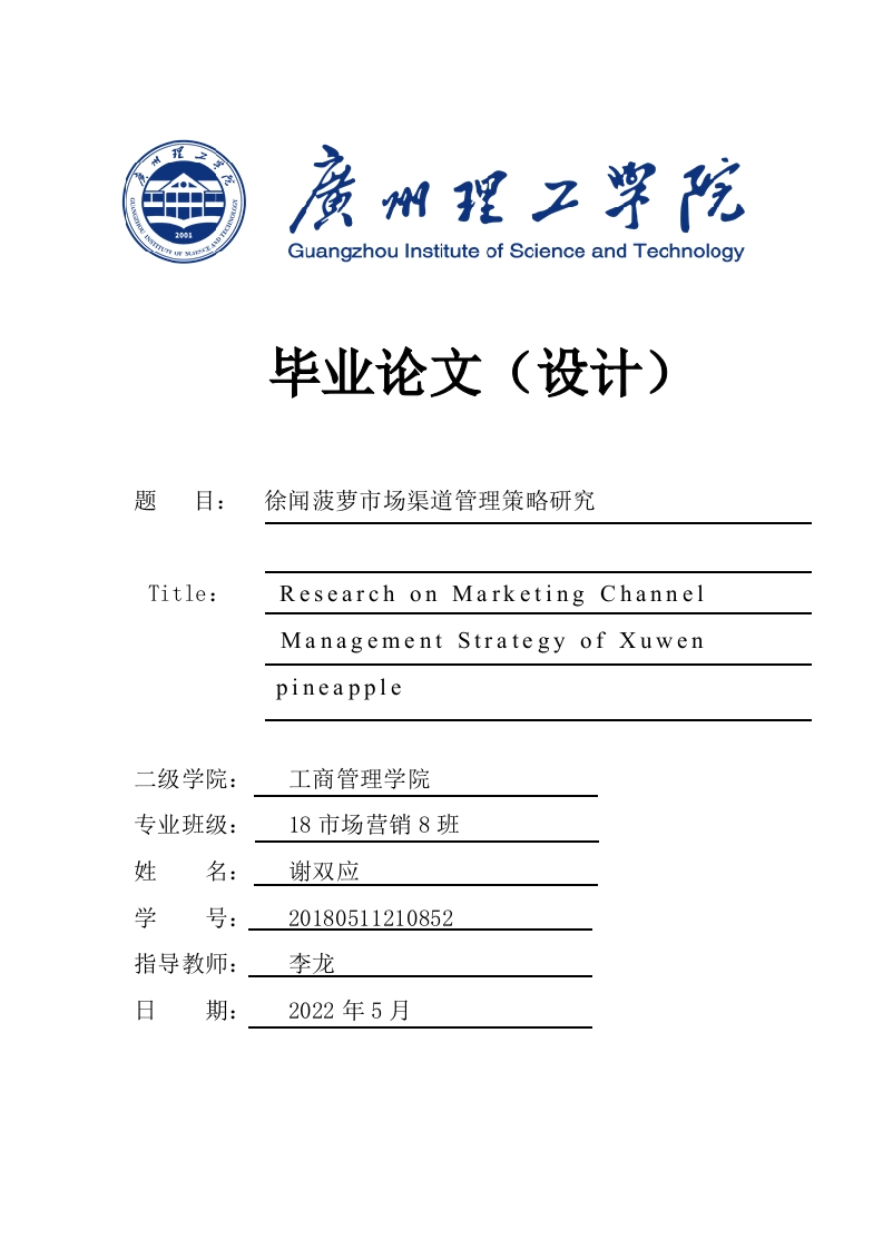 Guangzhou Institute of Science and Technology毕业论文(设计)题徐闻菠萝市场渠道管理策略研究Title:Research on Marketing ChannelManagement Strategy of Xuwenpineapple二级学院:工商管理学院专业班级:18市场营销8班姓名:谢双应学号:20180511210852指导教师:李龙日期:2022年5月诚信声明本人声明:1、本人所呈交的毕业设计(论文)是在老师指导下进行的研究工作及取得的研究成果;2、据查证,除了文中特别加以标注和致谢的地方外,毕业设计(论文)中不包含其他人已经公开发表过的研究成果,也不包含为获得其他教育机构的学位而使用过的材料;3、我承诺,本人提交的毕业设计(论文)中的所有内容均真实、可信。作者签名:日期:年月日徐闻菠萝市场渠道管理策略研究摘要随着徐闻县菠萝行业的发展壮大,对菠萝市场营销渠道有效管控和精细化管理,徐闻县已形成了国内最大的菠萝养殖生产基地。记者经过翻阅了大批文章资源,并通过问卷调查,结合实际案例研究等方法,以及对徐闻县菠萝市场相关资金管理业务情况进行了调查数据分析,发现了徐闻菠萝在市场渠道资金管控战略中面临的主要现实问题有:养殖品类单一:市场供需信息不对称:互联网+电商销售不畅通:农民品牌意识淡薄:产品附加值不高。同时发现徐闻菠萝产品滞销原因有:市场品质问题造成的生鲜农产品品牌竞争力大规模牡鹿:农民盲目养殖造成的供大于求:农产品信息不对称等。对徐闻菠萝市场情况进行调查数据分析,得出了影响徐闻菠萝市场占有率的主要原因有:各个产品种类市场竞争力差异:信息影响、价值预期、市场流通影响:互联网+电商农村布点,应用程度并不高:提出渠道管理解决的策略有:培育新型职业农民,提升农户生产决策水平:主动对接线上线下,拓宽国内销售渠道:完善信息共享机制,建立多方互通平台。调查后得到了如下结果,在菠萝产业滞销风波过后,徐闻县委州政府才更加深刻的意识到,菠萝产业滞销问题不仅仅是由于气象灾害、营销渠道不畅通、市场价格冲击大等诸多原因叠加而造成,也包括由于生产品种单调、商品流通途径简单、加工率不高、栽培手段滞后,而造成的“居民消费与供应相互错位“的困境,因此菠萝种植业改造与提升已经势在必行。