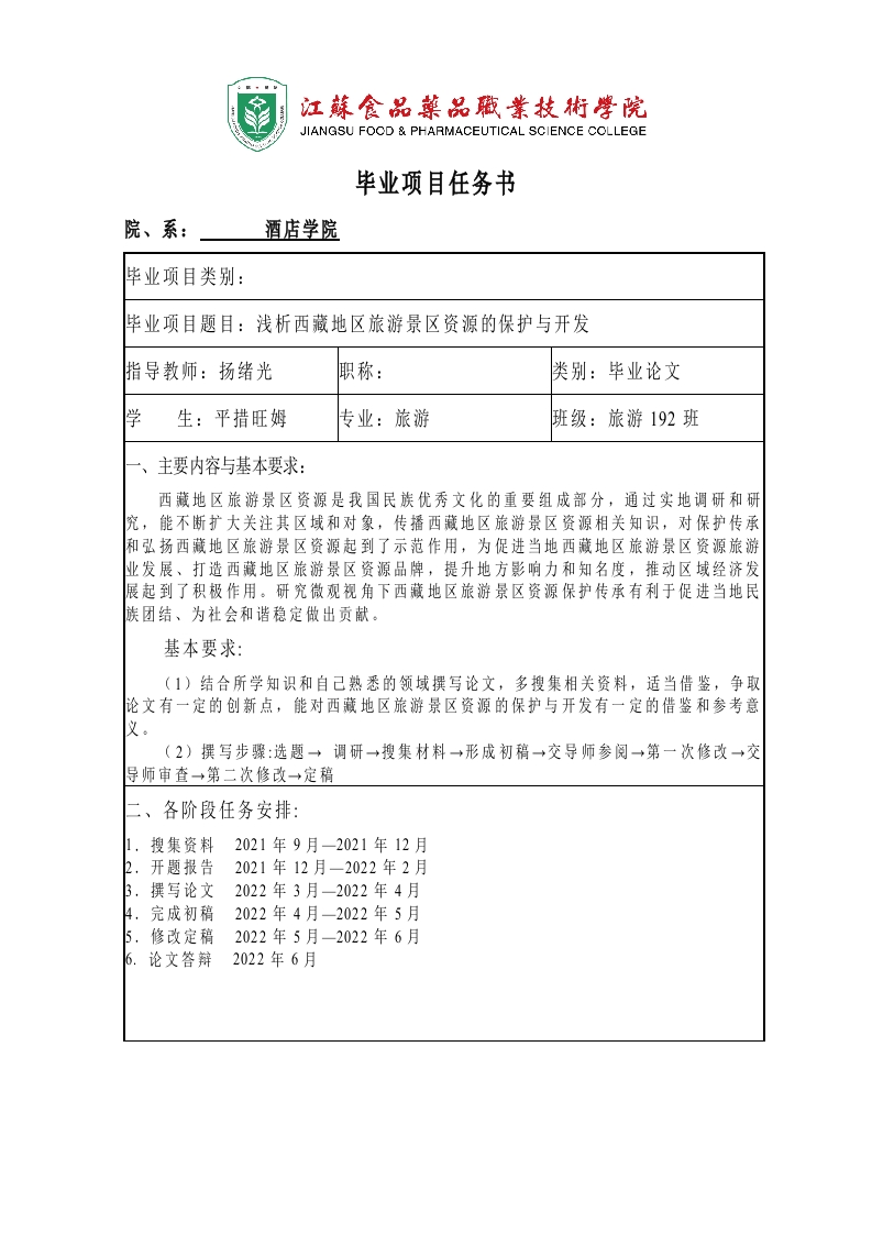 首页毕业论文范文模板2_西藏地区旅游景区资源的保护与开发任务书(1)