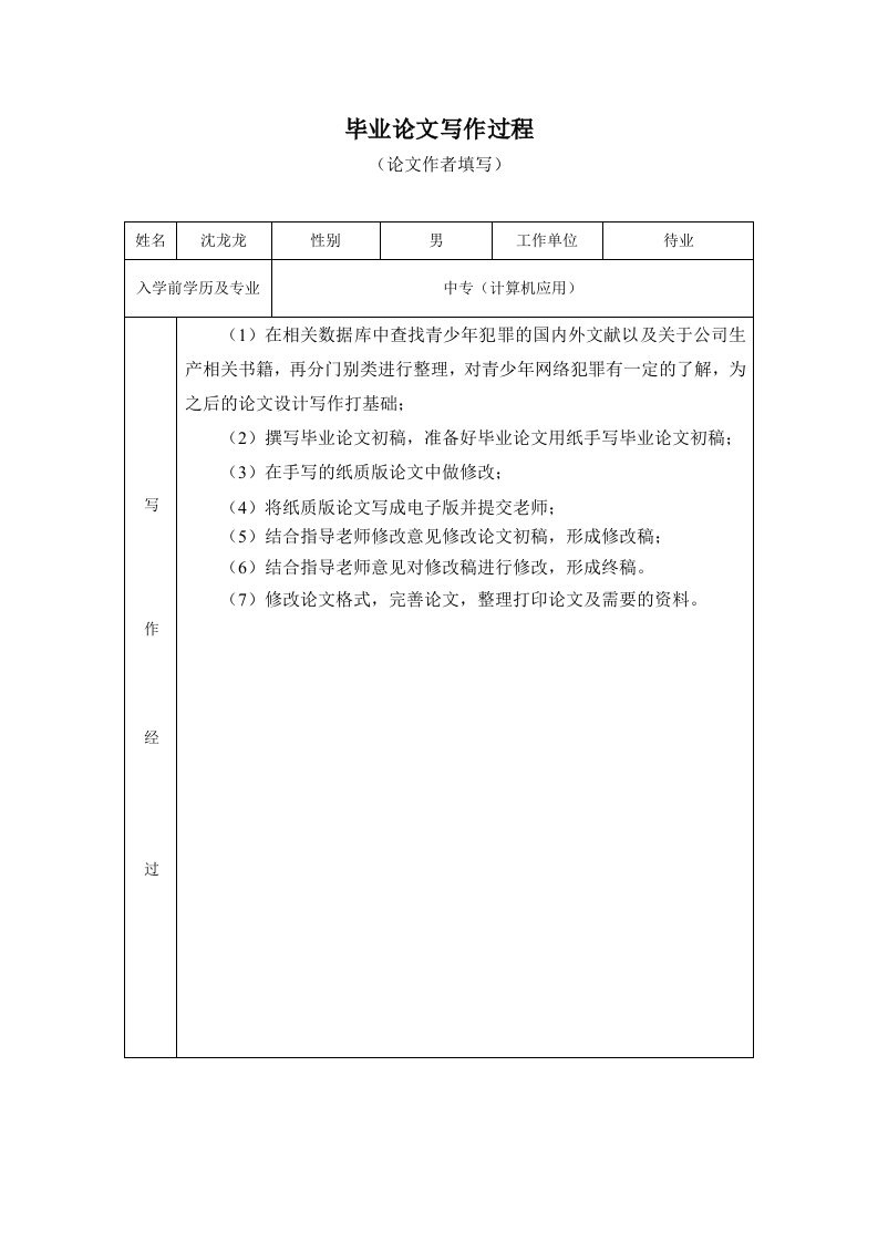 毕业论文写作过程(论文作者填写)姓名沈龙龙性别男工作单位待业入学前学历及专业中专(计算机应用)(1)在相关数据库中查找青少年犯罪的国内外文献以及关于公司生产相关书籍,再分门别类进行整理,对青少年网络犯罪有一定的了解,为之后的论文设计写作打基础:(2)撰写毕业论文初稿,准备好毕业论文用纸手写毕业论文初稿:(3)在手写的纸质版论文中做修改:写(4)将纸质版论文写成电子版并提交老师:(5)结合指导老师修改意见修改论文初稿,形成修改稿:(6)结合指导老师意见对修改稿进行修改,形成终稿。(7)修改论文格式,完善论文,整理打印论文及需要的资料。作经过湖北广播电视大学毕业设计(论文)教师指导记录表孝感市、州电大安陆分校安陆电大教学点指导教师殷涛学生姓名沈龙龙学号2042001404518专业法律事务指导时间:2021.9.15第指导内容:毕业论文撰写要求、需要提交的资料、时间安排等。次指导指导时间:2021.9.26第指导内容:复核毕业论文初稿内容并指导修改。一次指导指导时间:2021.10.8第指导内容:针对论文初稿提出的修改意见进行查看,指导具体修改。一次指导指导时间:2021.10.16第四次指导指导内容:查看完善后的论文,指导形成定稿。指导时间:2021.10.23第指导内容:检查定稿。五次指导指导时间:2021.11.05指导内容:检查定稿及相关资料。六次指导