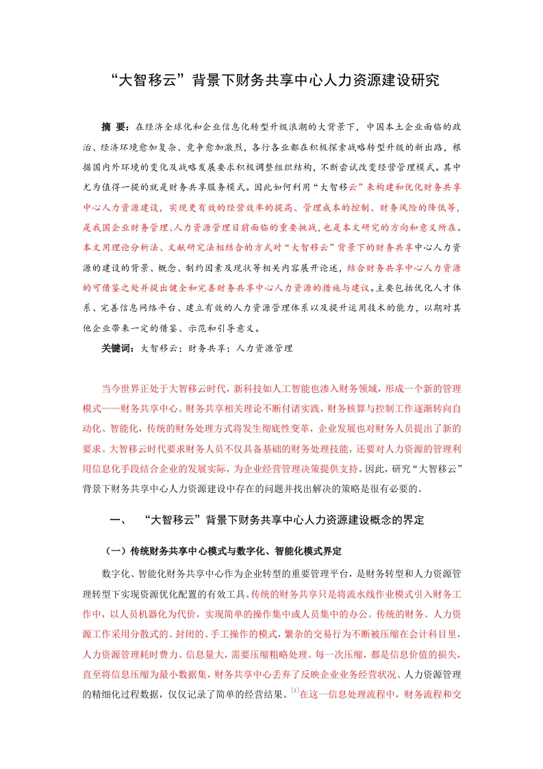 “大智移云”背景下财务共享中心人力资源建设研究摘要:在经济全球化和企业信息化转型升级浪潮的大背景下,中国本土企业面临的政治、经济环境愈加复杂、竞争愈加激烈,各行各业都在积极探索战略转型升级的新出路,根据国内外环境的变化及战略发展要求积极调整组织结构,不断尝试改变经营管理模式。其中尤为值得一提的就是财务共享服务模式。因此如何利用“大智移云”来枸建和优化财务共享中心人力资源建设,实现更有效的经营效率的提高、管理成本的控制、财务风险的降低等,是我国企业财务管理、人力资源管理目前面临的重要挑战,也是本文研究的方向和意义所在。本文用理论分析法、文献研究法相结合的方式对“大智移云”背景下的财务共享中心人力资源的建设的背景、概念、制约因素及现状等相关内容展开论述,结合财务共享中心人力资源的可借鉴之处并提出健全和完善财务共享中心人力资源的措施与建议。主要包括优化人才体系、完善信息网络平台、建立有效的人力资源管理体系以及提升运用技术的能力,以期对其他企业带来一定的借鉴、示范和引导意义。关键词:大智移云:财务共享:人力资源管理当今世界正处于大智移云时代,新科技如人工智能也渗入财务领域,形成一个新的管理模式一一财务共享中心。财务共享相关理论不断付诸实践,财务核算与控制工作逐渐转向自动化、智能化,传统的财务处理方式将发生彻底性变革,企业发展也对财务人员提出了新的要求。大智移云时代要求财务人员不仅具备基础的财务处理技能,还要对人力资源的管理利用信总化手段结合企业的发展实际,为企业经营管理决策提供支持。因此,研究“大智移云”背景下财务共享中心人力资源建设中存在的问题并找出解决的策略是很有必要的。一、“大智移云”背景下财务共享中心人力资源建设概念的界定(一)传统财务共享中心模式与数字化、智能化模式界定数字化、智能化财务共享中心作为企业转型的重要管理平台,是财务转型和人力资源管理转型下实现资源优化配置的有效工具。传统的财务共享只是将流水线作业模式引入财务工作中,以人员机器化为代价,实现简单的操作集中或人员集中的办公。传统的财务、人力资源工作采用分散式的、封闭的、手工操作的模式,繁杂的交易行为不断被压缩在会计科目里,人力资源管理耗时费力、信总量大,需要压缩粗略处理。每一次压缩,都是信总价值的损失,直至将信息压缩为最小数据集,财务共享中心丢弃了反映企业业务经营状况、人力资源管理的精细化过程数据,仅仅记录了简单的经营结果。在这一信息处理流程中,财务流程和交易分离,产生大量的冗余的流程环节,导致管理低效且成本高。财务处理时间滞后,财务信息无法及时反映环境变化,无法满足使用者实时决策的需求。财务信息支撑体系存在问题,导致财务信总片面、失真,无法满足业务管理需求。“大智移云”背景下的财务共享中心,则是从“最小数据集”向“大数据”转变,覆盖企业绝大部分的业务系统,是企业强大的业务中台和数据中台,为分、子公司提供更多的可以随时调用的业务支持。大量的业务交易产生大量的实时数据,使共享中心成为集团级数据中心,共享中心集成核算数据、预算数据、资金数据、资产数据、成本数据、外部标杆数据等,为数据建模、分析提供准确、全面、系统的数据来源,成为企业业务调整依据和决策依据。通过与利益相关者的互联互通,运用数字化、智能化的信息技术,以流程处理为核心,以优化组织结构、规范流程、提升流程效率、降低运营成本和创造价值为目的,以市场化的视角为内外部客户提供专业化生产服务的管理模式,结合云存储高效地采集、加工、报告数据,建立企业的数字神经网络,实施组织扁平化、流程简化、数据体系化,帮助企业用数据来管理、用数据米决策、用数据米创新,帮助企业在激烈竞争的商业环境中保持竞争优势。如图1所示:业务单元A业务单元C支金支业务单元C共亨服务中心之图1财务共享中心建立前后对比图(二)传统人力资源管理和“大智移云”下的人力资源管理界定在传统的人力资源管理模式下,很多大中型企业岗位冗杂,出现一职多岗,造成办事效率低下,也使企业需要很多的人力、物力来不断处理公司业务,包括人员招聘,人员培训,多系统成本等。人才选拔录用机制也不够完善。存在的漏洞导致人才选拔过程中出现一定的不合理性。如一些考核内容不够透明,存在不公平竞选等。但是在“大智移云”下的人力资源管理模式的兴起与完善后,公司人员实行岗位责任制,人员只需要完成业务项目中自己的工作,这样操作,人员任务分配呈流水线作业,业务运营的效率也得到了提高,并且在这样情况下,对人员的任职要求也大大降低,同时也减少了企业人力资源的费用。人才的选拔录用机制也进行了相应的优化,采用公平的竞争优势,不仅充分调动员工工作积极性,也能保证用人调配的公平性。而且在这种数据共享的财务模式下人力资源建设,能够提高公司的管理效率,解决了大中型企业人力组织的低效问题,顺应了网络建设的时代,为企业管理服务提供最好的全球信总数据配置。二、“大智移云”下的财务共享中心人力资源建设存在的问题目前,“大智移云”下的财务共享中心人