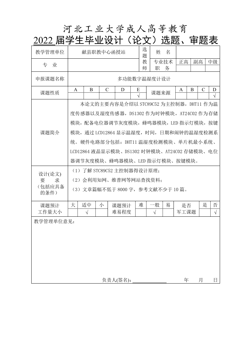 河北工业大学成人高等教育2022届学生毕业设计(论文)选题、审题表教学管理单位献县职教中心函授站选姓名专业教专业技术正高副高中级职务申报课题名称多功能数字温湿度计设计ABCDE课题来源B课题性质本论文的主要内容是介绍以STC89C52为主控制器,DHT11作为温度传感器以及湿度传感器,DS1302作为时钟模块,AT24C02作为存储模块,配备电位器调节灰度模块,蜂鸣器模块,LED指示灯模块,按键课题简介模块,通过LCD12864显示温湿度,时间,日期和闹钟的温湿度检测系统。硬件电路部分包括:DHT11温湿度检测模块、单片机最小系统、LCD12864液晶显示模块、DS1302时钟模块、AT24C02存储模块、电位器调节灰度模块、蜂鸣器模块、LED指示灯模块、按键模块。设计(论文)(1)了解STC89C52主控制器得设计原理;要求(2)会利用知网、维普网等网站查找资料:(包括应具备的条件)(3)文章篇幅不低于8000字,参考文献不少于10篇。课题预计大适中小课题预计难般易是否是工作量大小难易程度军工课题教学管理单位意见:负责人(签名):年月日1、课题性质一栏填写:A.工程设计;B.工程技术研究;C.软件工程(如CAI课题等);D.文献型综述;E.其它。2、课题来源一栏填写:A.自然科学基金与部、省、市级以上科研课B.企、事业单位委托课题;C.校、院(系)级基金课题;D.自拟课题。3、课题简介一栏填写:主要指研究设计该课题的背景介绍及目的、意义。4、论文(设计)要求一栏填写:主要指本课题技术方面的要求,而“条件”指从事该课题必须应具备的基本条件(如仪器设备、场地、文献资料等)。5、工作量大小一栏填写:A.大B.适中C.小6、难易程度一栏填写:A.难B.一般