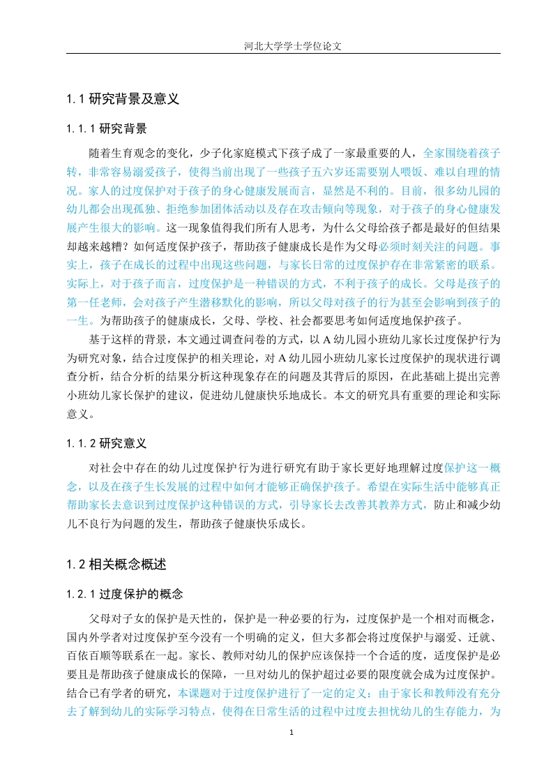 河北大学学士学位论文1.1研究背景及意义1.1.1研究背景随着生育观念的变化,少子化家庭模式下孩子成了一家最重要的人,全家围绕着孩子转,非常容易溺爱孩子,使得当前出现了一些孩子五六岁还需要别人喂饭、难以自理的情况。家人的过度保护对于孩子的身心健康发展而言,显然是不利的。目前,很多幼儿园的幼儿都会出现孤独、拒绝参加团体活动以及存在攻击倾向等现象,对于孩子的身心健康发展产生很大的影响。这一现象值得我们所有人思考,为什么父母给孩子都是最好的但结果却越来越糟?如何适度保护孩子,帮助孩子健康成长是作为父母必须时刻关注的问题。事实上,孩子在成长的过程中出现这些问题,与家长日常的过度保护存在非常紧密的联系。实际上,对于孩子而言,过度保护是一种错误的方式,不利于孩子的成长。父母是孩子的第一任老师,会对孩子产生潜移默化的影响,所以父母对孩子的行为甚至会影响到孩子的生。为帮助孩子的健康成长,父母、学校、社会都要思考如何适度地保护孩子。基于这样的背景,本文通过调查问卷的方式,以A幼儿园小班幼儿家长过度保护行为为研究对象,结合过度保护的相关理论,对A幼儿园小班幼儿家长过度保护的现状进行调查分析,结合分析的结果分析这种现象存在的问题及其背后的原因,在此基础上提出完善小班幼儿家长保护的建议,促进幼儿健康快乐地成长。本文的研究具有重要的理论和实际意义。1.1.2研究意义对社会中存在的幼儿过度保护行为进行研究有助于家长更好地理解过度保护这一概念,以及在孩子生长发展的过程中如何才能够正确保护孩子。希望在实际生活中能够真正帮助家长去意识到过度保护这种错误的方式,引导家长去改善其教养方式,防止和减少幼儿不良行为问题的发生,帮助孩子健康快乐成长。1.2相关概念概述1.2.1过度保护的概念父母对子女的保护是天性的,保护是一种必要的行为,过度保护是一个相对而概念,国内外学者对过度保护至今没有一个明确的定义,但大多都会将过度保护与溺爱、迁就、百依百顺等联系在一起。家长、教师对幼儿的保护应该保持一个合适的度,适度保护是必要且是帮助孩子健康成长的保障,一旦对幼儿的保护超过必要的限度就会成为过度保护。结合已有学者的研究,本课题对于过度保护进行了一定的定义:由于家长和教师没有充分去了解到幼儿的实际学习特点,使得在日常生活的过程中过度去担忧幼儿的生存能力,为1河北大学学士学位论文了保证幼儿的身心安全,对幼儿所选择的一种不良的行为方式。1.2.2家长过度保护的类型我国学者在对这方面开展研究工作的过程中,关于家长过度保护的形式进行了一定的分类,主要包含心理和生理这两个方面。对于幼儿心理方面的过度保护,主要体现在家长等对于幼儿生存能力方面的担忧,为了不让幼儿受到社会不良信息以及槽粕文化的侵害所选择的一种保守的过度保护方式。对于幼儿生理方面的过度保护,指的是家长等所采取的相关方式来避免幼儿的身体方面受到侵害,主要包括限制幼儿的日常行为活动等,这些做法会导致幼儿的自主能力发展受到一定的限制,不利于幼儿的健康成长。事实上,过度保护是一种非常错误的保护方式,会导致对幼儿自身的保护能力产生不利影响,对幼儿的身心健康发展不利,使幼儿难以尽快适应社会环境国外一些学者在幼儿过度保护方面也开展了一系列的研究,心理学家鲍姆林特将家庭教育过程中的过度保护进行分类,主要包括权威型、宽容型和专制型这三种类型。其中,权威型的过度保护对于父母与孩子之间的平等关系较为重视,要求父母能够真正去尊重孩子,与孩子处于平等的地位,在日常生活中,为孩子树立榜样:宽容型的过度保护状态下,父母会去尊重孩子的想法,但是对于孩子的发展没有原则性,对于孩子没有要求:专制型过度保护状态下,父母对孩子缺乏尊重,强制性的要求孩子去服从自己,不允许孩子有自己的想法,这种亲子关系的交往是不平等的。2河北大学学士学位论文2.2.2专制型过度保护现状在此次调查中也发现,一些家长将自己的意志强加到幼儿身上,自认为这件事是有害的,所以不让幼儿做,看似是爱护,其实是一种过于专制的病态现象,这从身心发展角度来看,根本上阻断了幼儿好奇心的发展,削弱了儿童主动探索新事物的兴趣。案例2:孩子:妈妈,我可以去玩泥巴吗?家长:不可以,太脏了。孩子:妈妈,可是其他的小朋友都可以玩,他们怎么不嫌脏啊?家长:他们不怕脏!孩子:妈妈,我也不怕脏,我可以玩吗?家长:不可以,你不仅要离这些泥巴远点,还要离这些玩泥巴的小朋友远点,他们太脏了,不要跟他们玩。孩子哭求着,家长仍然拒绝,最后把孩子带走。从这里可以直观的看出,家长和子女的意愿并不相同,大部分父母也同案例中的家长一样,也是如此做法。这种亲子关系的维护往往不长久,而健康和谐的亲子关系是永远是在相互尊重的前提下才能建立起来的,过于专断保护只能适得其反。