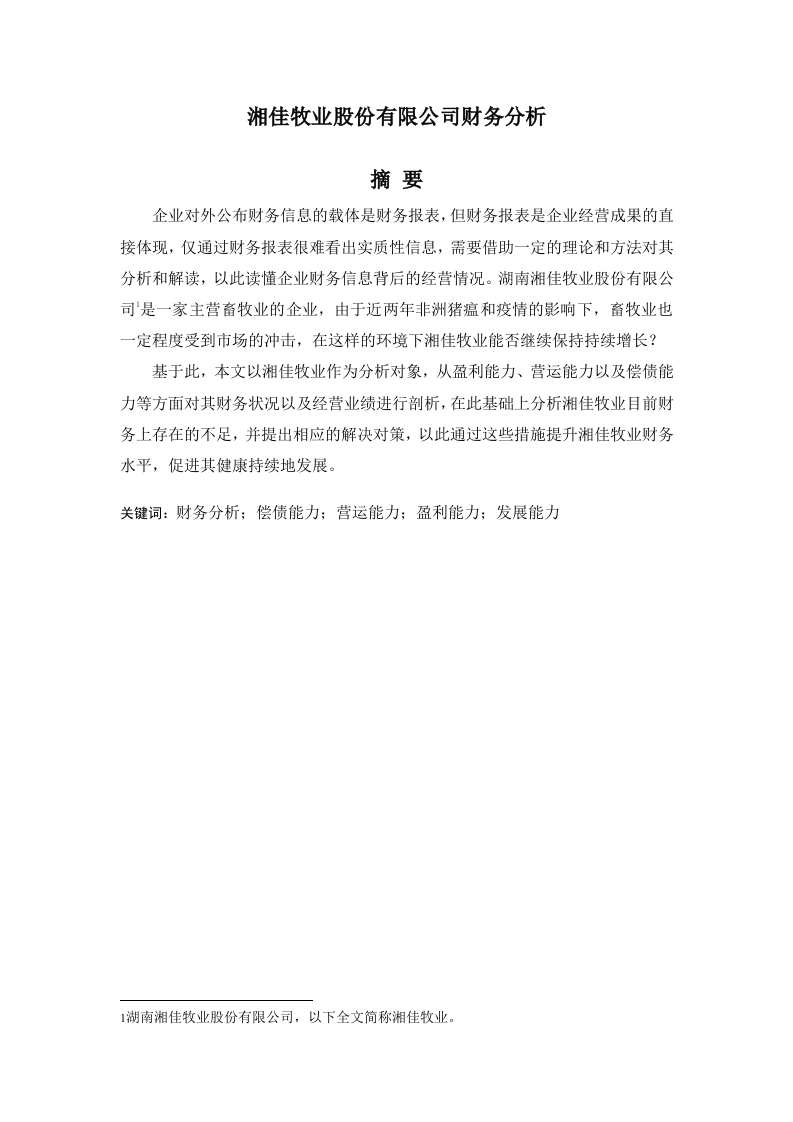 湘佳牧业股份有限公司财务分析摘要企业对外公布财务信息的载体是财务报表,但财务报表是企业经营成果的直接体现,仅通过财务报表很难看出实质性信息,需要借助一定的理论和方法对其分析和解读,以此读懂企业财务信息背后的经营情况。湖南湘佳牧业股份有限公司是一家主营畜牧业的企业,由于近两年非洲猪瘟和疫情的影响下,畜牧业也一定程度受到市场的冲击,在这样的环境下湘佳牧业能否继续保持持续增长?基于此,本文以湘佳牧业作为分析对象,从盈利能力、营运能力以及偿债能力等方面对其财务状况以及经营业绩进行剖析,在此基础上分析湘佳牧业目前财务上存在的不足,并提出相应的解决对策,以此通过这些措施提升湘佳牧业财务水平,促进其健康持续地发展。关键词:财务分析;偿债能力:营运能力:盈利能力:发展能力1湖南湘佳牧业股份有限公司,以下全文简称湘佳牧业。ABSTRACTThe carrier of an enterprise's external financial information is the financialstatement,but the financial statement is the direct manifestation of the business resultsof the enterprise.It is difficult to see the substantive information only through thefinancial statement.It needs to be analyzed and interpreted with the help of certaintheories and methods to understand it.The business behind the company's financialinformation.Hunan Xiangjia Animal Husbandry Co.,Ltd.is an enterprise mainlyengaged in animal husbandry.Due to the influence of African swine fever and theepidemic in the past two years,animal husbandry has also been impacted by themarket to a certain extent.In such an environment,Xiangjia Animal Husbandry canWill it continue to grow continuously?Based on this,this paper takes Xiangjia Animal Husbandry as the analysis object,analyzes its financial status and operating performance from the aspects ofprofitability,operating ability and solvency,and analyzes the current financialdeficiencies of Xiangjia Animal Husbandry on this basis.,and put forwardcorresponding countermeasures,so as to improve the financial level of XiangjiaAnimal Husbandry and promote its healthy and sustainable development throughthese measures.Key words:financial analysis;solvency;operating ability;profitability;developmentability目录ABSTRACT21、引言…32、湘佳牧业股份有限公司财务分析2.1湘佳牧业简介442.1.2湘佳牧业财务状况42.2湘佳牧业财务分析.2.2.1偿债能力分析2.2.2营运能力分析.2.2.3盈利能力分析…2.2.4发展能力分析.…3、湘佳牧业财务状况存在的问题及对策研究93.1重资产拖累了企业的业绩…3.2成本控制能力偏低93.3资产利用效率低…4、改善湘佳牧业财务状况的对策…114.1积极地推进产业升级转型、合理控制资产规模4.2加强预算、提升成本控制能力…4.3提升资产使用效率1213参考文献.14