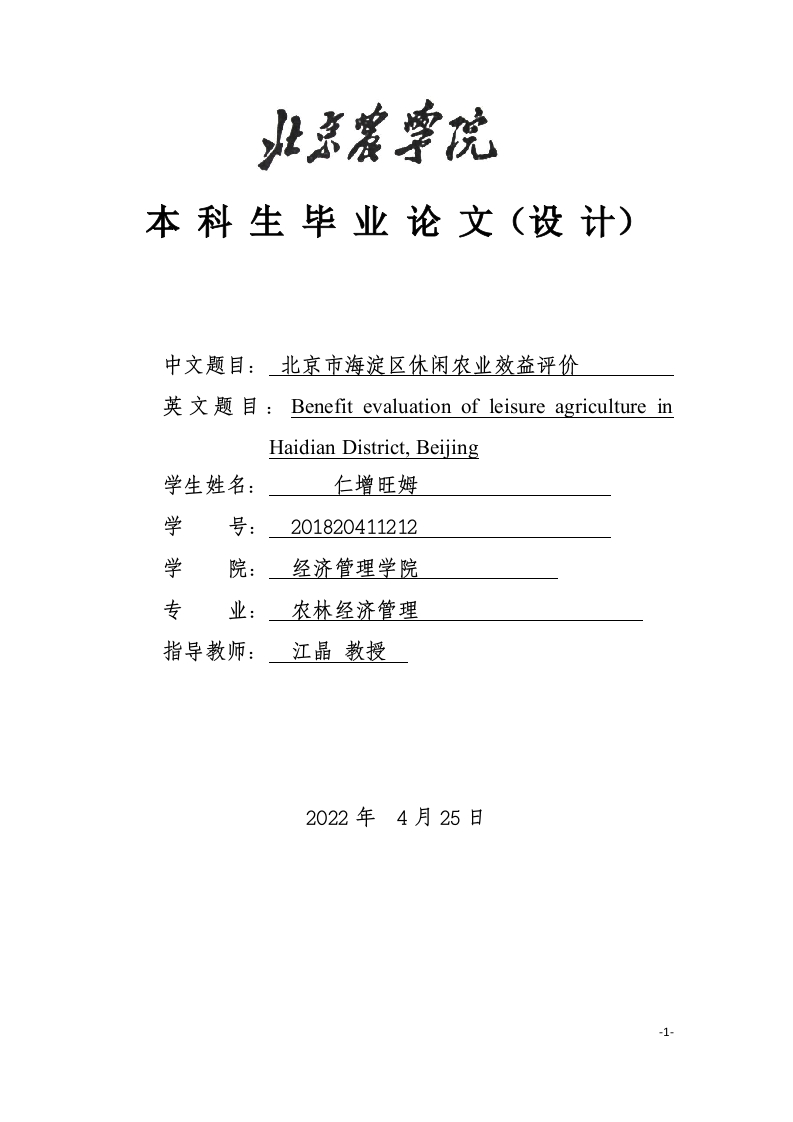 本科生毕业论文(设计)中文题目:北京市海淀区休闲农业效益评价英文题目:Benefit evaluation of leisure agriculture inHaidian District,Beijing学生姓名:仁增旺姆学号:201820411212学院:经济管理学院专业:农林经济管理指导教师:江晶教授2022年4月25日1摘要:在北京市大力推进乡村振兴,促进产业融合发展和深化乡村休闲旅游的大背景下,本文以北京市海淀区的五个城镇共40个乡村为研究对象,通过对接待人次、收入、劳动生产率、土地生产率、本地从业人员占从业人员比重、采摘收入占总收入比重和出售农产品收入占总收入比重等反映乡村休闲旅游竞争力的评价指标采用因子分析法进行信息浓缩,提取出反映竞争力发展水平的共同因子,即经营情况、产出情况和劳动情况。为保证结果的准确性,通过文献分析、听取20位农业农村旅游发展专家和相关人士的意见,采用AP和因子分析分析相结合的方法得到共同因子与竞争力总体水平和评价指标与共同因子的对应权重,最终求得五个乡镇在经营情况、产出情况和劳动情况三个层面的具体水平和乡村休闲旅游的总体水平,找出各乡镇在发展乡村休闲旅游过程中的薄弱环节,并提出建设意见。关键词:海淀区休闲农业;评价指标体系;因子分析法;层次分析法;效益评价Abstract:Under the background of Beijing vigorously promotingrural revitalization,promoting integrated industrial developmentand deepening rural leisure tourism,this paper takes a total of 40villages in five towns in Beijing Haidian District as the researchobject.Through to the reception of visitors,revenue,laborproductivity and land productivity and local staff personnelproportion of revenue,picking accounted for the proportion ofrevenue and selling agricultural products accounted for theproportion of reflection of rural leisure tourism competitivenessevaluation index such as concentration,using factor analysismethod to information to extract the common factors reflect thecompetitiveness level of development,Namely managecircumstance,output circumstance and labor circumstance.Inorder to ensure the accuracy of the results,by listening to theopinions of 20 agricultural and rural tourism development expertsand related people,AHP and factor analysis combined to obtainthe overall level of common factors and competitiveness,and thecorresponding weight of evaluation indicators and common factors.Finally,the specific level and the overall level of rural leisuretourism in the three levels of operation,output and labor of the fivevillages and towns are obtained,and the weak links in thedevelopment of rural leisure tourism are found out,and theconstruction suggestions are put forward.Key words:Leisure agriculture in Haidian District;Evaluationindex system;Factor analysis;Analytic hierarchy process;Benefitevaluation目录摘要1Abstract2第1章绪论31.1研究背景31.2研究目的与意义31.3国内外研究综述31.3.1国外研究综述1.3.2国内研究综述1.4研究思路与方法41.5研究内容与结构安排第2章休闲农业效益评价理论基础2.1重要概念界定与内涵2.1.1休闲农业2.1.2休闲农业效益评价2.2休闲农业效益评价支撑理论2.2.1农业多功能性理论2.3休闲农业效益评价基本特征2.3.1长远性2.3.2全面性3