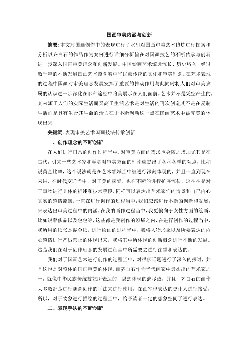 国画审美内涵与创新摘要:本文对国画创作中的表现进行了水里对国画审美艺术修炼进行探索和分析以齐白石的作品作为案例进行详细分析旨在对国画技艺的不断传承与创新进一步深入国画审美理念和创新发展。中国绘画艺术源远流长、历史悠久。经过数千年的不断发展国画艺术蕴含着中华民族传统的文化和审美理念。在艺术表现的过程中国画对审美理念发展发挥了重要的推动作用与此同时将人们对审美隶属的认识进一步深化在多种途径中将美展示在人们面前。艺术并不是凭空产生的,其来源于人们的实际生活而又高于生活艺术是对生活的再次创造其不是在复制生活而是具有生命其生命的活力在于不断创新这一点在国画艺术中被完美的体现出来关键词:表现审美艺术国画技法传承创新一、创作理念的不断创新在人们进行日常的创作过程当中,对审美方面的需求也会随之增加尤其是在古代,引来一些艺术家和学者对审美方面的理论就提出了各种各样的观点,比如说黄金比率,这个说法就是在艺术领域当中被进行深刻体现的,并且一直到现在来讲,在时代变迁当中,对于美的探索,也在不断的进行扩展流传,这往往是对于事物进行具体的描述和技术手段,同样可以表达出艺术家们的情景和自己内心真实的感情流露。一直在进行创作的过程当中,我们应该进行不断的创新和发展,来表达出审美过程中的内涵。在我的画作过程当中,我更偏向于女性方面的绘画,比如说奢侈品以及包包等,这些都是我创作的领域之内,在进行创作的过程当中,我所用的纸张是泥金纸,进行绘画的过程当中,我将人物形象以及所要表达的内心感情进行严厉禁止的体现出来,我将其中所体现的创新概念进行不断的发展。这是我们在对于创作理念的发展过程当中所需要去进行注重和表达的。我们对于国画艺术进行创作的过程当中,对很多话题进行了深入的探讨,并且这也是对整体的国画审美的体现,而齐白石作为当代画家中最杰出的艺术家之一,就像中华民族传统技艺所表达的,思想体现的漓尽致,并且,齐白石的画作大多数都是进行随意创作的手法来进行使用,在画室也表达的更让人进行接受,所以,对于物象进行描绘的过程当中,给予读者一定的想象空间了进行表达。二、表现手法的不断创新我们通过对创作理念上进行不断的创新来表达对应的表现手法,这是在进行中国画创作过程中的一大飞跃,同时,这也能够从齐白石先生的画作中进行淋漓尽致的体现出来,并且我们可以按照对应的理论来表达齐白石先生在毕生的创作生涯当中所塑造出的艺术形象和作品的体现。比如说可以画一些艺术作品青蛙以及雏鸡等,这些都是非常具有朴素和平淡的趣味,尤其是在对虾的画法过程当中,就经历了很多次的改变来进行形成的,而之后就在绘画的过程当中十分逼真,但是也不是其中所存在的情绪,因此,齐白石先生做出来的画作将表达出来的手法进行而深刻的创作,能够将各项变化进行淋漓尽致的体现出来。我们通过不断的创新和尝试,将在画作的过程当中各种人物形象进行淋漓尽致的体现出来,能够给予人以大气简单的感觉,而这些生活的形象,都是在进行不断融入的过程当中进行表现出来的,我们应该对其进行广泛的应用和写作,并且体现出国画在审美过程中所体现的内涵和创新精神。因此,在表达手段方面,我们一定要进行不断的创新和完善,来进行更加深刻的体现。我们可以发现,早期的齐白石在进行画作的过程当中,大多数都是通过临墓古人画作中的花鸟,在这个过程当中进行表现,并且在进行工笔的使用上非常的细腻和工整。尤其是在中期之后就开始进行随意使用,而齐白石先生在绘画技艺方面已经达到了一定炉火纯青的阶段,并没有去进行刻意的粉饰,而在这个作当中,能够将其中所体现的形象及其淋漓尽致的发挥出来,而这幅作品也就来源于对应的画作当中,所金鑫表达的意境,我们可以从中感受到画作当中所表达的含义以及内涵所在。我们通过进行创作的过程当中,将其中所表达的艺术语言进行履历尽致的体现出来,而使其不受到固有物理特性的制约而将其形成一体,进行各种风格和趣味的表达以及体现。我们在进行绘画的过程当中,与西方的风格相比,中国画整体而言就是追求理想的审美,并且可以将各种意识形式进行体现出来,不受固有物质的制约,能够将内涵进行表达,赋予其浓厚的风格特色和感情色彩。三、中国画的创作“意境”中国传统绘画艺术非常注重“意境”的表现,这主要是由中国传统的思维方式所决定的。“意境“是我国传统美学的一个重要范畴,是构成中国传统艺术审美的一个重要因素之一。意境论主张“以意为主”强调“表现”,但又要求寓“表述”于描述之中,使“意造境生”,令“山性即我性,山情即我情”“吾心即是宇宙”“宇宙即是吾心”通过“摄情”和“写貌物情”达到“摅发人思”,这种对“意境”的追求,促使国画家努力寻找一种符合自然精神的表现形式,并在艺术创作过程中追求自然的情趣美,将文学艺术中更深层次的美一一“意境”的表现融人到绘画作品中去,使作品显示出更深的内涵和更耐人寻味的“意念”与“情趣”。五代、两宋的山水画充分体现了这一追求。这一时期的画家深受唐代“诗画同源”,“诗中有画,画中有诗”的影响,在对自然的感悟中