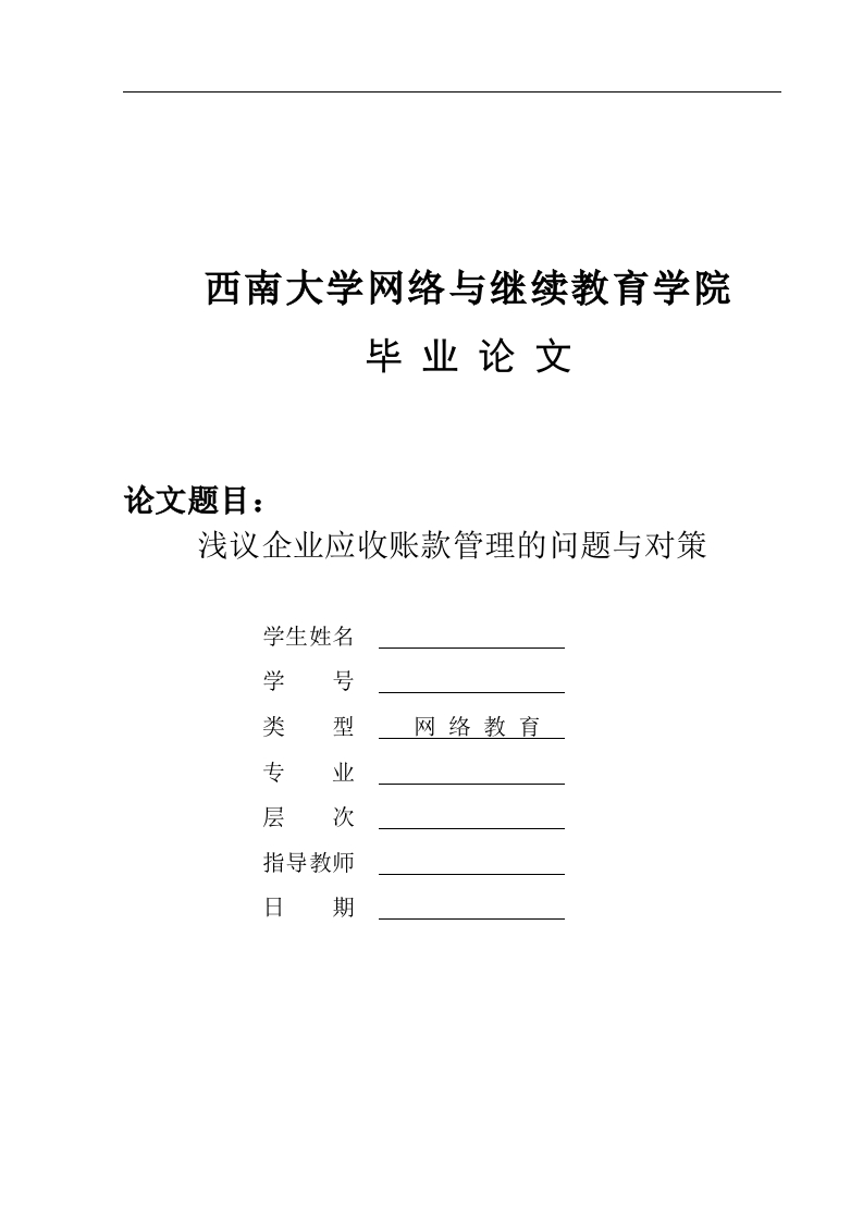 西南大学网络与继续教育学院毕业论文论文题目:浅议企业应收账款管理的问题与对策学生姓名学号类型网络教育专业层次指导教师日期摘要:应收账款对企业的发展有利也有弊,随着社会经济的不断发展,公司之间的竞争关系越来越大,从而导致企业过度的增加销售额,虽然有益于提高企业的销量,减少企业的产品积压,但也存在一定的风险性。怎样降低应收账款风险性,有效的进行应收账款管理,变为公司经营管理中的一个重要研究方向。文中将运用数据分析、账龄分析等方式对华为公司应收账款管理方法进行分析,从华为公司实际生产运营状况着手,与应收账款基本知识紧密联系,依靠检索相关文献开展多方面的探讨,并制定相对应的处理政策。本文采用案例的方式,以华为公司应收账款管理为研究对象,通过分析应收账款周转率和账龄,发现华为公司应收账款存在信用管理制度缺乏有效性、销售审批与模式选择不合理、催收效果不理想等问题,针对问题提出完善华为应收账款管的对策,为华为公司的应收账款管理的改革和创新提供有效的指导,并提高华为的核心竞争力。关键词:应收账款管理;应收账款周转率:应收账款账龄分析:华为公司目录23一、相关理论概述3(二)应收账款产生的原因..(四)应收账款管理的理论基础二、华为公司应收账款管理现状分析...6(二)华为应收账款管理现状分析...1.华为应收账款占资产比重分析....2.华为应收账款账龄分析...3.华为应收账款周转率分析..三、华为公司应收账款管理存在的问题.·(一)缺乏有效的信用管理制度..9(二)9(三)应收账款催收效果不理想.....10四、完善华为应收账款管理的对策..(一)搭建完善的信用管理体系..11(二)明确职责和完善内控制度..·1112