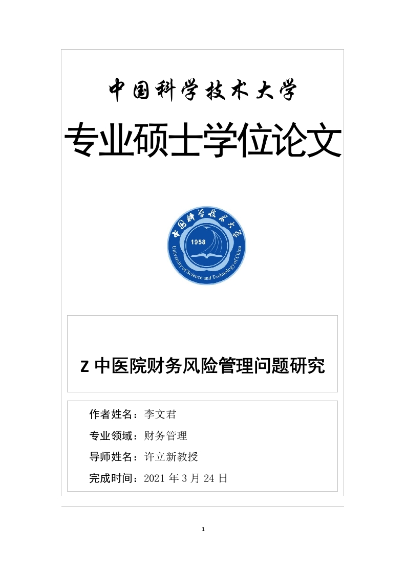 首页毕业论文范文模板Z中医院财务风险管理问题研究-李文君327