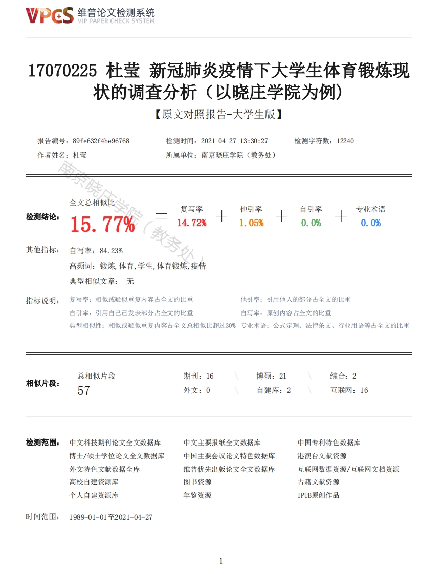 维普论文检测系统/IP PAPER CHECK SYSTEM17070225杜莹新冠肺炎疫情下大学生体育锻炼现状的调查分析(以晓庄学院为例)【原文对照报告-大学生版】报告编号:89fe632f4be96768检测时间:2021-04-2713:30:27检测字符数:12240作者姓名:杜莹所属单位:南京晓庄学院(教务处)复写率他引率自引率专业术语检测结论:15.77%14.72%1.05%0.0%0.0%其他指标:自写率:84.23%高频词:锻炼,体育,学生,体育锻炼,疫情典型相似文章:无指标说明:复写率:相似或疑似重复内容占全文的比重他引率:引用他人的部分占全文的比重自引率:引用自己已发表部分占全文的比重自写率:原创内容占全文的比重典型相似性:相似或疑似重复内容占全文总相似比超过30%专业术语:公式定理、法律条文、行业用语等占全文的比重总相似片段期刊:16博硕:21综合:2相似片段:57外文:0自建库:2互联网:16检测范围:中文科技期刊论文全文数据库中文主要报纸全文数据库中国专利特色数据库博士/硕士学位论文全文数据库中国主要会议论文特色数据库港澳台文献资源外文特色文献数据全库维普优先出版论文全文数据库互联网数据资源/互联网文档资源高校自建资源库图书资源古籍文献资源个人自建资源库年鉴资源IPUB原创作品时间范围:1989-01-01至2021-04-27维普论文检测系统VIP PAPER CHECK SYSTEM原文对照颜色标注说明:■自写片段■复写片段(相似或疑似重复)口引用片段(引用)晓■专业术语(公式定理、法律条文、行业用语等)分类号:(可不填)学院学校代码:11460学号:05403南京晓庄学院本科生毕业论文新冠肺炎疫情下大学生体育锻炼现状的调查分析(以晓庄学院为例)Investigation and analysis of the current situation of college students'physical exercise underCOVID-19 epidemic(Take Nanjing Xiaozhuang University as an example)所在院系:体育学院学生姓名:杜莹指导教师:曹钰研究起止日期:二O二O年十月至二O二一年五月学位论文独创性声明本人郑重声明:1.坚持以“求实、创新”的科学精神从事研究工作。2.本论文是我个人在导师指导下进行的研究工作和取得的研究成果。3.本论文中除引文外,所有实验、数据和有关材料均是真实的。4.本论文中除引文和致谢的内容外,不包含其他人或其它机构已经发表或撰写过的研究成果。5.其他同志对本研究所做的贡献均已在论文中作了声明并表示了谢意。作者签名:日期:年月新冠肺炎疫情下大学生体育锻炼现状的调查分析(以晓庄学院为例)【摘要】:为进一步提高大学生参与体育锻炼的积极性,提高自身身体素质,对疫情期间大学生参与体育锻炼的情况和影响因素等方面进行调查,并提出一些建议和对策,为疫情结束后高校体育工作的开展提供一些指导。本文主要通过文献资料法、访谈法、问卷调查法和数理统计法进行调查。结果表明,在新型冠状病毒肺炎疫情期间,大学生参加体育锻炼的动机发生了明显的变化,主要是为了强身健体、减肥塑形以及预防疾病。不同性别大学生对于参加体育锻炼的态度、参与锻炼的时长有显著差异。并且由于场地器材、个人自身、疫情等原因影响学生参与体2维普论文检测系统VIP PAPER CHECK SYSTEM育锻炼的兴趣。研究认为,提高学生参与体育锻炼的积极性还需要学生和学校之间的共同努力,以提高高校体育教学效果。【关键词】:新冠肺炎疫情:大学生:体育锻炼现状:调查[Abstract]:In order to further improve the enthusiasm of college students to participate inphysical exercise,improve their own physical quality,investigate the situation and influencingfactors of college students participating in physical exercise during the epidemic situation,andput forward some suggestions and countermeasures.To provide some guidance for the development ofphysical education in colleges and universities after the epidemic.This article mainly through theliterature method,the interview method,the questionnaire survey method and the mathematicalstatistics method carries on the investigation.The results showed that during the outbreak of newcoronavirus pneumonia,the motivation of college students to take part in physical exercise changedobviously,mainly in order to strengthen their health,lose weight and shape,and prevent diseases.There are significant differences in the attitude and duration of physical exercise among differentgenders.And because of the site equipment,individual,epidemic situation and other reasons affectstudents'interest in physical exercise.The study holds that improving students'enthusiasm toparticipate in physical exercise also requires joint efforts between students and schools in orderto improve the effect of physical education teaching in colleges and universities.[Key words ]COVID -19 outbreak;College students;Current situation of physical exercise;Investigation目录1前言1务处1.1选题依据11.2研究目的与意义11.3相关研究的文献综述21.3.1当代大学生体育锻炼情况的研究21.3.2影响当代大学生体育锻炼的因素22研究对象与方法22.1研究对象22.2研究方法22.2.1文献资料法22.2.2问卷调查法22.2.3访谈法32.2.4数理统计法33结果与分析33.1疫情期间晓庄学院学生体育锻炼情况33.1.1疫情期间晓庄学院学生参加体育锻炼的年级和性别情况分布33.1.2疫情期间晓庄学院学生参加体育锻炼的时间情况分析33.1.3疫情期间晓庄学院学生参加体育锻炼的项目和场地的选择43.1.4疫情期间晓庄学院学生参与体育锻炼的形式63.1.5疫情期间晓庄学院学生参加体育锻炼的动机63.1.6疫情期间晓庄学院学生参加体育锻炼的频次情况分析73.1.7疫情期间晓庄学院学生参