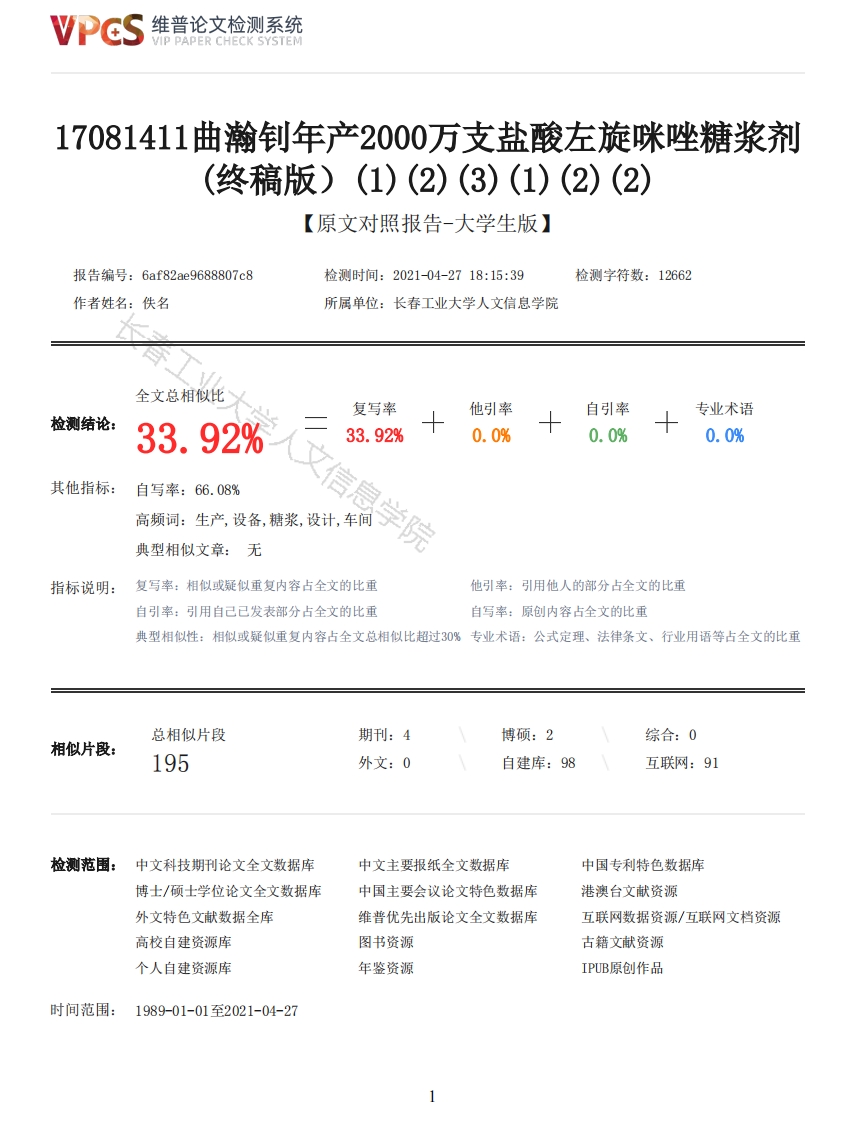 维普论文检测系统/IP PAPER CHECK SYSTEM17081411曲瀚钊年产2000万支盐酸左旋咪唑糖浆剂终稿版)(1)(2)(3)(1)(2)(2)【原文对照报告-大学生版】报告编号:6af82ae9688807c8检测时间:2021-04-2718:15:39检测字符数:12662作者姓名:佚名所属单位:长春工业大学人文信息学院全文总相似比复写率他引率自引率专业术语检测结论:33.92%33.92%0.0%0.0%0.0%其他指标:自写率:66.08%高缬词:生产设备,糖浆,设计,车间典型相似文章:无指标说明:复写率:相似或疑似重复内容占全文的比重他引率:引用他人的部分占全文的比重自引率:引用自己已发表部分占全文的比重自写率:原创内容占全文的比重典型相似性:相似或疑似重复内容占全文总相似比超过30%专业术语:公式定理、法律条文、行业用语等占全文的比重总相似片段期刊:4博硕:2综合:0相似片段:195外文:0自建库:98互联网:91检测范围:中文科技期刊论文全文数据库中文主要报纸全文数据库中国专利特色数据库博士/硕士学位论文全文数据库中国主要会议论文特色数据库港澳台文献资源外文特色文献数据全库维普优先出版论文全文数据库互联网数据资源/互联网文档资源高校自建资源库图书资源古籍文献资源个人自建资源库年鉴资源IPUB原创作品时间范围:1989-01-01至2021-04-27维普论文检测系统VIP PAPER CHECK SYSTEM原文对照颜色标注说明:■自写片段■复写片段(相似或疑似重复)口引用片段(引用)■专业术语(公式定理、法律条文、行业用语等)长春工业大学人文信息学院学毕业设计、毕业论文题目年产2000万支盐酸左旋咪唑糖浆的生产车间设计学院长春工业大学人文信息学院专业班级制药工程专业170814班指导教师(职称)李慧敏(讲师)姓名曲瀚钊2021年4月30日摘要盐酸左旋咪唑糖浆剂的主要成分是盐酸左旋咪唑。糖浆剂能掩盖药物的不良气味,改善口味,尤其受儿童欢迎。所以常用于驱虫。依据GMP的思想,盐酸左旋咪唑糖浆生产提供合理的生产工艺与车间布局。根据糖浆制剂车间设计的原则和规定科学有效地设计出年产2千万支250加L盐酸左旋咪唑糖浆的生产车间。对处方的设计、糖浆制剂工艺流程的设计以及物料衡算、工艺设备选型、车间设计和成本估算等进行了详细的研究和分析,并最终设计出有效可行的年产2千万支250mL盐酸左旋咪唑糖浆生产车间工艺。本设计严格遵守GMP规定,符合环保、经济、安全、技术等方面的要求。关键词GMP盐酸左旋咪唑糖浆生产工艺车间布局AbstractThe main component of levamisole hydrochloride syrup is levamisole hydrochloride.Syrup cancover up the bad smell of drugs and improve the taste,especially popular with children.So it'soften used as an insect repellent.According to the idea of GMP,reasonable production process and workshop layout are provided forthe production of levamisole hydrochloride syrup.According to the design principles and regulationsof syrup preparation workshop,a scientific and effective production workshop with an annual output2维普论文检测系统VIP PAPER CHECK SYSTEMof 20 million pieces of 250 ml levamisole hydrochloride syrup was designed.The prescription design,syrup preparation process design,material balance,process equipment selection,workshop design andcost estimation were studied and analyzed in detail.Finally,an effective and feasible productionworkshop with an annual output of 20 million 250ml levamisole hydrochloride syrup was designed.Thedesign strictly abides by GMP regulations and meets the requirements of environmental protection,economy,safety and technology.Key words GMP levamisole hydrochloride syrup production processworkshop layout目录第1章文献概述11.1产品介绍11.1.1盐酸左旋咪唑理化性质11.1.2性状11.1.3药理作用21.1.5适应症21.1.6不良反应21.1.7用法用量31.1.8规格31.1.9贮藏3第2章生产工艺设计42.1生产工艺流程42.2糖浆剂制备方法42.3处方分析5第3章物料衡算73.1物料衡算的基础73.2物料衡算的基准73.3物料衡算条件7第4章设备选型124.1工艺设备选型的步骤124.2工艺设备选型依据124.2.1制药设备材质的选择124.3设备选择124.3.1纯水制取设备及技术参数124.3.2溶糖锅设备选型134.3.3配液罐设备选型144.3.4过滤设备选型144.3.5泵设备选型154.3.6H计设备选型164.3.7封口机设备选型174.3.8灯检工作设备选型184.3.9洗瓶设备选型18第5章车间平面布置设计195.1车间布置的重要性195.2制药车间布置设计的特点195.3车间组成195.4车间布置设计的内容和步骤193