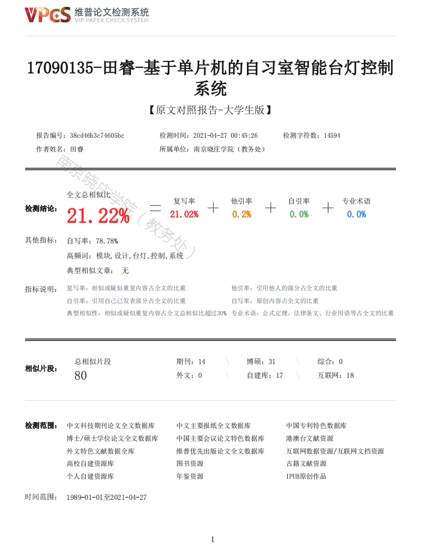 维普论文检测系统/IP PAPER CHECK SYSTEM17090135-田睿-基于单片机的自习室智能台灯控制系统【原文对照报告-大学生版】报告编号:38cd46b3c74605bc检测时间:2021-04-2700:45:26检测字符数:14594作者姓名:田容所属单位:南京晓庄学院(教务处)复写率他引率自引率专业术语检测结论:21.22%21.02%0.2%0.0%0.0%其他指标:自写率:78.78%高频词:模块,设计,台灯,控制,系统典型相似文章:无指标说明:复写率:相似或疑似重复内容占全文的比重他引率:引用他人的部分占全文的比重自引率:引用自己已发表部分占全文的比重自写率:原创内容占全文的比重典型相似性:相似或疑似重复内容占全文总相似比超过30%专业术语:公式定理、法律条文、行业用语等占全文的比重总相似片段期刊:14博硕:31综合:0相似片段:80外文:0自建库:17互联网:18检测范围:中文科技期刊论文全文数据库中文主要报纸全文数据库中国专利特色数据库博士/硕士学位论文全文数据库中国主要会议论文特色数据库港澳台文献资源外文特色文献数据全库维普优先出版论文全文数据库互联网数据资源/互联网文档资源高校自建资源库图书资源古籍文献资源个人自建资源库年鉴资源IPUB原创作品时间范围:1989-01-01至2021-04-27维普论文检测系统VIP PAPER CHECK SYSTEM原文对照颜色标注说明:■自写片段■复写片段(相似或疑似重复)口引用片段(引用)■专业术语(公式定理、法律条文、行业用语等)分类号:学校代码:11460学号:17090135南京晓庄学院本科生毕业论文基于单片机的自习室智能台灯控制系统Intelligent desk lamp control system of studyroom based on single chip microcomputer所属学院:电子工程学院学生姓名:田睿指导教师:王鹏职称:讲师研究起止日期:二0二0年十二月至二。二一年四月二0二一年四月学位论文独创性声明本人郑重声明:1。坚持以“求实、创新”的科学精神从事研究工作。2。本论文是我个人在导师指导下进行的研究工作和取得的研究成果。3。本论文中除引文外,所有实验、数据和有关材料均是真的。4。本论文中除引文和致谢的内容外,不包含其他人或其它机构已经发表或撰写过的研究成果。5。其他同志对本研究所做的贡献均已在论文中作了声明并表示了谢意。作者签名:日期:【摘要】随着绿色节能理念的不断深入,人们对学习环境方面要求越来越高,普通自习室在许多方面还不能达到人们的需求,因此对自习室智能化进行研究。本设计以STM32F103RBT6单片机为核心,由光敏传感器通过外界光信号的强弱和人体红外传感器来产生电压信号,当人体在台灯的感应范围内且环境光较弱时,自动感应开关:灯亮的同时开始计时即记录学习时长,人离开座位时停止计时,台灯熄灭。座位上台灯亮灭情况和学习时长将通过蓝牙传输给教室管理者,同时可以远程手动控制灯的亮灭和故障报警。通过最终测试,本次毕业设计能成功完成以上功能。【关键词】:STM32F103RBT6单片机:传感器:蓝牙[Abstract]With the continuous deepening of the concept of green energy saving,people have higher andhigher requirements for the learning environment.The ordinary study room cannot meet people's needs2维普论文检测系统VIP PAPER CHECK SYSTEMin many aspects,so the study of the intelligence of the study room is carried out.This design isbased on the STM32F103RBT6 single-chip microcomputer.The photosensitive sensor generates a voltagesignal through the intensity of the external light signal and the infrared sensor of the human body.When the human body is within the range of the desk lamp and the ambient light intensity is weak,theautomatic induction switch;the light starts at the same time Timing means recording the length oflearning.When the person leaves the seat,the timer stops and the lamp goes out.The on and offstatus of the lamp on the seat and the length of study will be transmitted to the classroom managervia Bluetooth.At the same time,the on and off of the lamp and the fault alarm can be manuallycontrolled remotely.Through the final test,this graduation design can accomplish the abovefunctions.[Key words]STM32F103RBT6MCU:Sensor:Bluetooth目录1概述11.1研究背景11.2设计的主要意义1e2元器件选型32.1单片机的选型32.2蓝牙模块32.3传感器模块43系统硬件电路设计63.1硬件概述63.2系统硬件设计63.2.1核心模块设计63.2.2下载电路模块设计73.2.3复位电路模块设计83.2.4蜂鸣器电路模块设计83.2.5电源电压转换模块设计93.2.6晶振模块设计103.3传感器模块103.3.1红外传感器电路设计103.3.2环境亮度检测传感器电路设计113.4蓝牙模块113.5DS1302时钟模块123.6灯光调节模块设计123.7液晶显示器模块134PCB设计144.1台灯模块PCB设计144.2远程控制端模块PCB设计154.3PCB板走线155系统软件设计175.1主要功能程序设计186焊接与调试216.1STM32芯片的焊接216.2蓝牙模块调试216.3基础模块调试22总结243