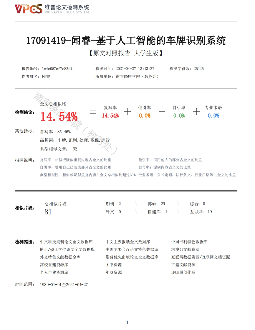 维普论文检测系统/IP PAPER CHECK SYSTEM17091419-闻睿-基于人工智能的车牌识别系统【原文对照报告-大学生版】报告编号:1c4e057cf7e83d7e检测时间:2021-04-2713:13:27检测字符数:25425作者姓名:闻睿所属单位:南京晓庄学院(教务处)全文总相似比复写率他引率自引率专业术语检测结论:14.54%14.54%0.0%0.0%0.0%其他指标:自写率:85.46%高频词:车牌,识别,处理,图像,进行典型相似文章:无指标说明:复写率:相似或疑似重复内容占全文的比重他引率:引用他人的部分占全文的比重自引率:引用自己已发表部分占全文的比重自写率:原创内容占全文的比重典型相似性:相似或疑似重复内容占全文总相似比超过30%专业术语:公式定理、法律条文、行业用语等占全文的比重总相似片段期刊:2博硕:29综合:0相似片段:81外文:0自建库:1互联网:49检测范围:中文科技期刊论文全文数据库中文主要报纸全文数据库中国专利特色数据库博士/硕士学位论文全文数据库中国主要会议论文特色数据库港澳台文献资源外文特色文献数据全库维普优先出版论文全文数据库互联网数据资源/互联网文档资源高校自建资源库图书资源古籍文献资源个人自建资源库年鉴资源IPUB原创作品时间范围:1989-01-01至2021-04-27维普论文检测系统VIP PAPER CHECK SYSTEM原文对照颜色标注说明:■自写片段■复写片段(相似或疑似重复)口引用片段(引用)■专业术语(公式定理、法律条文、行业用语等)分类号:学校代码:11460学号:17091419晓庄学院南京晓庄学院本科生毕业论文基于人工智能的车牌识别系统License Plate Recognition SystemBased on Artificial Intelligence所属学院:电子工程学院学生姓名:闻容指导教师:刘华职称:讲师研究起止日期:二。二。年十一月至二。二一年五月二。二一年五月学位论文独创性声明本人郑重声明:1.坚持以“求实、创新”的科学精神从事研究工作。2.本论文是我个人在导师指导下进行的研究工作和取得的研究成果。3.本论文中除引文外,所有实验、数据和有关材料均是真的。4.本论文中除引文和致谢的内容外,不包含其他人或其它机构已经发表或撰写过的研究成果。5.其他同志对本研究所做的贡献均已在论文中作了声明并表示谢意。作者签名:日期:2021年5月摘要本设计针对汽车车牌识别这一特定的应用环境,利用ANN与计算机视觉相结合的方法来解决字符识别问题。根据字符识别这一特定的应用场景,本文收集了专门的车牌样本集来训练字符识别模型,采用神经网络特征提取与匹配算法,通过Python.与OpenCV视觉库相结合,实现一个车牌识别的字符识别系统。经过实践检验,本设计所使用的方法在现实场景下对车牌进行识别检测,实验结果切实有效,基本能够达到对车牌检测及字符识别的要求。【关键字】字符识别,车牌识别,AN,SM,OpenCVAbstractThis design is aimed at the specific application environment of automobile license plate2维普论文检测系统VIP PAPER CHECK SYSTEMrecognition,and uses the method of combining ANN and computer vision to solve the problem ofcharacter recognition.According to the specific application scenario of character recognition,thispaper collects and designs a special sample set of license plate to train the character recognitionmodel.In this paper,the feature extraction and matching algorithm of neural network is used.Alicense plate recognition system is realized by combining Python with OpenCV visual library.Thealgorithm used in this paper is tested in the actual license plate character recognition environmentAfter practical tests,the method used in this design is used to identify and detect licenseplates in real scenarios.The experimental results are practical and effective,and can basicallymeet the requirements for license plate detection and character recognition.[Key words character recognition,license plate recognition,ANN,SVM,OpenCV目录目录I1绪论11.1课题背景和意义11.2研究现状11.3主要研究内容22基本原理32.1概述32.2机器学习方法32.2.1神经网络原理3庄学院(教务处)2.2.2SM(支持向量机)原理42.3图像处理方法52.3.1模糊处理原理52.3.2Sobe1算子原理62.3.3二值化处理原理62.3.4闭操作处理原理73系统总体方案设计83.1设计思路83.2设计内容84系统具体方案实现114.1车牌定位部分114.2SVM模型训练144.3字符识别部分174.4ANN模型训练194.5本章小结215调试与验证225.1软件和硬件平台225.2功能验证235.3结果展示245.4本章小结356总结与展望366.1总结366.2今后研究方向36参考文献38致谢40附录41程序主要部分413