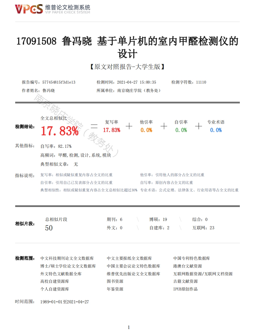 维普论文检测系统/IP PAPER CHECK SYSTEM17091508鲁冯晓基于单片机的室内甲醛检测仪的设计【原文对照报告-大学生版】报告编号:577454815f3d1e13检测时间:2021-04-2715:00:35检测字符数:11110作者姓名:鲁冯晓所属单位:南京晓庄学院(教务处)复写率他引率自引率专业术语检测结论:17.83%17.83%0.0%0.0%0.0%其他指标:自写率:82.17%教务处高频词:甲醛,检测,设计,系统,模块典型相似文章:无指标说明:复写率:相似或疑似重复内容占全文的比重他引率:引用他人的部分占全文的比重自引率:引用自己已发表部分占全文的比重自写率:原创内容占全文的比重典型相似性:相似或疑似重复内容占全文总相似比超过30%专业术语:公式定理、法律条文、行业用语等占全文的比重总相似片段期刊:6博硕:19综合:0相似片段:50外文:0自建库:2互联网:23检测范围:中文科技期刊论文全文数据库中文主要报纸全文数据库中国专利特色数据库博士/硕士学位论文全文数据库中国主要会议论文特色数据库港澳台文献资源外文特色文献数据全库维普优先出版论文全文数据库互联网数据资源/互联网文档资源高校自建资源库图书资源古籍文献资源个人自建资源库年鉴资源IPUB原创作品时间范围:1989-01-01至2021-04-27维普论文检测系统VIP PAPER CHECK SYSTEM原文对照颜色标注说明:■自写片段■复写片段(相似或疑似重复)口引用片段(引用)■专业术语(公式定理、法律条文、行业用语等)分类号:学院学校代码:11460学号:17091508南京晓庄学院本科生毕业论文基于单片机的室内甲醛检测仪设计教务处Design of Indoor Formaldehyde Detector Based on Single Chip Microcomputer所属学院:电子工程学院学生姓名:鲁冯晓指导教师:张素玲职称:讲师研究起止日期:二。二。年十月至二。二一年五月二。二一年五月学位论文独创性声明本人郑重声明:1.坚持以“求实,创新”的科学精神从事研究工作。2.本论文是我个人在导师指导下进行的研究工作和取得的研究成果。3.本论文中除引文外,所以实验、数据和有关材料均是真实的。4.本论文中除引文和致谢的内容外,不包含其他人或其他机构已经发表或撰写过的研究成果。5.其他同志对本研究所做的贡献均已在论文中作了声明并表示了感谢。作者签名:鲁冯晓日期:2021年5月【摘要】本文设计的是一款室内便携甲醛浓度、温湿度一体化检测仪。本文所设计的甲醛检测仪是基于32位单片机STM32C8T6所进行设计的,整个系统包括$TM32最小系统、温湿度检测模块、甲醛检测模块、液晶显示器、蜂鸣器以及电源管理模块。液晶显示屏上能实时显示温湿度和甲醛浓度。当检测到的空气甲醛浓度超过预设值,便会触发警报。按下按键便可解除警报,甲醛浓度的预设值可以根据用户需求自行定义。【关键词】:甲醛气体:STM32C8T6:温湿度:室内[Abstract]This paper designs an indoor portable formaldehyde concentration,temperature and humidityintegrated detector.The formaldehyde detector designed in this paper is based on 32-bitmicrocontroller STM32C8T6.The whole system includes STM32 minimum system,temperature and humidity2维普论文检测系统VIP PAPER CHECK SYSTEMdetection senor,formaldehyde detection senor,liquid crystal display,hummer and Power Supply.Theliquid crystal display screen can display the temperature and humidity and formaldehydeconcentration in real time.An alarm is set off when the airborne formaldehyde concentration isdetected above a preset value.Press the button to remove the alarm,and the preset value offormaldehyde concentration can be denned according to user needs.[Keywords]:Formaldehyde gas:STM32C8T6;Temperature and humidity:indoor目录1绪论11.1研究背景以及现状11.2研究目的11.3研究的主要内容22系统总体设计方案42.1系统设计目标42.2整体架构设计42.3系统的工作流程53系统硬件设计63.1主控模块设计6庄学3.1.1STM32C8T6单片机简介6公3.1.2主控模块电路设计73.2LCD1602液晶显示模块设计83.2.1LCD1602显示模块简介83.2.2LC①1602液晶显示模块电路设计93.3甲醛气体传感器选择103.3.1甲醛浓度检测模块设计113.4温湿度检测模块设计123.4.1温湿度检测模块简介123.4.2温湿度检测模块设计133.5按键输入模块设计133.6系统低功耗设计144系统软件设计154.1软件开发环境简介154.2主程序设计164.3子程序设计174.3.1甲醛气体检测模块程序设计174.3.2温湿度检测模块程序设计175系统调试195.1硬件调试195.2调试与分析196总结与展望22参考文献23致谢24附录251绪论1.1研究背景以及现状早在几个世纪以前人们就已经研究室内空气质量检测,目前在检测甲醛这一有害气体上,无论是国内还是国外,研究人员一般使用的是色谱法、荧光法、电化学法以及传感器法等[1]。以上每一种检测方法没有明显的优缺点,在不同的场合下利用相应的方法可以事半功倍[1]。3