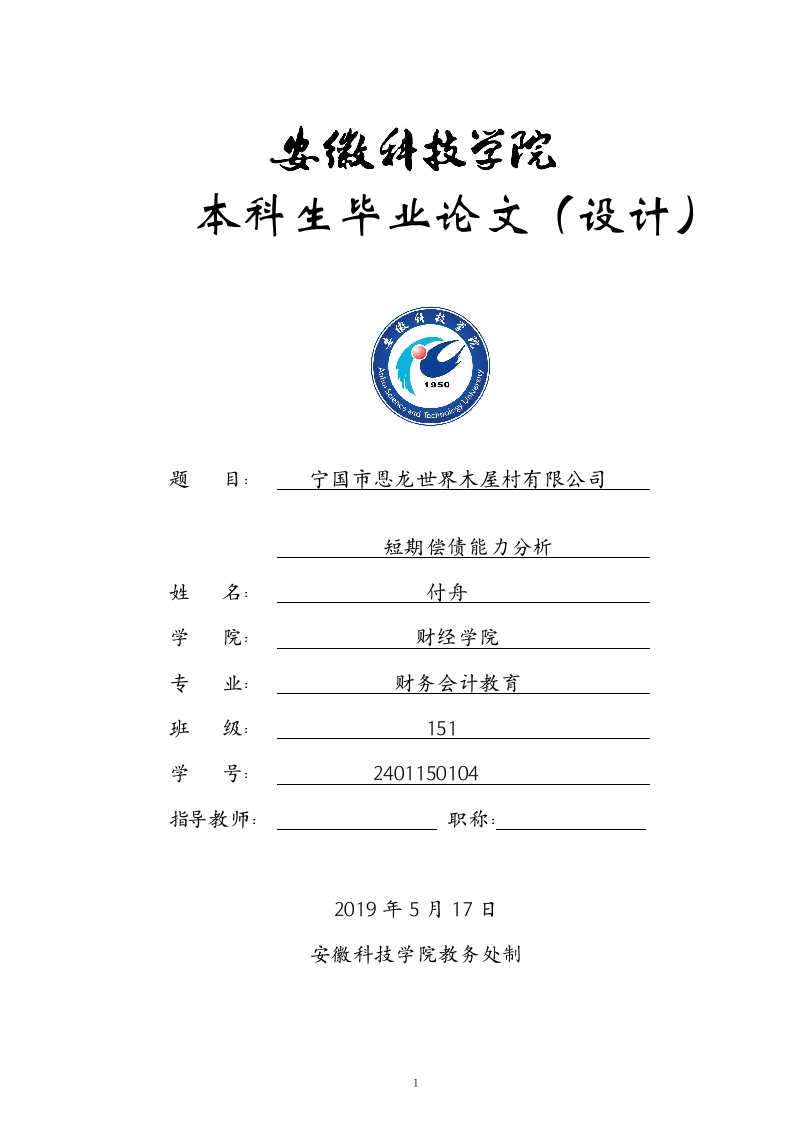 本科生毕业论文(设计)150题目:宁国市恩龙世界木屋村有限公司短期偿债能力分析姓名:付舟学财经学院专业财务会计教育班级:151学号:2401150104指导教师:职称:2019年5月17日安徽科技学院教务处制1目录(一)短期偿债能力分析的定义3(二)短期偿债能力的评价指标33445.现金流量比率.4(四)短期偿债能力的影响因素442.流动资产的规模及变现的速度45二、宁国市恩龙世界木屋村有限公司短期偿债能力分析...5(一)宁国市世界木屋村的基本概况.…5(二)宁国市恩龙世界木屋村有限公司短期偿债能力的分析·6三、宁国市恩龙世界木屋村短期偿债能力方面存在的问题及原因分析·8(一)宁国市恩龙世界木屋村有限公司短期偿债能力方面存在的问题882.负债比重不合理(二)宁国市恩龙世界木屋村有限公司短期偿债能力方面存在的问题成因分析.·91.企业经营收益不理想.·2.企业经营管理制定过失.·93.应收账款管理制度不完善99四、提高宁国市恩龙世界木屋村有限公司短期偿债能力的对策.···92.提高企业现金流动能力..3.加强对企业应收账款的管理104.加强对企业负债结构的管理10五、结论.10(二)展望不足11致谢参考文献:2宁国市恩龙世界木屋村有限公司短期偿债能力分析财务会计教育专业学生付舟指导教师摘要:在社会经济体制下,企业面临的环境越来越严峻。企业在短期偿债能力,直接或间接的影响着企业日常生产经营。企业的短期偿债能力是衡量企业财务状况的指标,同时它也是企业进行短期偿债能力分析的指标之一。本篇文章主要通过对宁国市恩龙世界木屋村有限公司的短期偿债能力的指标分析,来发现宁国市恩龙世界木屋村有限公司在财务方面存在分险,并适当给予有作用的建议。希望同行业能够结合自身实际进行合理有效的短期偿债能力的分析。关键词:短期偿债能力指标:流动比率:速动比率:现金比率:现金流量比率一、企业短期偿债能力的概述(一)短期偿债能力分析的定义短期偿债能力分析是指企业动用本企业自己的资产来偿还企业所欠货款的一种表现形式。它反映企业对债务偿还的能力。从债券人的角度看,他们比较重视企业资产是否能够偿还对他们的借款,只要企业有足够的资产才能对借款进行还本付息。从投资者的角度看,企业的负债如果比较大,投资者们则要考虑通过筹资等方式对企业的债务进行偿还。运用企业短期偿债能力对企业的日常的活动进行分析是比较合适的一种方式。(二)短期偿债能力的评价指标1.流动比率流动比率是指企业流动资产总额与流动负债总额之比。这个指标是反映企业的资产是否能够偿还企业所欠的债款的能力水平。计算公式如下:流动比率=流动资产/流动负债总体来说,流动比率越高,企业资产的流动性就越强,短期偿债能力也越强:反之则弱。一般流动比率应在2:1左右:企业的流动比率在2:1,说明该企业的资产能够对企业负债进行偿还。2.速动比率速动比率是指企业速动资产与流动负债的比率,速动比率又称“酸性测验比率”,速动比率是反映企业资产变现能力。对企业速动比率的分析有利益了解企业战略目标和经营风格。计算公式如下:速动比率=速动资产/流动负债其中,速动资产=流动资产-存货-预付账款-待摊费用普遍认为,速动比率在1:1较合适,这个比率范围是企业速动比率较为正常的区间,企业速动比率在这一范围内表示企业的短期偿债能力还是比较好的。3.营运资本3