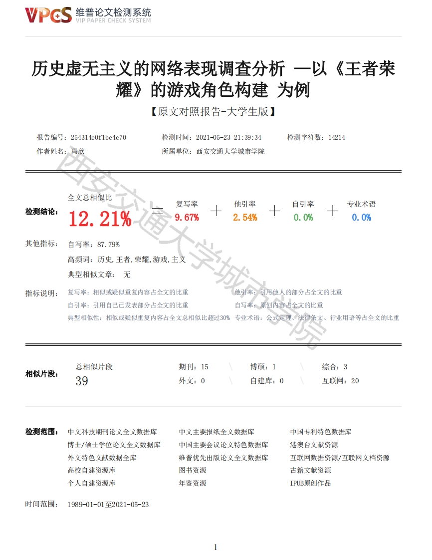 维普论文检测系统VIP PAPER CHECK SYSTEM历史虚无主义的网络表现调查分析一以《王者荣耀》的游戏角色构建为例【原文对照报告-大学生版】报告编号:254314e0f1be4c70检测时间:2021-05-2321:39:34检测字符数:14214作者姓名:冯欣所属单位:西安交通大学城市学院全文总相似比复写率他引率自引率专业术语检测结论:12.21%9.67%2.54%0.0%0.0%其他指标:自写率:87.79%高频词:历史,王者,荣耀,游戏,主义典型相似文章:无指标说明:复写率:相似或疑似重复内容占全文的比重他引率:引用他人的部分占全文的比重自引率:引用自己已发表部分占全文的比重自写率原创内容占全文的比重典型相似性:相似或疑似重复内容占全文总相似比超过30%专业术语:公式定理、法律涤文、行业用语等占全文的比重总相似片段期刊:15博硕:1综合:3相似片段:39外文:0自建库:0互联网:20检测范围:中文科技期刊论文全文数据库中文主要报纸全文数据库中国专利特色数据库博士/硕士学位论文全文数据库中国主要会议论文特色数据库港澳台文献资源外文特色文献数据全库维普优先出版论文全文数据库互联网数据资源/互联网文档资源高校自建资源库图书资源古籍文献资源个人自建资源库年鉴资源IPUB原创作品时间范围:1989-01-01至2021-05-23维普论文检测系统VIP PAPER CHECK SYSTEM原文对照颜色标注说明:■自写片段■复写片段(相似或疑似重复)口引用片段(引用)■专业术语(公式定理、法律条文、行业用语等)本科毕业设计论文市学院题目历史虚无主义的网络表现调查分析一以《王者荣耀》的游戏角色构建为例系别传播系专业网络与新媒体班级网媒171学号17092002学生姓名冯欣指导老师吴越2021年5月本科毕业设计(论文)任务书题目历史虚无主义的网络表现调查分析-一以《王者荣耀》的游戏角色构建为例姓名冯欣专业网络与新媒体学号170920021.毕业设计(论文)课题的主要任务现代科学技术的发展,移动互联网的普及,使得新兴媒介成为历史虚无主义新的寄生处和栖居地,《王者荣耀》它借助传统历史进行二次游戏构建,虽获得了大多数受众的支持与肯定,但《王者荣耀》为自身宣传的同时在一定程度上脱离了历史,本文为研究历史虚无主义的网络表现随后进行以下调查:2维普论文检测系统VIP PAPER CHECK SYSTEM本次调查报告对《王者荣耀》的历史游戏人物角色的构建进行调查梳理以及对比,分析《王者荣耀》历史虚无主义的表现与传播。随后采集外界媒体的反馈意见,以及制作调查表分析受众的具体看法,最后对《王者荣耀》历史虚无主义的网络表现进行总结和分析,以及分析历史虚无主义在网络层面的出现原因和提供对策。2.课题的具体工作内容(1)充分阅读研究文献,梳理调查的现状:(2)分析王者荣耀游戏人物二次创建及其历史虚无主义的表现:(3)采集各个媒介的报道看法:(4)制作调查问卷,调查广大受众的理解与接受,调查研究得出历史虚无主义的网络表现及相关影响:(5)得出研究结论,撰写不少于8000字的调查报告3.课题完成后提交的书面材料要求(1)调查报告字数:不少于8000字:参考论文:书册不得少于2册,文献不得少于8篇:(2)选题要与社会实际和专业领域密切相关:4.主要参考文献[1]赵爱霞.历史虚无主义的社会心理分析及其应对[J].思想教育研究,2020(05):62-67.[2]李迎.历史虚无主义的网络传播及治理研究[J].湘南学院学报,2020,41(06):24-26.[3]吴越,赵文龙.历史虚无主义的网络嬗变及其治理[J].思想教育研究,2020(10):93-95.[4]周玉,历史虚无主义网络传播的新特点及对策[J刀.马克思主义研究,2020(07):115-117.[5]熊燕华.历史虚无主义虚无历史人物的策略策略、动因及危害[J].思想教育研究,2018(09):55-57.[6]何威,李玥.戏假情真:《王者荣耀》如何影响玩家对历史人物的态度与认知[J刀.国际新闻界,2020,42(07):50-52.[7]熊文景.新媒体环境下历史虚无主义的传播及其应对[J].社会科学家,2019(10):157-159.[8]田霞,新宇.新媒体语境下历史虚无主义的演化与应对[J].人民论坛·学术前沿2019(11):124-125[9]钱春霞.主流媒体与“王者荣耀”:二次元文化传播中的媒体责任和价值引领[J刀.中国记者,2017(10):63-64.[10]传播学教程M].中国人民大学出版社,郭庆光著,1999[11]奥情研究概论M].天津社会科学院出版社,王来华,2003要求完成日期:年月日接受任务日期:年月日指导教师(签名):学生(签名):注:小四号宋体,1.25倍行距。内容不得超过2页或过少于1页。摘要摘要近年来,随着科技和大众传媒的发展。游戏作为第九艺术,也作为一种新兴发展的媒介,纷纷借助中国传统文化进行翻新创作。《王者荣耀》作为一款国民性的游戏,其受众基数大,媒介影响力大。本文从多个方面进行调查论证,以《王者荣耀》为例,探究历史虚无主义的网络表现下的演变和发挥消极影响的。首先,本文对《王者荣耀》的历史游戏人物角色进行调查梳理对比,分析《王者荣耀》历史虚无主义的表现与传播,采集外界媒介的传播反馈以及受众的看法,最后对《王者荣耀》历史虚无主义的网络表现进行总结和分析,分析历史虚无主义出现的原因以及提出应对的原因。关键词:历史虚无主义;网络环境:《王者荣耀》:人物二次构建ABSTRACTIn recent years,with the development of science and technology and mass media.Games,as theninth art and a newly developed medium,have been renovated and created with the help of Chinesetraditional culture.As a national game,the glory of the king has a large
