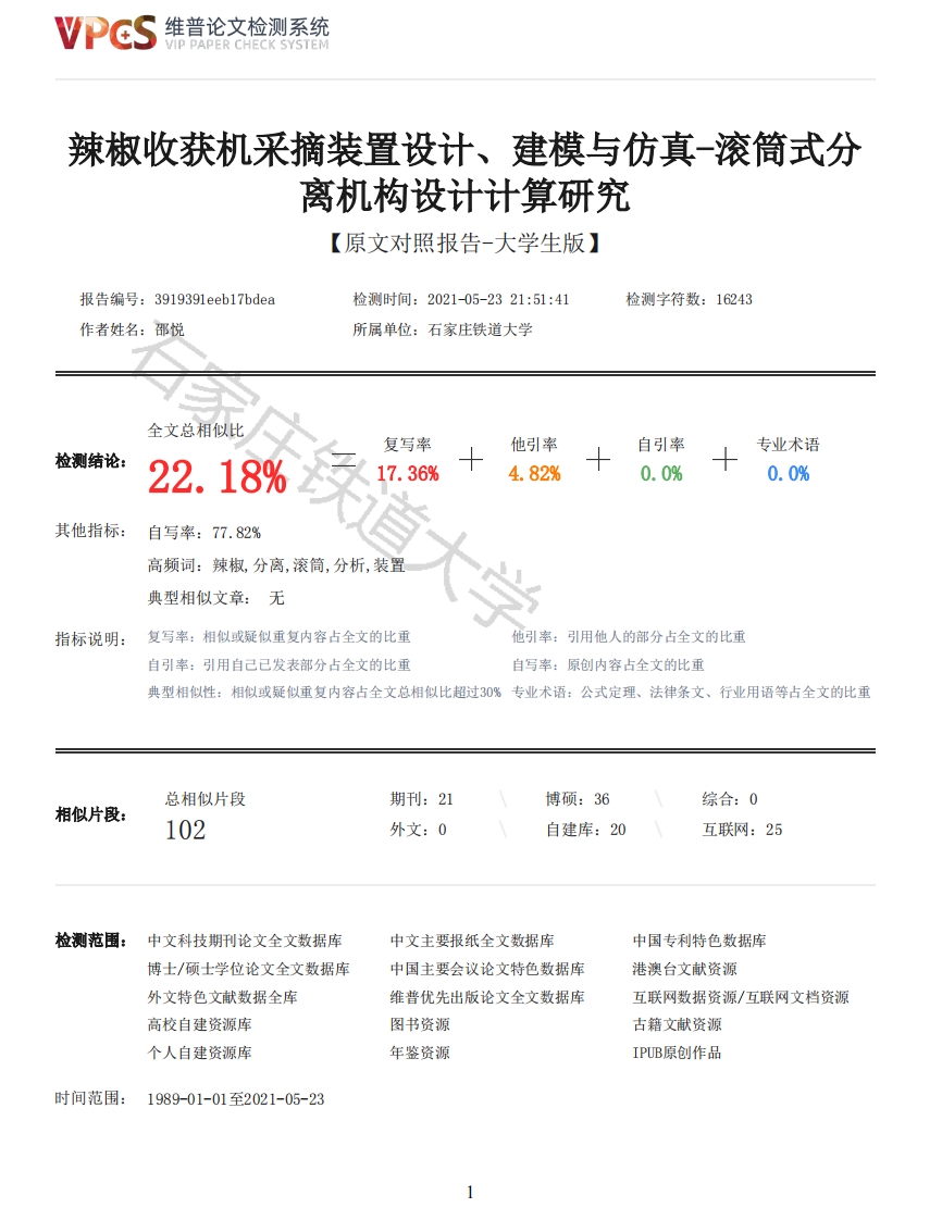 维普论文检测系统VIP PAPER CHECK SYSTEM辣椒收获机采摘装置设计、建模与仿真-滚筒式分离机构设计计算研究【原文对照报告-大学生版】报告编号:3919391eeb17bdea检测时间:2021-05-2321:51:41检测字符数:16243作者姓名:邵悦所属单位:石家庄铁道大学全文总相似比复写率他引率自引率专业术语检测结论:22.18%17.36%4.82%0.0%0.0%其他指标:自写率:77.82%高频词:辣椒,分离,滚筒,分析,装置典型相似文章:无大学指标说明:复写率:相似或疑似重复内容占全文的比重引率:引用他人的部分占全文的比重自引率:引用自己已发表部分占全文的比重自写率:原创内容占全文的比重典型相似性:相似或疑似重复内容占全文总相似比超过30%专业术语:公式定理、法律条文、行业用语等占全文的比重总相似片段期刊:21博硕:36综合:0相似片段:102外文:0自建库:20互联网:25检测范围:中文科技期刊论文全文数据库中文主要报纸全文数据库中国专利特色数据库博士/硕士学位论文全文数据库中国主要会议论文特色数据库港澳台文献资源外文特色文献数据全库维普优先出版论文全文数据库互联网数据资源/互联网文档资源高校自建资源库图书资源古籍文献资源个人自建资源库年鉴资源IPUB原创作品时间范围:1989-01-01至2021-05-23维普论文检测系统VIP PAPER CHECK SYSTEM原文对照颜色标注说明:■自写片段■复写片段(相似或疑似重复)口引用片段(引用)■专业术语(公式定理、法律条文、行业用语等)石家庄铁道大学毕业设计辣椒收获机采摘装置设计、建模与仿真一滚筒式分离机构设计计算研究2021届机械工程学院专业因材机械学号20170967学生姓名邵悦指导老师陈伟完成日期2021年5月20日摘要辣椒作为我国西部地区越来越受重视的农作物,辣椒收获机的研发与生产也越来越重要。而分离清选装置的工作性能的优劣直接影响了辣椒收获机的好坏。目前市面上有很多的分离装置可供选择,所以找到适合我国情况的分离装置尤为重要。本文介绍了国、内外辣椒收获机及其分离清选装置的历史和现状,并对本次研究的分离装置的分离原理进行了说明,参考过去辣椒收获机的整体尺寸,预先构思了分离装置的整体构成与尺寸,为辣椒分离装置的设计计算提供了参考范围。本文设计了滚筒式的分离清选装置,对该装置进行了总体及其零部件的设计,包括内螺旋输送器及其电动机的选取设计,滚筒及其电动机的选取设计,输送装置的机架、滚筒、链轮、链节的设计,并用Solidw0ks软件建立了辣椒收获机分离装置的三维模型。将分离机构的三维模型简化后,导入Ansys Workbench中进行模态分析和谐响应分析,得到变形图、响应图等,了解了分离机构在正常工作时并不会发生共振从而引起一些不好的效果。本设计全面地考虑了辣椒地特性,合理地设计了滚筒式分离机构和滚筒输送装置,通过分离装置地载荷分析验证了设计地正确性,这对辣椒收获机分离装置的开发和研制具有一定的意义。关键词:辣椒收获机:滚筒分离装置:滚筒输送装置:模态分析:谐响应分析AbstractAs a more and more important crop in western China,the research and development and productionof pepper harvester are becoming more and more important.The performance of the separation andseparation device directly affects the performance of the pepper harvester.At present,there are alot of separation devices available on the market,so it is particularly important to find theseparation device suitable for the situation of our country.Countries were introduced in this paper,the internal and external chili harvester andseparation of the history and present situation of cleaning device and the separation device of thepresent study shows that the separation principle of reference used pepper overall dimensions of theharvester,prefabricate the whole composition and size of the separation device,provides reference2维普论文检测系统VIP PAPER CHECK SYSTEMfor pepper separation device design calculation scope.Separation in this paper,the design of drumcleaning device,the device is the design of overall and parts,including the screw conveyor and theselection of the motor design,roller and the selection of the motor design and conveyer of theframe,the design of the roller,sprocket,chain link,and using Solidworks software established the3 d model of hot pepper harvester separation device.After the three-dimensional model of theseparation mechanism is simplified,it is imported into ANSYSWORKBENCH for modal analysis andharmonious response analysis,and the deformation diagram and response diagram are obtained.It isunderstood that the separation mechanism does not have resonance when it works normally,which willcause some bad effects.The design considers the characteristics of pepper comprehensively,and reasonably designs thecylinder separation mechanism and roller conveying device.The correctness of the design is verifiedthrough the analysis of the ground load of the separation device,which has a certain significancefor the development and development of the separation device of the pepper harvester.Key words:Pepper harvester;Drum separation device:Roller conveying device;Modal analysis;Harmonic response analysis目录第1章绪论11.1国内外研究现状11.1.1国内外辣椒收获机的研究现状11.1.2分离清选装置的现状11.2研究的目的及意义21.3主要研究内容和方法21.4研究方案及技术路线31.4.1研究方案3失道大学1.4.2技术路线31.5本章小结3第2章辣椒收获机整体系统工作原理研究42.1辣椒收获机的整体结构42.2滚筒分离机构的原理52.3本章小结5第3章滚筒分离机构参数设计63.1内螺旋输送机