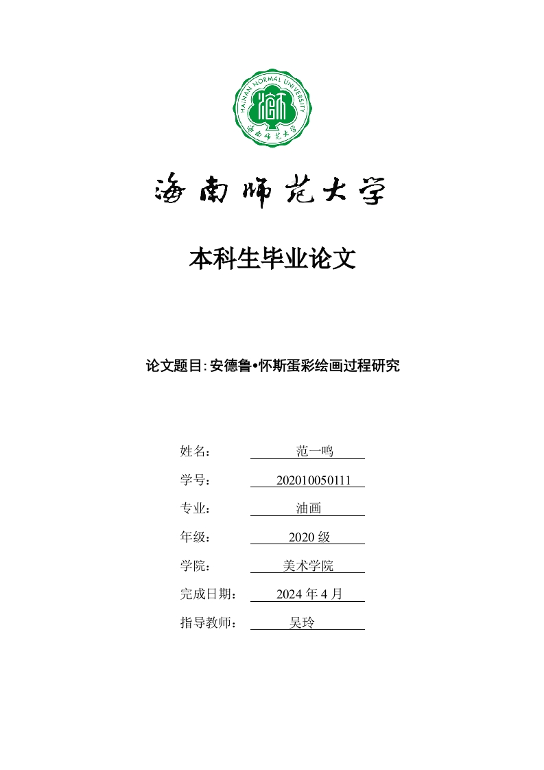 本科生毕业论文论文题目:安德鲁•怀斯蛋彩绘画过程研究姓名:范一鸣学号:202010050111油画年级:2020级学院:美术学院完成日期:2024年4月指导教师:吴玲本科生毕业论文独创性声明本人声明所呈交的毕业论文是本人在导师指导下进行的研究工作及取得的研究成果,除了文中特别加以标注和致谢的地方外,本论文中没有抄袭他人研究成果和伪造数据等行为。与我一同工作的同志对本研究所做的任何贡献均已在论文中作了明确的说明并表示谢意。论文作者签名:日期:20年月日本科生毕业论文使用授权声明海南师范大学有权保留并向国家有关部门或机构送交毕业论文的复印件和磁盘,允许毕业论文被查阅和借阅。本人授权海南师范大学可以将本毕业论文的全部或部分内容编入有关数据库进行检索,可以采用影印、缩印或其他复印手段保存、汇编毕业论文。论文作者签名:日期:20年月日指导教师签名:日期:20年月日目录一、绪论.2研究的缘起…(二)研究怀安德鲁·斯蛋彩画的目的与意义二、蛋彩画的艺术特点(一)蛋彩画的历史与发展2(二)蛋彩画的材料与技法三、安德鲁·怀斯蛋彩画的过程与研究…安德鲁·怀斯的起稿与构图方式(二)安德鲁·怀斯的色彩研究.…四、安德鲁·怀斯对我创作的影响.7安德鲁·怀斯绘画语言对我的启示..7(二)毕业作品创作的过程…参考文献.10
