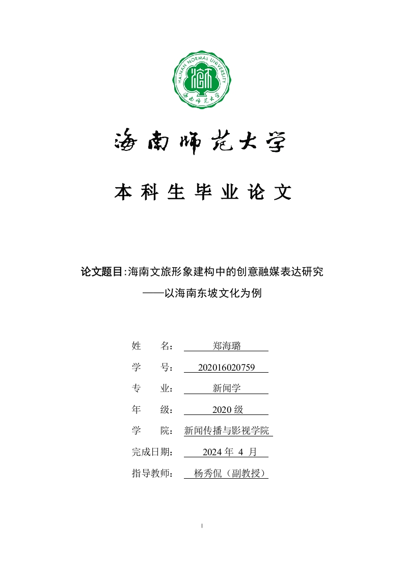 本科生毕业论文论文题目:海南文旅形象建构中的创意融媒表达研究以海南东坡文化为例姓名:郑海璐学号:202016020759专新闻学年级:2020级学院:新闻传播与影视学院完成日期:2024年4月指导教师:杨秀侃(副教授)本科生毕业论文(设计)独创性声明本人声明所呈交的毕业论文(设计)是本人在导师指导下进行的研究工作及取得的研究成果,除了文中特别加以标注和致谢的地方外,本论文中没有抄袭他人研究成果和伪造数据等行为。与我一同工作的同志对本研究所做的任何贡献均已在论文中作了明确的说明并表示谢意。论文作者签名:日期:20年月本科生毕业论文(设计)使用授权声明海南师范大学有权保留并向国家有关部门或机构送交毕业论文(设计)的复印件和磁盘,允许毕业论文(设计)被查阅和借阅。本人授权海南师范大学可以将本毕业论文(设计)的全部或部分内容编入有关数据库进行检索,可以采用影印、缩印或其他复印手段保存、汇编毕业论文(设计)。论文作者签名:日期:20年月日指导教师签名:日期:20年月日海南文旅形象建构中的创意融媒表达研究一一以海南东坡文化为例作者:郑海璐指导教师:杨秀侃副教授(海南师范大学新闻传播与影视学院,海口,571127)摘要:近年来,文化和旅游的跨界发展,特别是一些爆款的文旅活动,给地方经济带来热度和流量。这种正面的、积极的文旅活动,经过各种媒体的传播,建构了一个地方的文旅形象。把东坡文化作为海南文旅融合发展四大招牌之一,是海南省委省政府的重要决策,也是全省上下的共识。如何通过融媒的方式对东坡文化进行创意表达,是建构海南文旅形象的关键,也是海南省内各家媒体的职责和重任所在。本文以首届东坡文旅大会各家媒体创作的融媒体作品为研究对象,采用内容分析法和案例分析法,从内容、形式、传播三个维度对融媒体作品进行分析。研究发现,这些作品中融入的东坡文化精神是助力海南文旅形象构建和发展的重要精神内涵,也是探析媒体如何做好地方文化传播的重要资源。结合作品分析,本人提出提升文旅形象的建议,用更多的新闻创意作品丰富海南文旅形象的内涵。关键词:融媒体作品、海南文旅形象、东坡文化、创意表达研究
