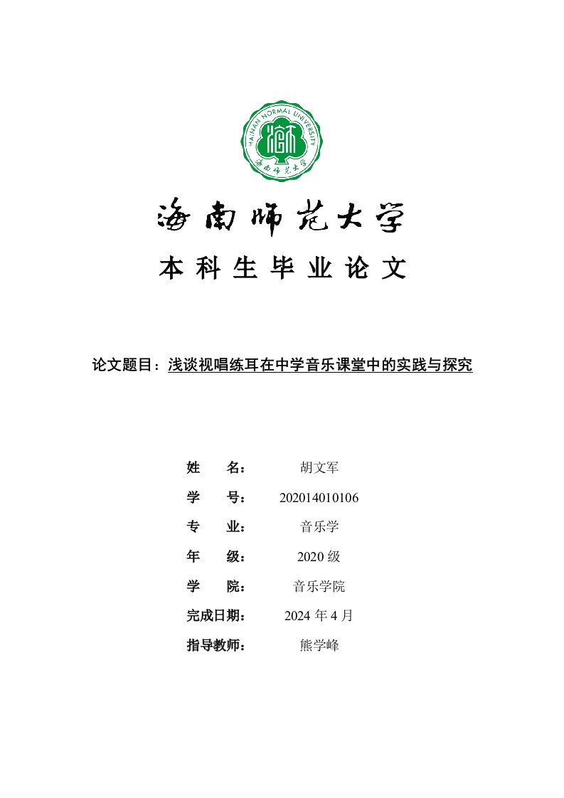 本科生毕业论文论文题目:浅谈视唱练耳在中学音乐课堂中的实践与探究姓名:胡文军学号:202014010106专音乐学年级:2020级学院:音乐学院完成日期:2024年4月指导教师:熊学峰本科生毕业论文独创性声明本人声明所呈交的毕业论文是本人在导师指导下进行的研究工作及取得的研究成果,除了文中特别加以标注和致谢的地方外,本论文中没有抄袭他人研究成果和伪造数据等行为。与我一同工作的同志对本研究所做的任何贡献均已在论文中作了明确的说明并表示谢意。论文作者签名:日期:年月日本科生毕业论文使用授权声明海南师范大学有权保留并向国家有关部门或机构送交毕业论文的复印件和磁盘,允许毕业论文被查阅和借阅。本人授权海南师范大学可以将本毕业论文的全部或部分内容编入有关数据库进行检索,可以采用影印、缩印或其他复印手段保存、汇编毕业论文。论文作者签名:日期:年月日指导教师签名:日期:年月日目录1(一)研究背景....2(三)当今研究现状..2(一)视唱练耳的定义..4(二)视唱练耳的历史沿革.…(三)5三、视唱练耳在中学音乐课堂中的实践.…5..56四、视唱练耳在中学音乐课堂中的探究.....6789