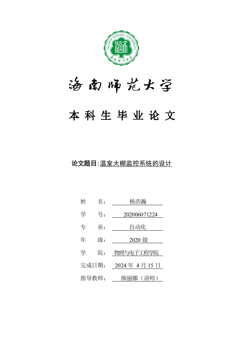 本科生毕业论文论文题目:温室大棚监控系统的设计姓名:杨浩瀚学号:202006071224专业:自动化年级:2020级学院:物理与电子工程学院完成日期:2024年4月15日指导教师:颜丽娜(讲师)本科生毕业论文独创性声明本人声明所呈交的毕业论文是本人在导师指导下进行的研究工作及取得的研究成果,除了文中特别加以标注和致谢的地方外,本论文中没有抄袭他人研究成果和伪造数据等行为。与我一同工作的同志对本研究所做的任何贡献均已在论文中作了明确的说明并表示谢意。论文作者签名:日期:20年月日本科生毕业论文使用授权声明海南师范大学有权保留并向国家有关部门或机构送交毕业论文的复印件和磁盘,允许毕业论文被查阅和借阅。本人授权海南师范大学可以将本毕业论文的全部或部分内容编入有关数据库进行检索,可以采用影印、缩印或其他复印手段保存、汇编毕业论文。论文作者签名:日期:20年月日指导教师签名:日期:20年月日目录1引言1.1温室大棚监控系统的背景和意义.…·1.2.1国外研究现状...21.2.2国内研究现状..22温室大棚监控系统的设计.+...32.1系统的设计方案.3443温室大棚监控系统硬件设计.··4453.3STM32F103C8T6单片机最小系统..663.4.2SGP30空气质量模块电路连接.·