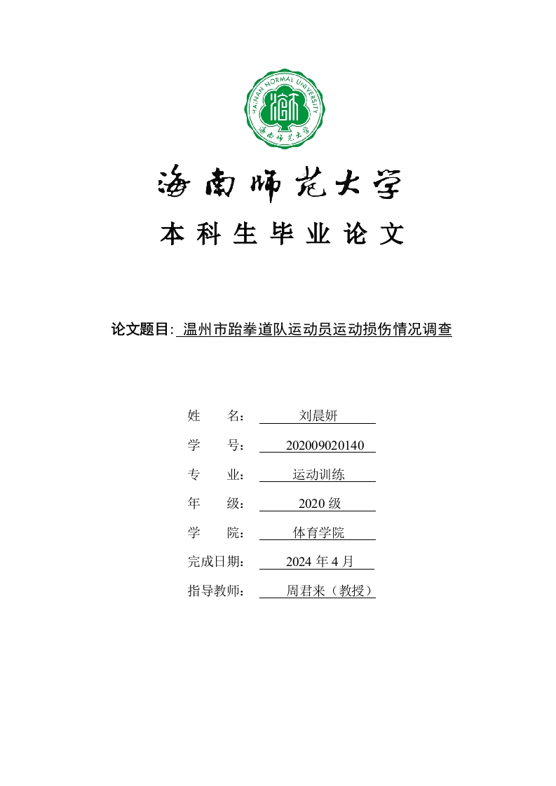 本科生毕业论文论文题目:温州市跆拳道队运动员运动损伤情况调查姓名:刘晨妍学号:202009020140专运动训练年2020级学院:体育学院完成日期:2024年4月指导教师:周君来(教授)本科生毕业论文独创性声明本人声明所呈交的毕业论文是本人在导师指导下进行的研究工作及取得的研究成果,除了文中特别加以标注和致谢的地方外,本论文中设没有抄袭他人研究成果和伪造数据等行为。与我一同工作的同志对本研究所做的任何贡献均已在论文中作了明确的说明并表示谢意。论文作者签名:日期:20年月日本科生毕业论文使用授权声明大学有权保留并向国家有关部门或机构送交毕业论文的复印件和磁盘,允许毕业论文被查阅和借阅。本人授权可以将本毕业论文的全部或部分内容编入有关数据库进行检索,可以采用影印、缩印或其他复印手段保存、汇编毕业论文。论文作者签名:日期:20年月日指导教师签名:日期:20年月日目录1.1选题依据…11.2文献综述11.2.1关于我国竞技跆拳道的发展…11.2.2关于运动损伤的研究..…11.2.3关于跆拳道运动员的损伤有哪些:2研究对象与方法…2.1研究对象2.2研究方法2.2.1文献资料法.32.2.2问卷调查法32.2.3数理统计法.33研究结果与分析.33.1温州市跆拳道队运动员运动损伤情况.33.2温州市跆拳道队运动员运动损伤频数.3.3温州市跆拳道队运动员运动损伤程度3.4温州市跆拳道队运动员损伤部位3.5温州市跆拳道队运动员损伤类型3.6温州市跆拳道队运动员损伤成因4结论与建议..84.1结论