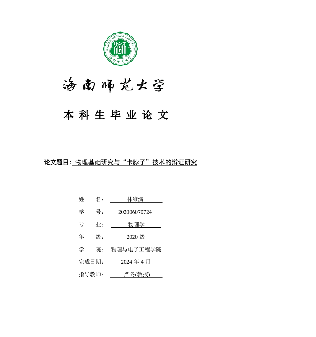 本科生毕业论文论文题目:物理基础研究与“卡脖子”技术的辩证研究姓名:林维演学202006070724专业:物理学年2020级学院:物理与电子工程学院完成日期:2024年4月指导教师:严冬(教授)本科生毕业论文独创性声明本人声明所呈交的毕业论文是本人在导师指导下进行的研究工作及取得的研究成果,除了文中特别加以标注和致谢的地方外,本论文中没有抄袭他人研究成果和伪造数据等行为。与我一同工作的同志对本研究所做的任何贡献均已在论文中作了明确的说明并表示谢意。论文作者签名:日期:20年月日本科生毕业论文使用授权声明海南师范大学有权保留并向国家有关部门或机构送交毕业论文的复印件和磁盘,允许毕业论文被查阅和借阅。本人授权海南师范大学可以将本毕业论文的全部或部分内容编入有关数据库进行检索,可以采用影印、缩印或其他复印手段保存、汇编毕业论文。论文作者签名:日期:20年月日指导教师签名:日期:20年月日目录22.学术界研究现状.·22.1.国内研究现状...22.2.国外研究现状...23.1.探索自然规律:23.2.推动技术进步:4.什么是卡脖子技术....35.1.从历史原因来看....35.2.从社会发展上看...45.3.从人们的思想观念上看....5556.4.科技成果转化方面..·7.我国该如何加强基础物理的研究...67.1.增加基础物理研究的投资: