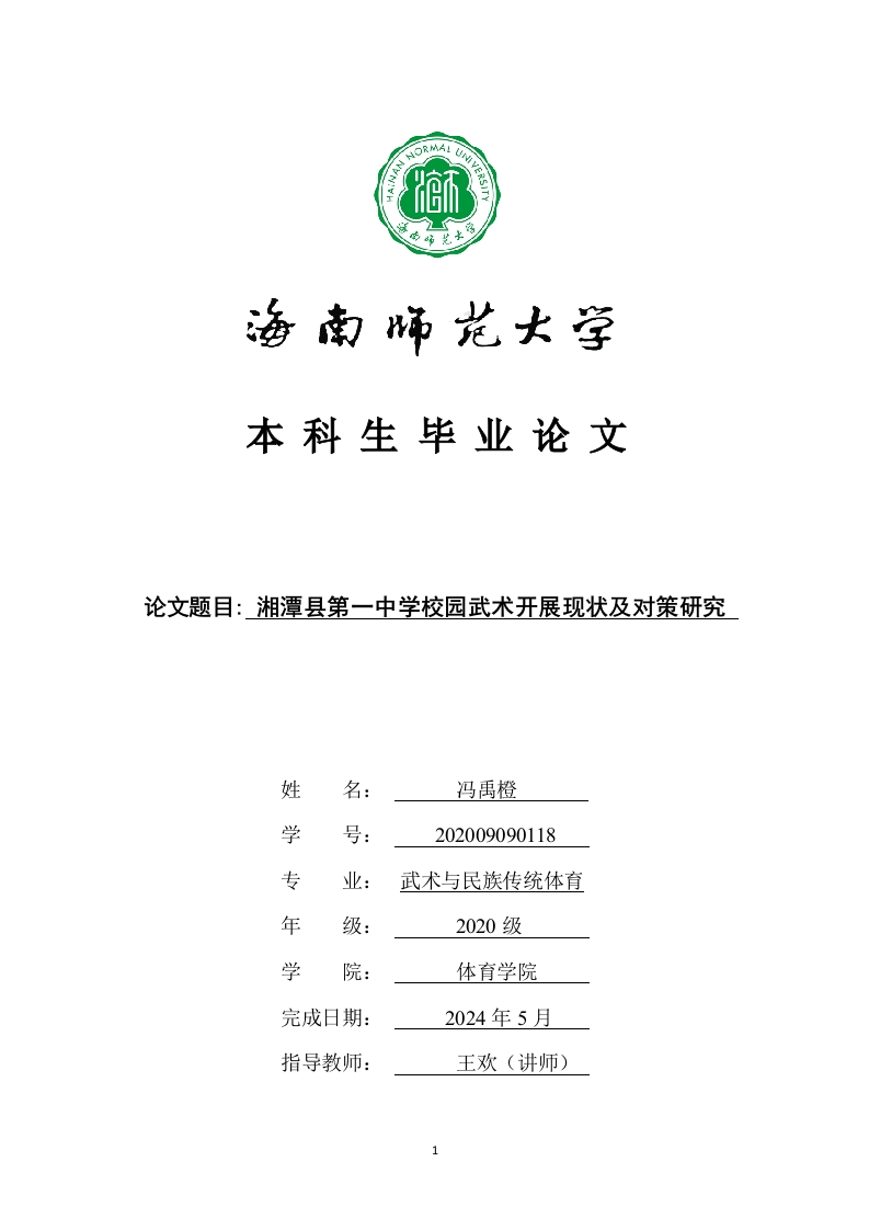 本科生毕业论文论文题目:湘潭县第一中学校园武术开展现状及对策研究姓名:冯禹橙学号:202009090118专业:武术与民族传统体育年2020级学体育学院完成日期:2024年5月指导教师:王欢(讲师)本科生毕业论文独创性声明本人声明所呈交的毕业论文是本人在导师指导下进行的研究工作及取得的研究成果,除了文中特别加以标注和致谢的地方外,本论文中没有抄袭他人研究成果和伪造数据等行为。与我一同工作的同志对本研究所做的任何贡献均已在论文中作了明确的说明并表示谢意。论文作者签名:日期:20年月日本科生毕业论文使用授权声明海南师范大学有权保留并向国家有关部门或机构送交毕业论文的复印件和磁盘,允许毕业论文被查阅和借阅。本人授权海南师范大学可以将本毕业论文的全部或部分内容编入有关数据库进行检索,可以采用影印、缩印或其他复印手段保存、汇编毕业论文。论文作者签名:日期:20年月日指导教师签名:日期:20年月日目录61.1研究目的...66..62.1研究对象62.2研究方法2.2.1文献资料法.2.2.2问卷调查法..72.2.3实地调查法..72.2.4对比分析法...·783.1湘潭县第一中学“校园武术”开展背景......83.2.1湘潭县第一中学“校园武术”的武术教学设施现状.93.2.2湘潭县第一中学“校园武术”活动教学现状...93.2.3湘潭市湘潭县第一中学“校园武术”的师资现状.·113.2.5“校园武术”的开展中武术健身操与武术套路对学生的影响.143