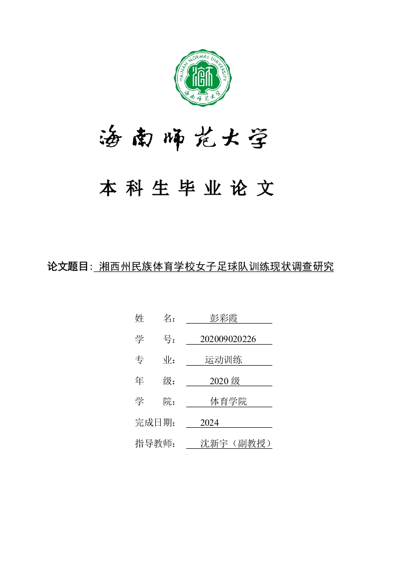 本科生毕业论文论文题目:湘西州民族体育学校女子足球队训练现状调查研究姓名:彭彩霞学号:202009020226专业:运动训练年级:2020级学院:体育学院完成日期:2024指导教师:沈新宇(副教授)本科生毕业论文独创性声明本人声明所呈交的毕业论文是本人在导师指导下进行的研究工作及取得的研究成果,除了文中特别加以标注和致谢的地方外,本论文中没有抄袭他人研究成果和伪造数据等行为。与我一同工作的同志对本研究所做的任何贡献均已在论文中作了明确的说明并表示谢意。论文作者签名:日期:24年月日本科生毕业论文使用授权声明海南师范大学有权保留并向国家有关部门或机构送交毕业论文的复印件和磁盘,允许毕业论文被查阅和借阅。本人授权海南师范大学可以将本毕业论文的全部或部分内容编入有关数据库进行检索,可以采用影印、缩印或其他复印手段保存、汇编毕业论文。论文作者签名:日期:24年月日指导教师签名:日期:年月日目录2研究对象与方法22.1研究对象2.2研究方法2.4.1文献资料法22.2.2问卷调查法…22.2.3访谈法2.2.4数理统计法33.1湘西州民族体育学校女子足球队的基本情况分析33.1.1足球队教练情况3.1.2足球队队员情况3.2湘西州民族体育学校女子足球队训练场地器材分析63.2.1足球场地设施.…63.2.2足球训练器材63.2.3辅助训练设备63.3湘西州民族体育学校女子足球队训练方案分析63.3.1足球队训练规划与执行63.3.2足球队训练频次与时间..3.3.3足球队训练内容与占比3.3.4足球队训练方法与手段3.3.5足球队训练负荷与强度.…13.3.6足球队训练考核与管理3.3.7足球队训练及恢复手段P4结论与建议94.2建议10.10致谢11附录