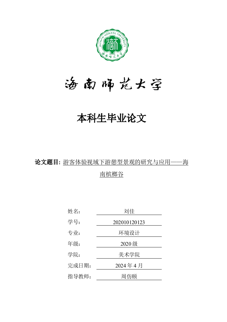 本科生毕业论文论文题目:游客体验视域下游憩型景观的研究与应用一海南槟榔谷姓名:刘佳学号:202010120123环境设计年级:2020级美术学院完成日期:2024年4月指导教师:周仿颐本科生毕业论文独创性声明本人声明所呈交的毕业论文是本人在导师指导下进行的研究工作及取得的研究成果,除了文中特别加以标注和致谢的地方外,本论文中没有抄袭他人研究成果和伪造数据等行为。与我一同工作的同志对本研究所做的任何贡献均已在论文中作了明确的说明并表示谢意。论文作者签名:日期:20年月日本科生毕业论文使用授权声明海南师范大学有权保留并向国家有关部门或机构送交毕业论文的复印件和磁盘,允许毕业论文被查阅和借阅。本人授权海南师范大学可以将本毕业论文的全部或部分内容编入有关数据库进行检索,可以采用影印、缩印或其他复印手段保存、汇编毕业论文。论文作者签名:日期:20年月日指导教师签名:日期:20年月日目录一、研究背景与研究意义…3(一)研究背景…(二)文献综述(三)研究意义6二、槟榔谷景观文化资源调研.(一)槟榔谷自然景观资源(二)槟榔谷文化景观资源三、槟榔谷游客行为与体验特征(一)游客消费行为特征>(二)游客情感体验特征8(三)游客体验诉求四、基于游客体验的槟榔谷景观设计99(二)设计策略.…101111五、结论131314