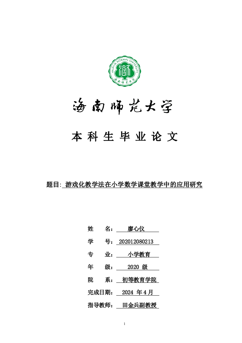 本科生毕业论文题目:游戏化教学法在小学数学课堂教学中的应用研究姓名:廖心仪学号:202012080213专业小学教育年级:2020级院初等教育学院完成日期:2024年4月指导教师:田金兵副教授本科生毕业论文(设计)独创性声明本人声明所呈交的毕业论文(设计)是本人在导师指导下进行的研究工作及取得的研究成果,除了文中特别加以标注和致谢的地方外,本论文中没有抄袭他人研究成果和伪造数据等行为。与我一同工作的同志对本研究所做的任何贡献均已在论文中作了明确的说明并表示谢意。论文(设计)作者签名:廖心仪日期:2024年4月5日本科生毕业论文(设计)使用授权声明海南师范大学有权保留并向国家有关部门或机构送交毕业论文(设计)的复印件和磁盘,允许毕业论文(设计)被查阅和借阅。本人授权海南师范大学可以将本毕业论文(设计)的全部或部分内容编入有关数据库进行检索,可以采用影印、缩印或其他复印手段保存、汇编毕业论文(设计)。论文(设计)作者签名:廖心仪日期:2024年4月5日指导教师签名:日期:2游戏化教学法在小学数学课堂教学中的应用研究作者:廖心仪指导教师:田金兵副教授(海南师范大学初等教育学院,海南海口,571158)摘要:相较于传统的教学方式,游戏化的教学方法以其独特的创意和趣味性,更能点燃学生的学习热情。本文的主要研究内容是深入研究在小学数学教学中,如何通过实际操作实现游戏化教学的情境构建与反思引导,旨在激发学生的学习兴趣、巩固基础学科知识、更好地融入课堂学习、丰富空间想象力、培养逻辑思维与创新能力,并全面提升学生的综合素养,使他们能在学习的过程中感受到乐趣,从而进一步激发对数学学科的热爱,最终提升课堂的教学质量。通过本研究,我们期望能为游戏教学法在小学数学教学中的实际应用提供理论与实践层面的有益参考。关键词:游戏化教学;游戏:数学:课堂教学Application of gamification teaching method inprimary school mathematics classroom teachingAuthor:Liao xinyi Supervisor:Associate professor Tian jinbing(College of Elementary Education,Hainan Normal University,Haikou,Hainan,571158)Abstract:Compared to traditional teaching methods,gamified teaching methods,with their unique creativity and fun,can better ignite students'leaming enthusiasm.The main research content of this article is to deeply study how to construct and reflect on the guidance of gamified teaching through practical operations in primary school mathematics teaching,aiming to stimulate students'leaming interest,consolidate basic subject knowledge,better integrate into classroom leaming,enrich spatial imagination,cultivate logical thinking and innovation ability,and comprehensively improve students'comprehensive literacy,so that they can feel fun in the leaming process,further stimulate their love for mathematics,and ultimately improve the quality of classroom teaching.Through this study,we hope to provideuseful theoretical and practical references for the practical application of game based teaching methods in primary school mathematics teaching.Key words:Gamification teaching;Game;Mathematics;Classroom teaching3