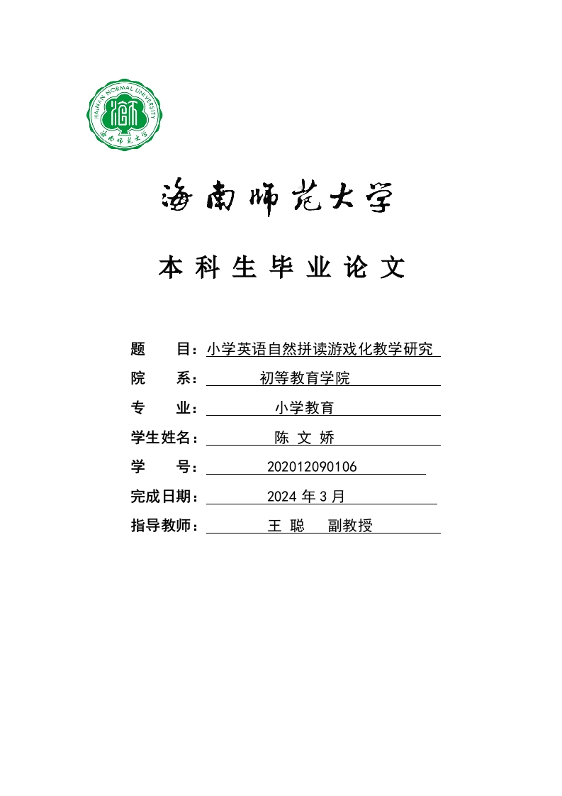 本科生毕业论文题目:小学英语自然拼读游戏化教学研究院初等教育学院专业:小学教育学生姓名:陈文娇学号:202012090106完成日期:2024年3月指导教师:王聪副教授本科生毕业论文(设计)独创性声明本人声明所呈交的毕业论文(设计)是本人在导师指导下进行的研究工作及取得的研究成果,除了文中特别加以标注和致谢的地方外,本论文中没有抄袭他人研究成果和伪造数据等行为。与我一同工作的同志对本研究所做的任何贡献均已在论文中作了明确的说明并表示谢意。论文(设计)作者签名:日期:本科生毕业论文(设计)使用授权声明海南师范大学有权保留并向国家有关部门或机构送交毕业论文(设计)的复印件和磁盘,允许毕业论文(设计)被查阅和借阅。本人授权海南师范大学可以将本毕业论文(设计)的全部或部分内容编入有关数据库进行检索,可以采用影印、缩印或其他复印手段保存、汇编毕业论文(设计)。论文(设计)作者签名:日期:指导教师签名:日期:小学英语自然拼读游戏化教学研究作者:陈文娇指导教师:王聪副教授(海南师范大学初等教育学院,海南海口,120921)摘要:英语作为全球使用最广泛的语言之一,学好英语至关重要。小学英语新课标要求,在英语阅读学习方面,要注重和发展学生的阅读能力,提高学生的阅读素养。在语音方面,学生要掌握字母读音,了解单词重音,懂得正确的发音,并且让学生在交际中学习语音语调。而自然拼读是提高学生语音和词汇学习效率有效的方法,许多学者和老师尝试将自然拼读教学融入到小学英语教学中,本研究将坚持以儿童为中心的理念,将游戏化元素融入到自然拼读的教学过程,开展小学英语自然拼读游戏化教学活动设计研究,并将设计方案进行实施,采用课堂观察和访谈法等研究方法,对教学设计实施过程进行反思,期待对小学英语教师开展自然拼读教学提供参考新思路和建议。关键词:小学英语自然拼读;游戏化教学活动:Research on gamification teaching of primary EnglishphonicsAuthor:Wenjiao Chen Instructor:Associate Professor Wang Cong(College of Primary Education,Hainan Normal University,Haikou,Hainan 120921,China)Abstract:As one of the most widely used languages in the world,it is very important to learn English well.Thenew English cumiculum standard of primary school requires that students should pay attention to and developtheir reading ability and improve their reading quality in English reading learning.The new English curriculumstandard for primary school requires students to master the pronunciation of letters,understand the stress of words,understand the correct pronunciation,and let students learn pronunciation and intonation in communication.Phonics is an effective way to improve students'phonetic and vocabulary learning efficiency.Many scholars andteachers try to integrate phonics teaching into primary school English teaching.This study will adhere to thechild-centered concept,integrate gamification elements into the teaching process of phonics,carry out research onthe design of gamification teaching activities for primary school English phonics,and implement the design plan.This paper uses classroom observation,interview and other research methods to reflect on the implementationprocess of teaching design,and hopes to provide new ideas and suggestions for primary school English teachers tocarry out phonics teaching.Key words:primary school English phonics;gamified teaching activities;