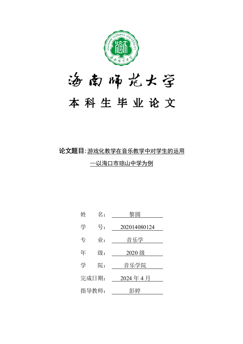 本科生毕业论文论文题目:游戏化教学在音乐教学中对学生的运用一以海口市琼山中学为例姓名:黎圆学号:202014080124专业:音乐学年级:2020级学院:音乐学院完成日期:2024年4月指导教师:彭婷本科生毕业论文独创性声明本人声明所呈交的毕业论文是本人在导师指导下进行的研究工作及取得的研究成果,除了文中特别加以标注和致谢的地方外,本论文中没有抄袭他人研究成果和伪造数据等行为。与我一同工作的同志对本研究所做的任何贡献均已在论文中作了明确的说明并表示谢意。论文作者签名:日期:20年月日本科生毕业论文使用授权声明海南师范大学有权保留并向国家有关部门或机构送交毕业论文的复印件和磁盘,允许毕业论文被查阅和借阅。本人授权海南师范大学可以将本毕业论文的全部或部分内容编入有关数据库进行检索,可以采用影印、缩印或其他复印手段保存、汇编毕业论文。论文作者签名:日期:20年月日指导教师签名:日期:20年月日目录一、游戏化教学理论2(一)游戏化教学的理论基础…2(二)音乐教学中的游戏化教学方法2(三)游戏化教学对学生学习音乐的影响3二、游戏化教学在音乐教学中的实例运用.…(一)音乐理论知识的游戏化教学实例(二)音乐创作技巧的游戏化教学实例(三)音乐演奏技巧的游戏化教学实例三、实验研究…8(一)实验设计和方法…(二)数据收集与处理…(三)实验结果与分析.…10四、游戏化教学对学生的影响10(一)对学生学习兴趣的影响(二)对学生音乐技能的影响11(三)对学生创新能力的影响11五、结论(一)研究成果总结12(二)研究的局限性12(三)未来研究方向附录…
